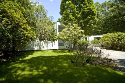 At the end of a very private cul-de-sac, this masterful modern is located on almost two acres of beautiful land in one of the most desirable areas just outside the village. Crisp, clean lines and a simply elegant design provide enchanting living spaces, including a light-filled living room with soaring ceiling, stone fireplace, and extensive glass windows and doors, a well-equipped kitchen, three bedrooms and 2.5 baths. A large sun deck embrac