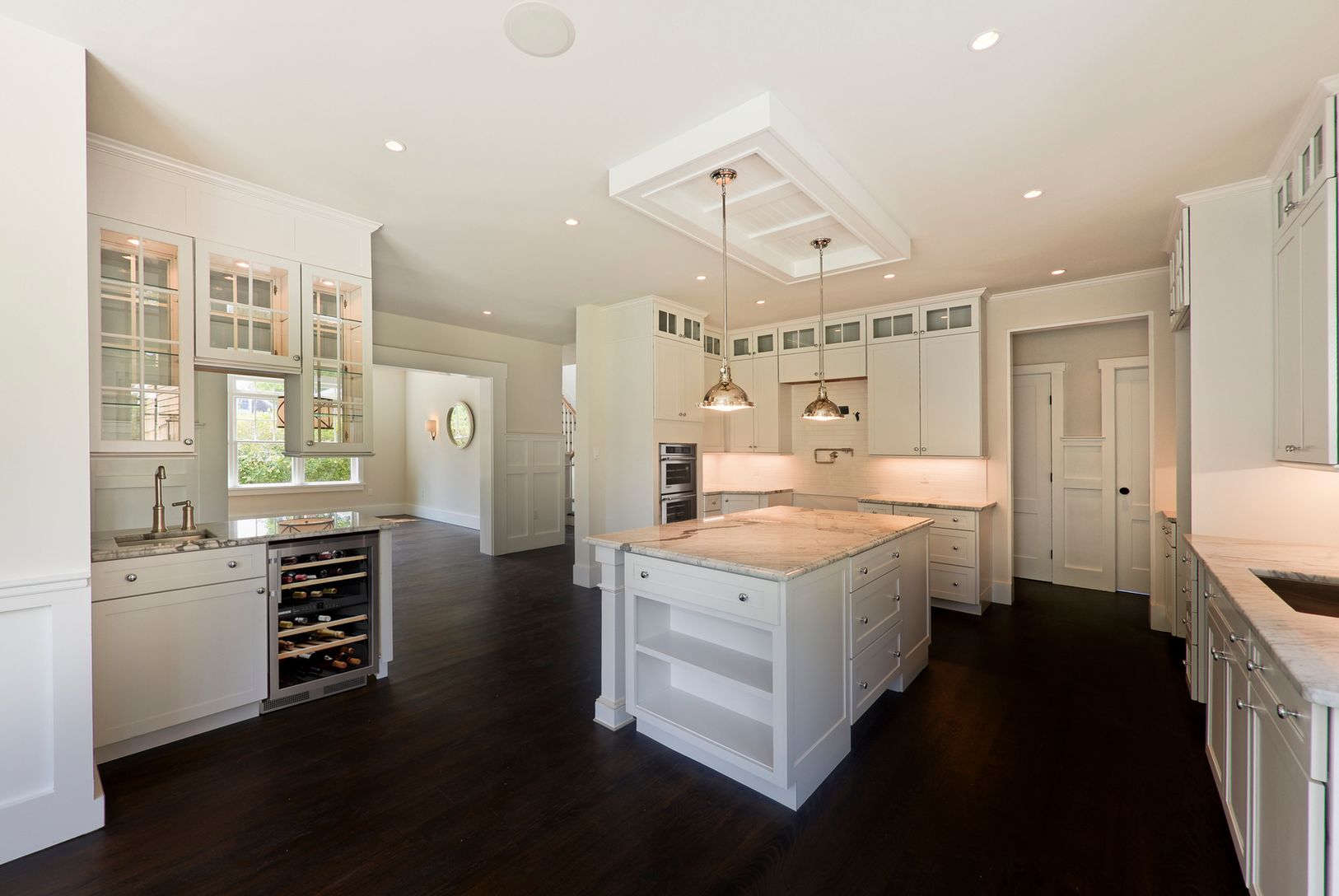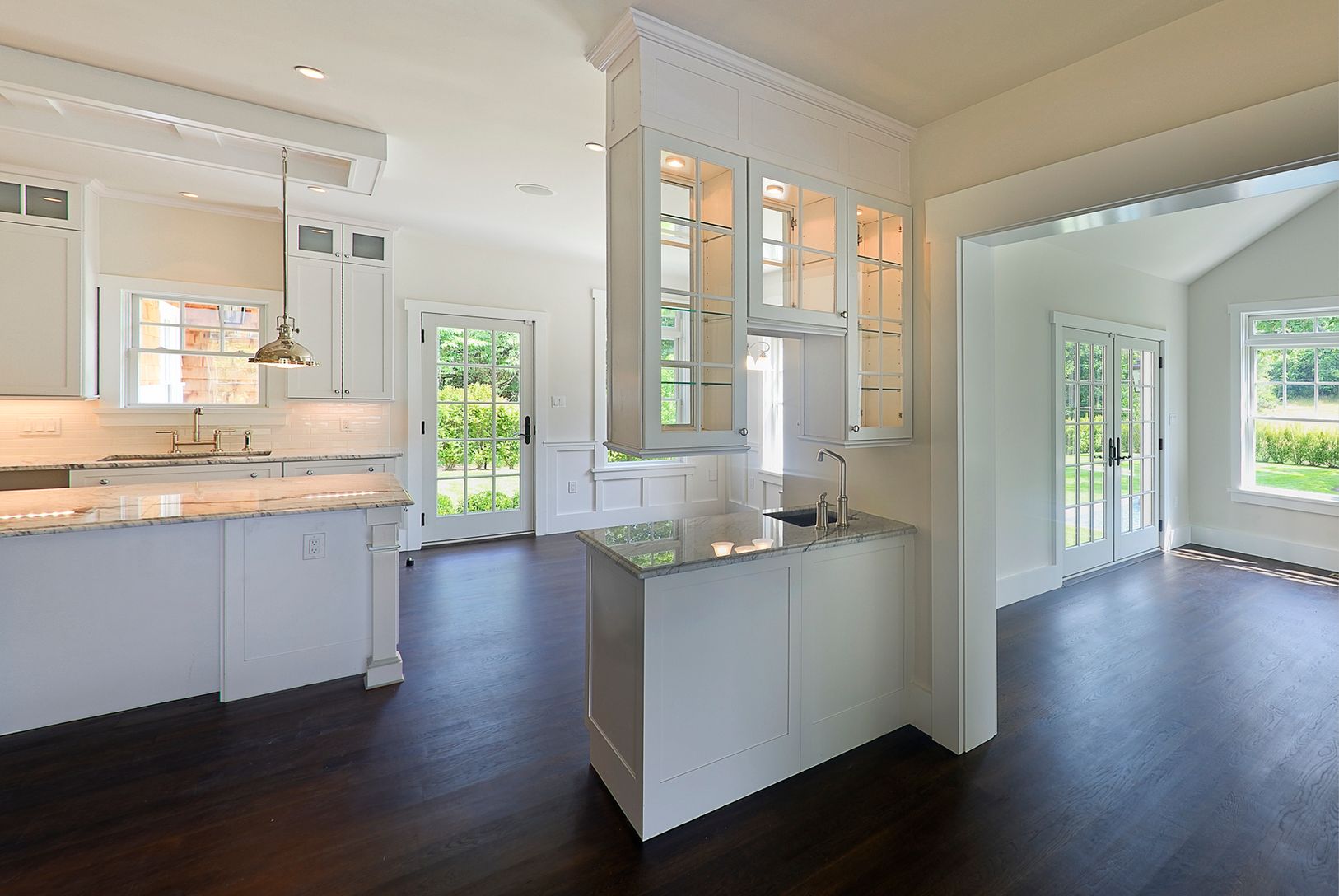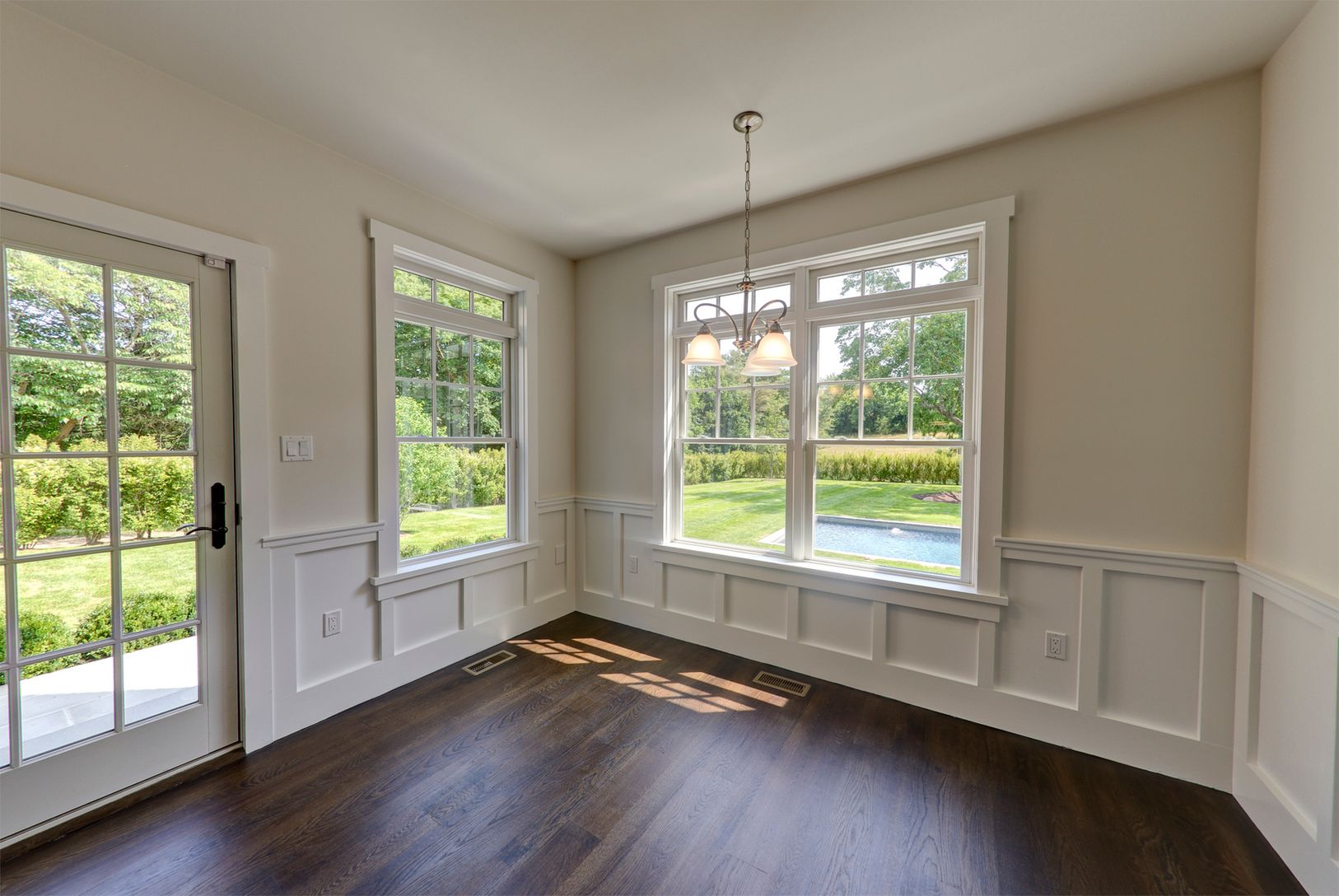 stainless-steel chef's kitchen with work island and breakfast nook overlooking
