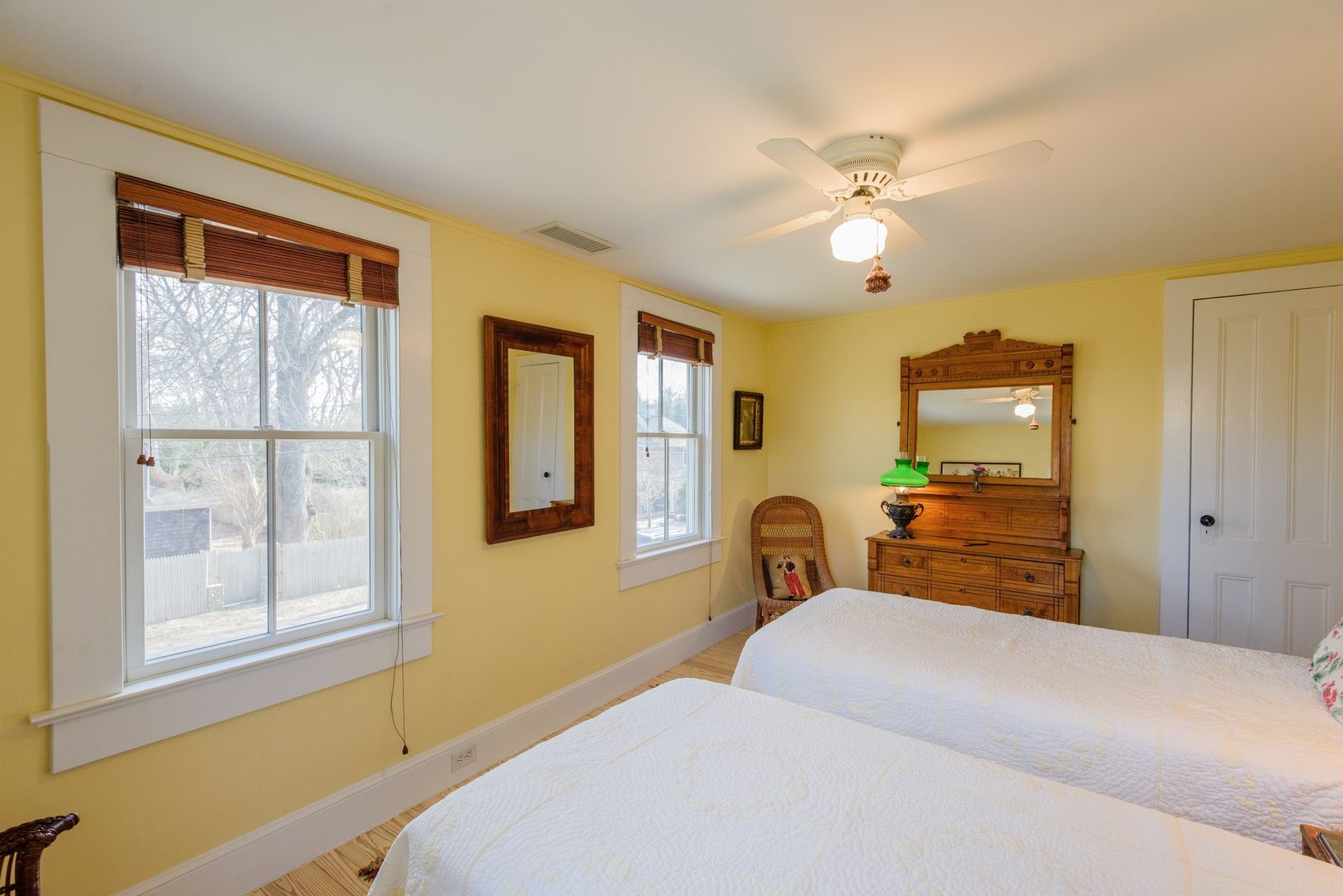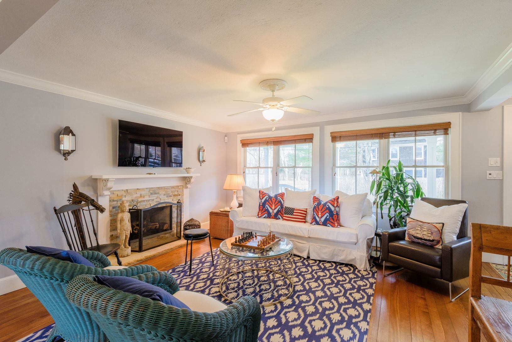 Located on one of the loveliest village streets, this charming and beautifully renovated home is surrounded by fully established privet hedges, mature trees, and gardens. Enter the house from the wide covered front porch and into a comfortable living room with stone gas fireplace. There is an adjacent dining room and a sunny contemporary kitchen with stainless steel appliances and a center island. Step down through pretty arched doorways off t