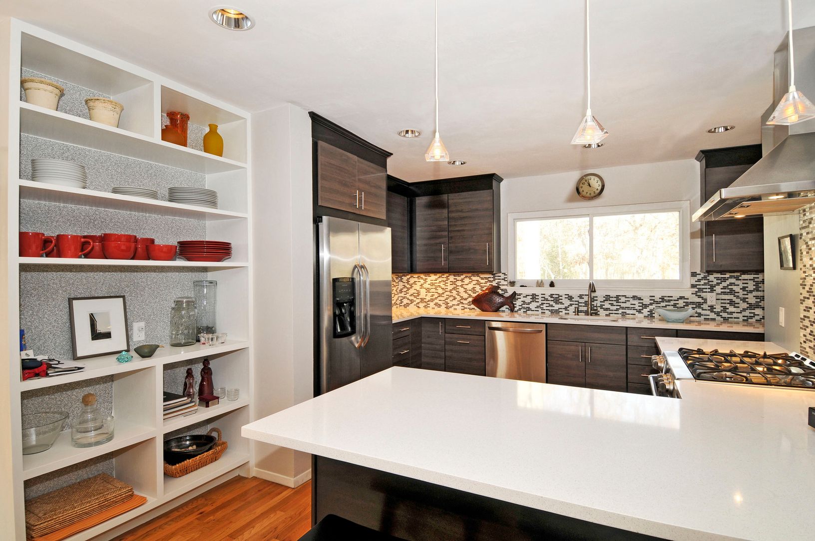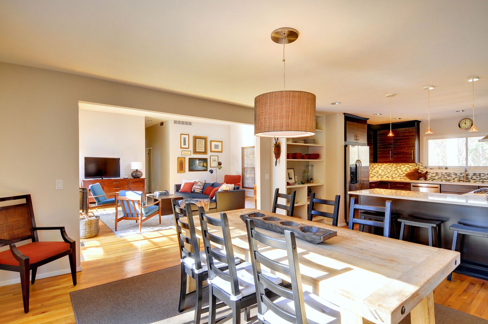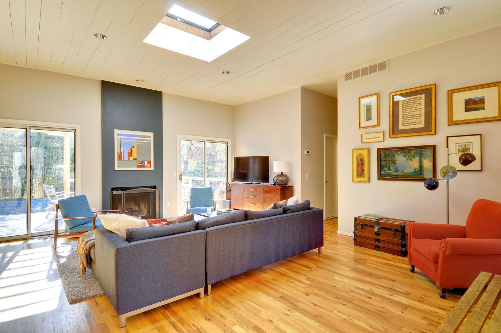 This stylish 3 bedroom and 2 bathroom Mid Century Modern has been totally renovated by a professional designer. Crisp paint colors and wonderful use of materials make this a special property. The all stainless kitchen is stylish and opens to the dining area. The living room has a wood burning fireplace and two sets of sliders leading to a deck with outdoor dining that leads to the heated pool. The grounds have been tastefully landscaped an
