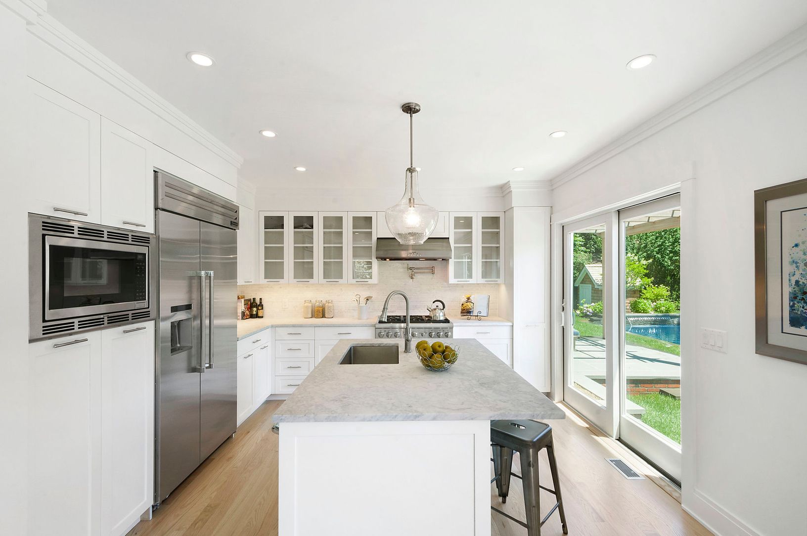 SOLD. This beautiful new construction in East Hampton Village offers the rare opportunity to be in a brand new home, on a quiet street and just a stone's throw away from the heart of East Hampton. A classic covered front porch welcomes you in to the double height foyer. To your left is your Master Suite with double sliding glass doors opening to its own pergola covered bluestone patio. To your right of the foyer is the open main living space,