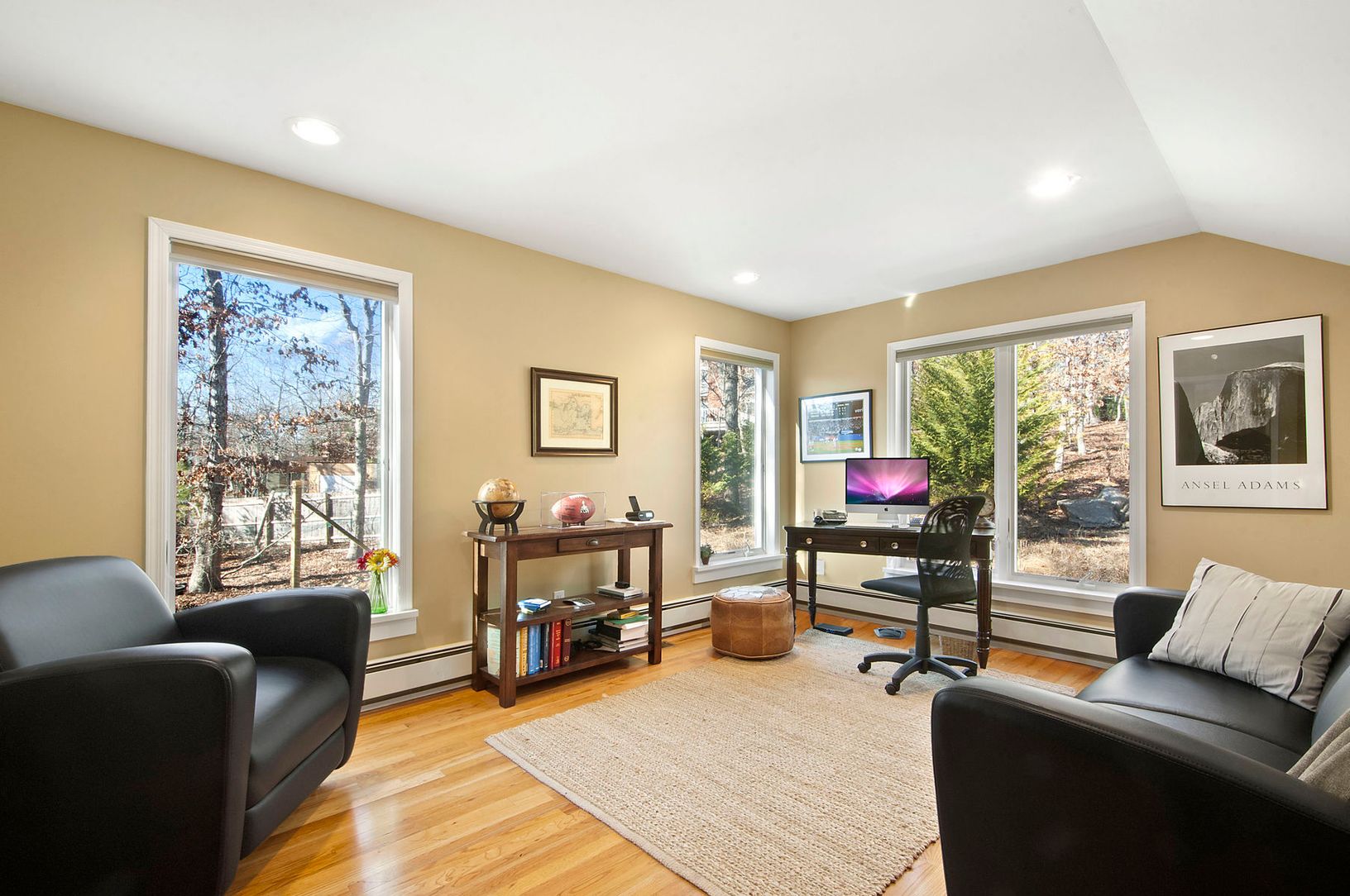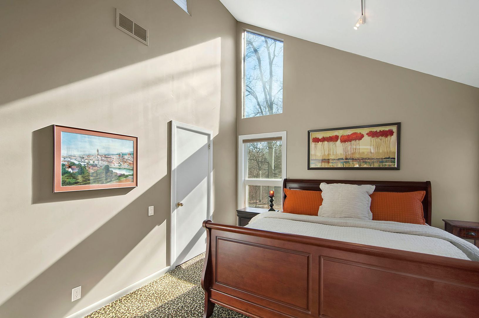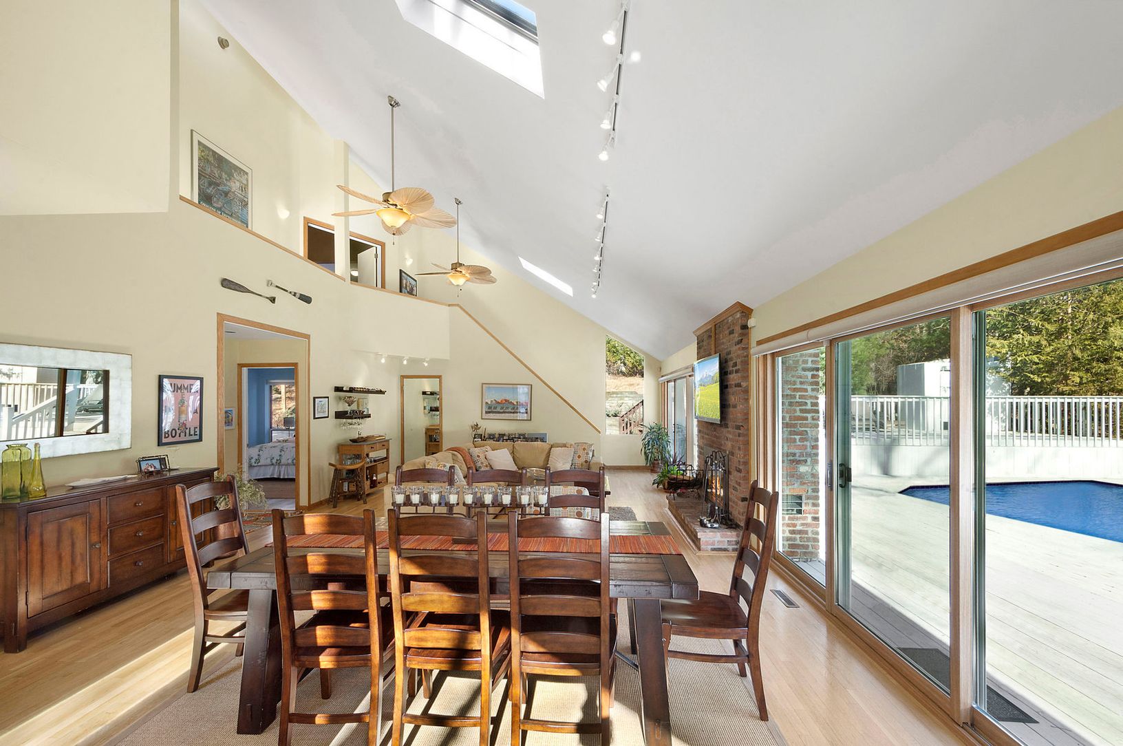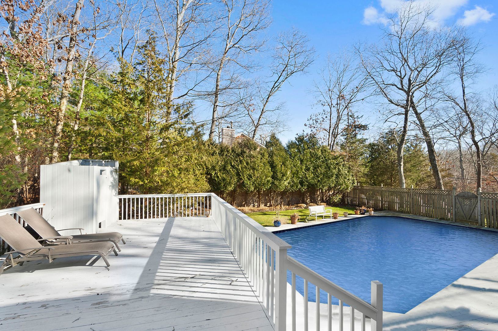 SOLD. This spacious contemporary with separate guest suite is perfect for an extended family, a house filled with guests or a professional office. A sunny great room with a wall of glass doors to the multi level deck and heated saltwater pool is the centerpiece. additional 'public space' is provided by an office and a second living room with fireplace. A finished basement has a large rec room, laundry room, a full bath and ample storage. Five
