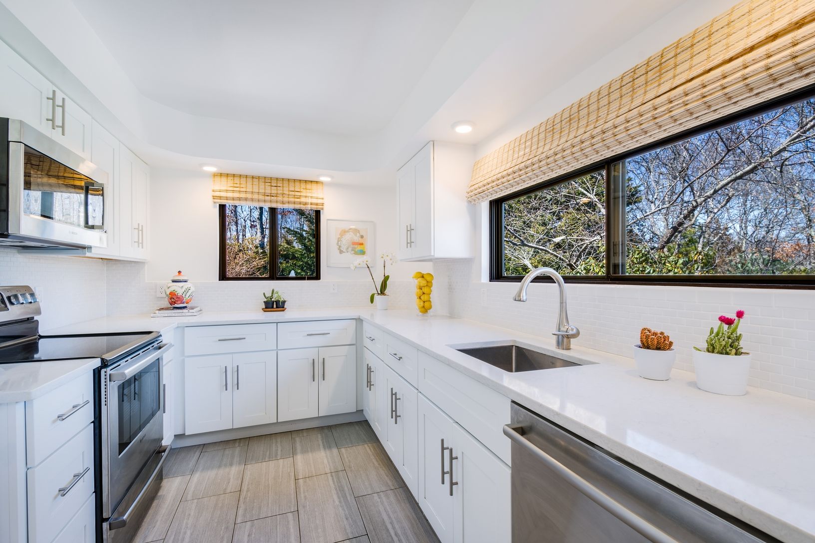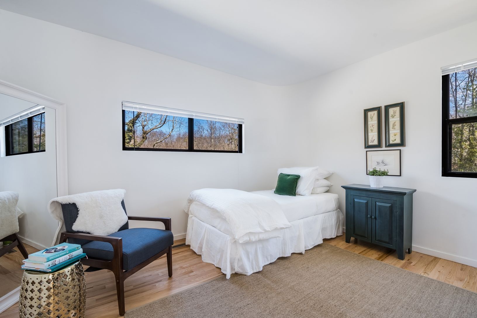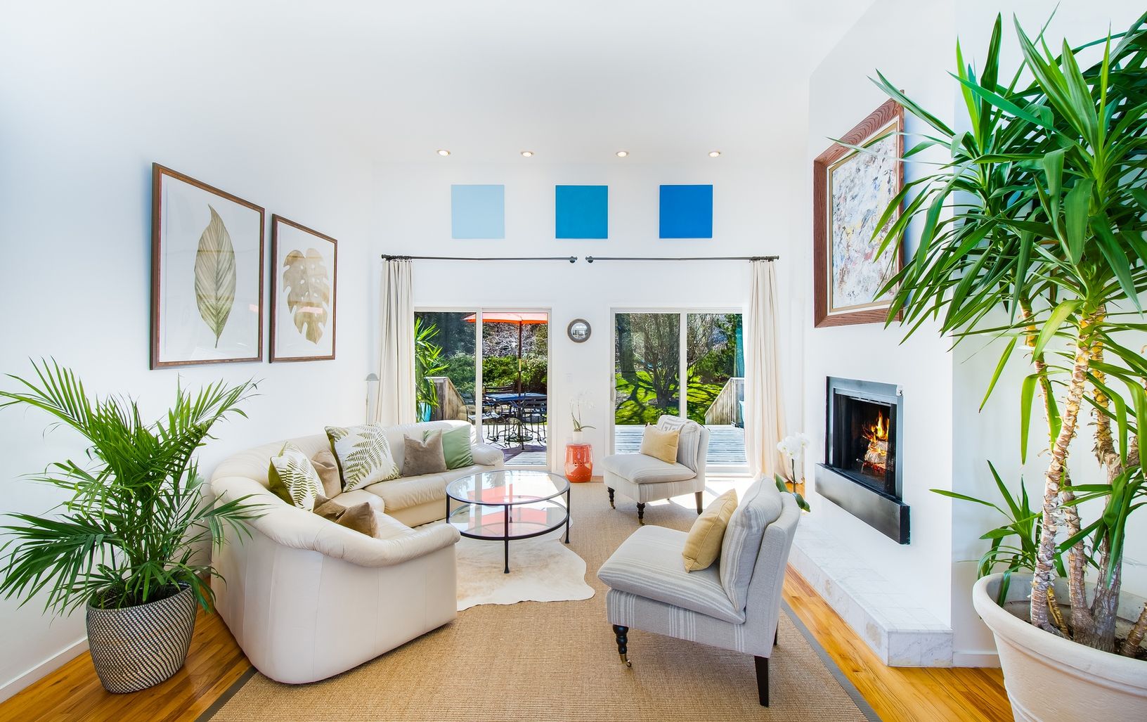 SOLD! Set at the end of a quiet cul-de-sac, this bright contemporary home overlooks the beauty and privacy of an exceptional property with mature landscaping, heated pool, extensive decking, separate patio, and an outdoor shower. In addition, there is a charming and secluded studio / cabana with the wonderful conveniences of water, electric and cable. The residence features a central living room with cathedral ceilings and tremendous light fro