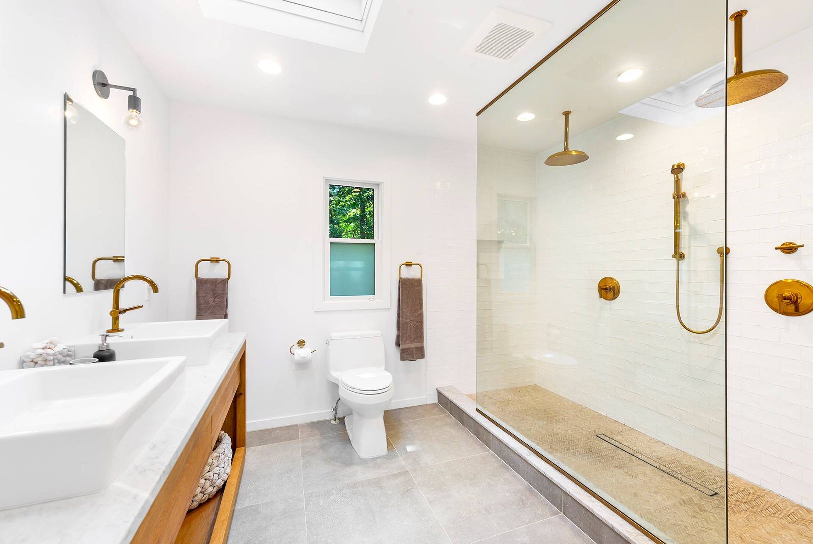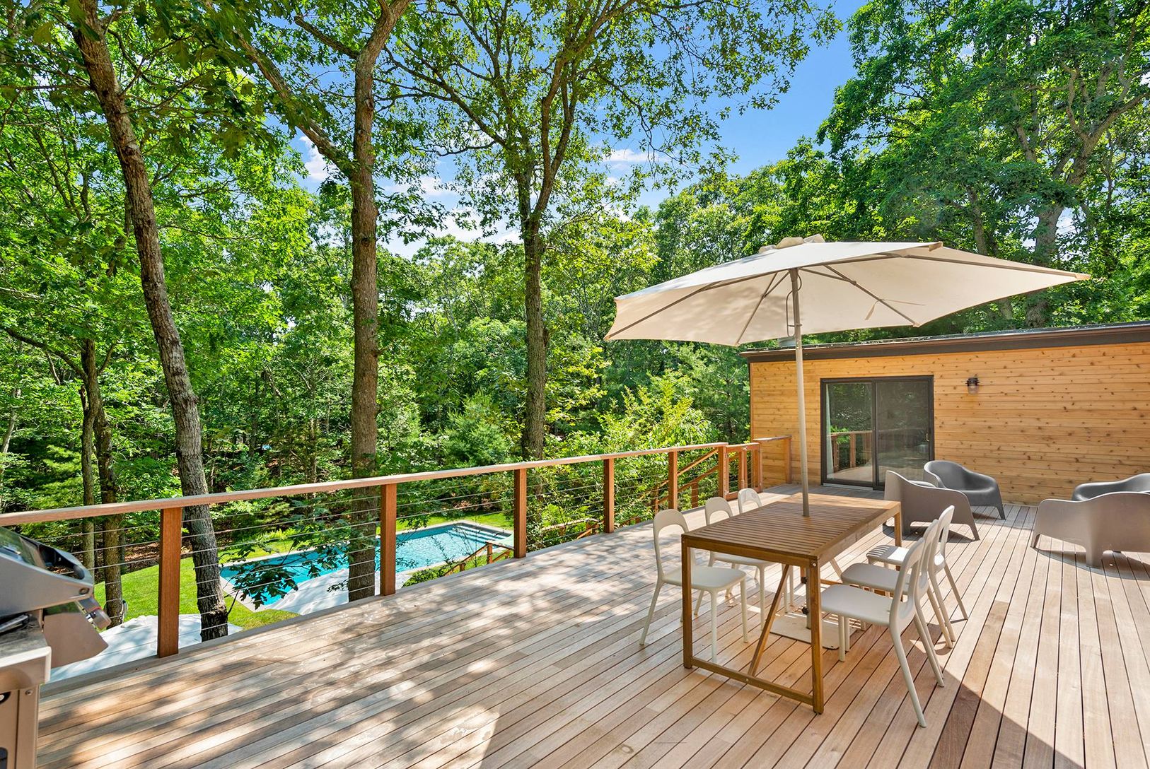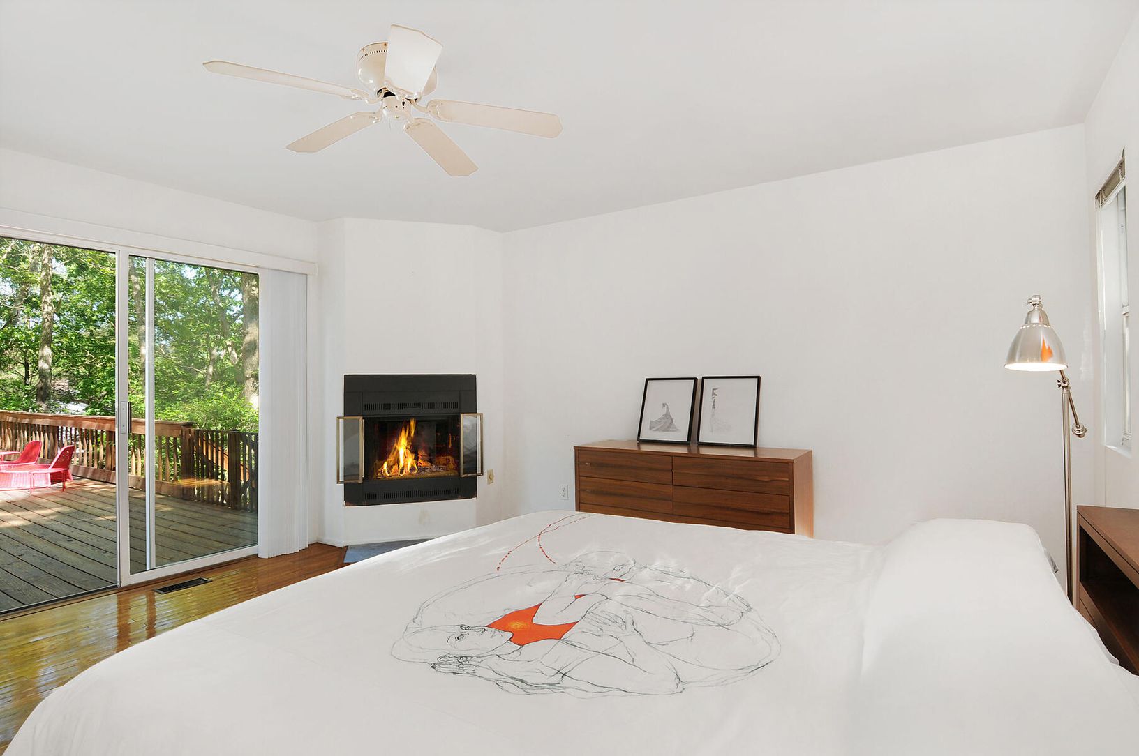 This tranquil and bright three-bedroom contemporary is drenched in natural light. The open and spacious living room has a fireplace and wall of sliders that open to a large deck overlooking the lush yard. This flows into a chef's kitchen with center island and dining area. There is a sunroom off the kitchen which leads to the garage. Also on this side of the house is the primary suite with a full bath and fireplace! On the other side of the ho