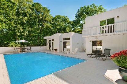 This 3-bedroom, 2-bathroom crisp white cedar modern ideally sited on 1.1 acres of wooded land. Skylites give open lighting all day. Upper level balconies overlook the huge back deck with built in new lined heated pool perfect for easy entertaining. The spacious kitchen has been fully updated with stainless appliances and granite counters while a sleek modern fireplace and skylights warm up the living area. The fully finished lower level with w