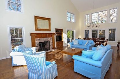In a quiet, secluded location within easy reach of East Hampton Village, this four bedroom, three and a half bath home is also in close proximity to tennis, racquetball, horseback riding and golf. The home's centerpiece is a great room with a cathedral ceiling and high windows which allow abundant light to shine through. A dramatic staircase gives way to a landing/sitting area on the second floor. This space leads to a bedroom suite with it