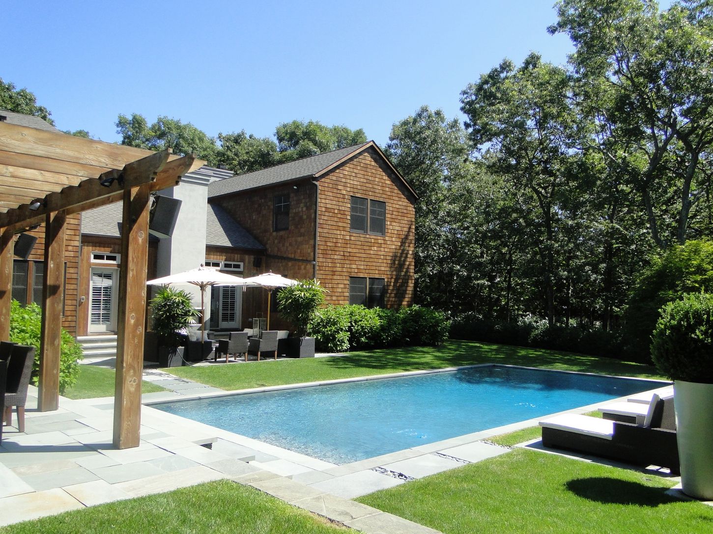 Stylish and beautiful 5 bedroom, 5 bath Post Modern with gourmet eat-in kitchen, formal dining, t v room, out door fireplace surrounded by a bluestone patio, out door dining under pergola, gunite pool and 2 car garage all on an exquisitely landscaped 1.4 acres
