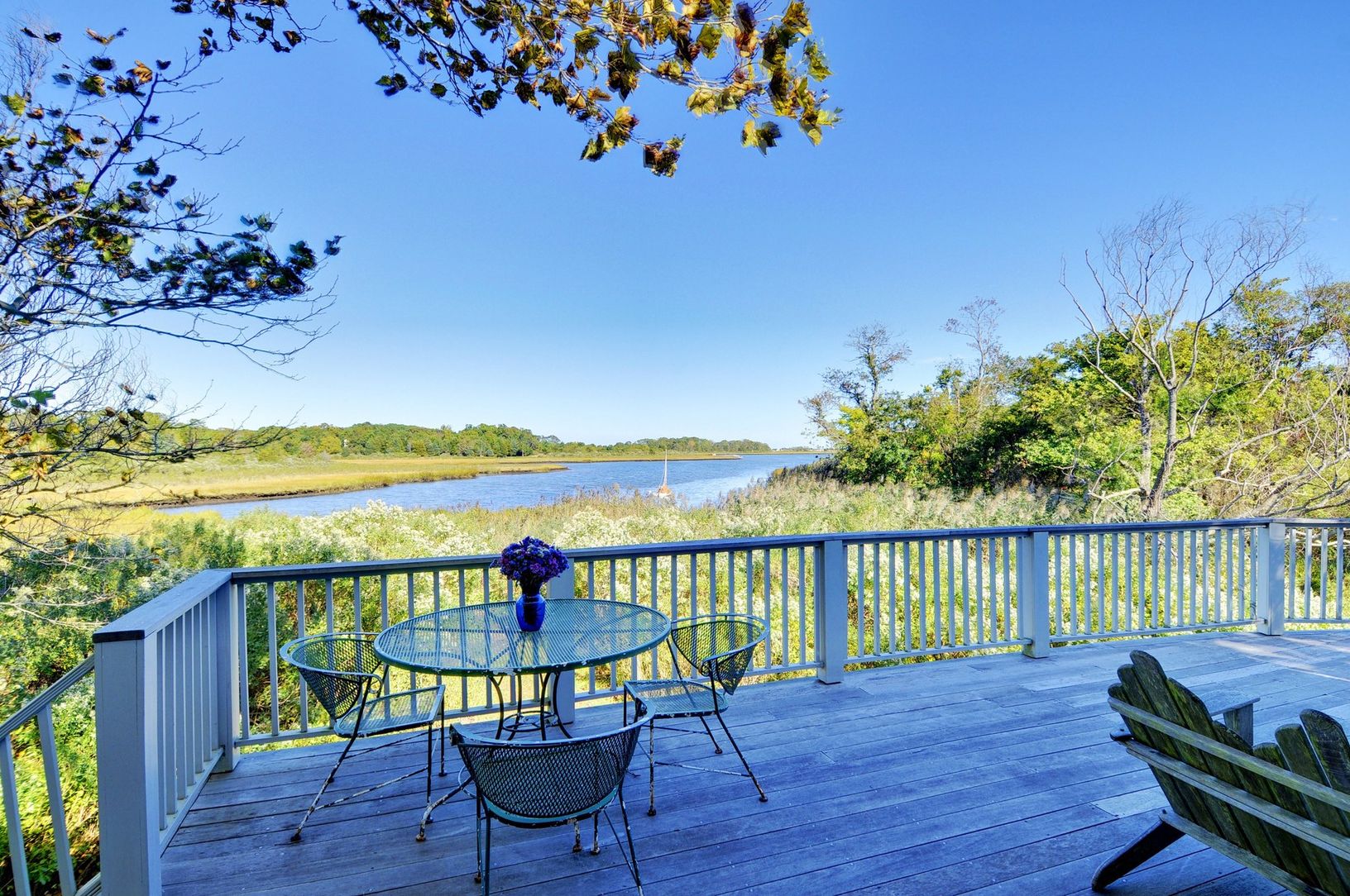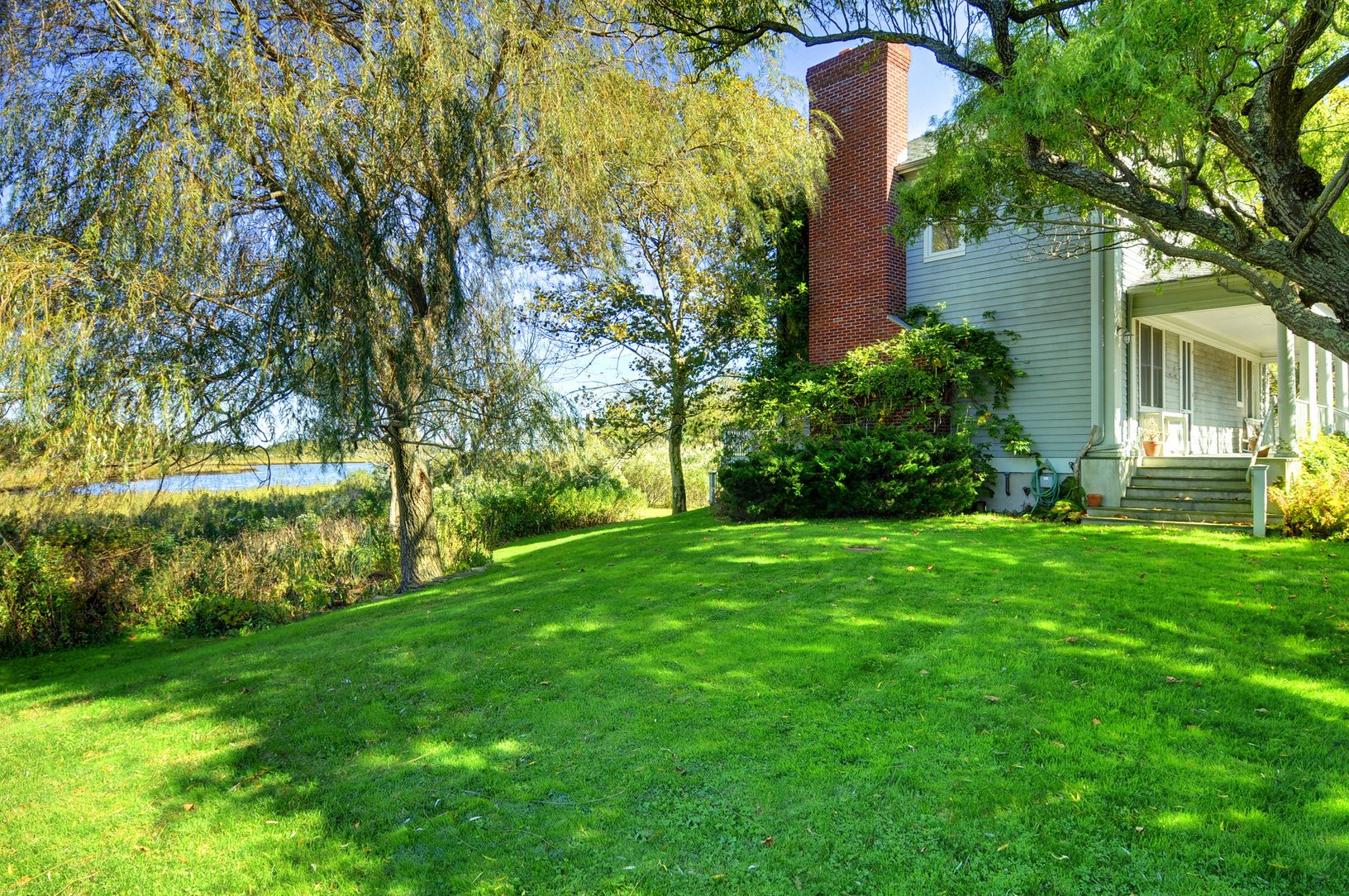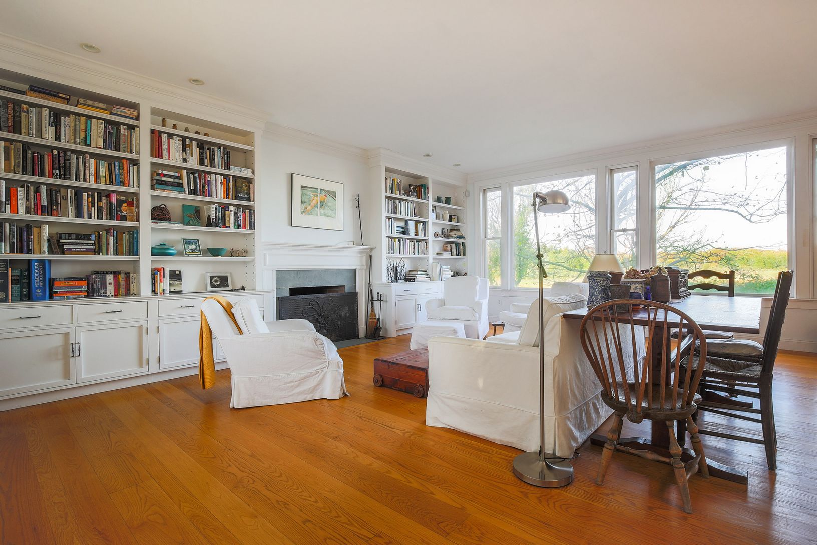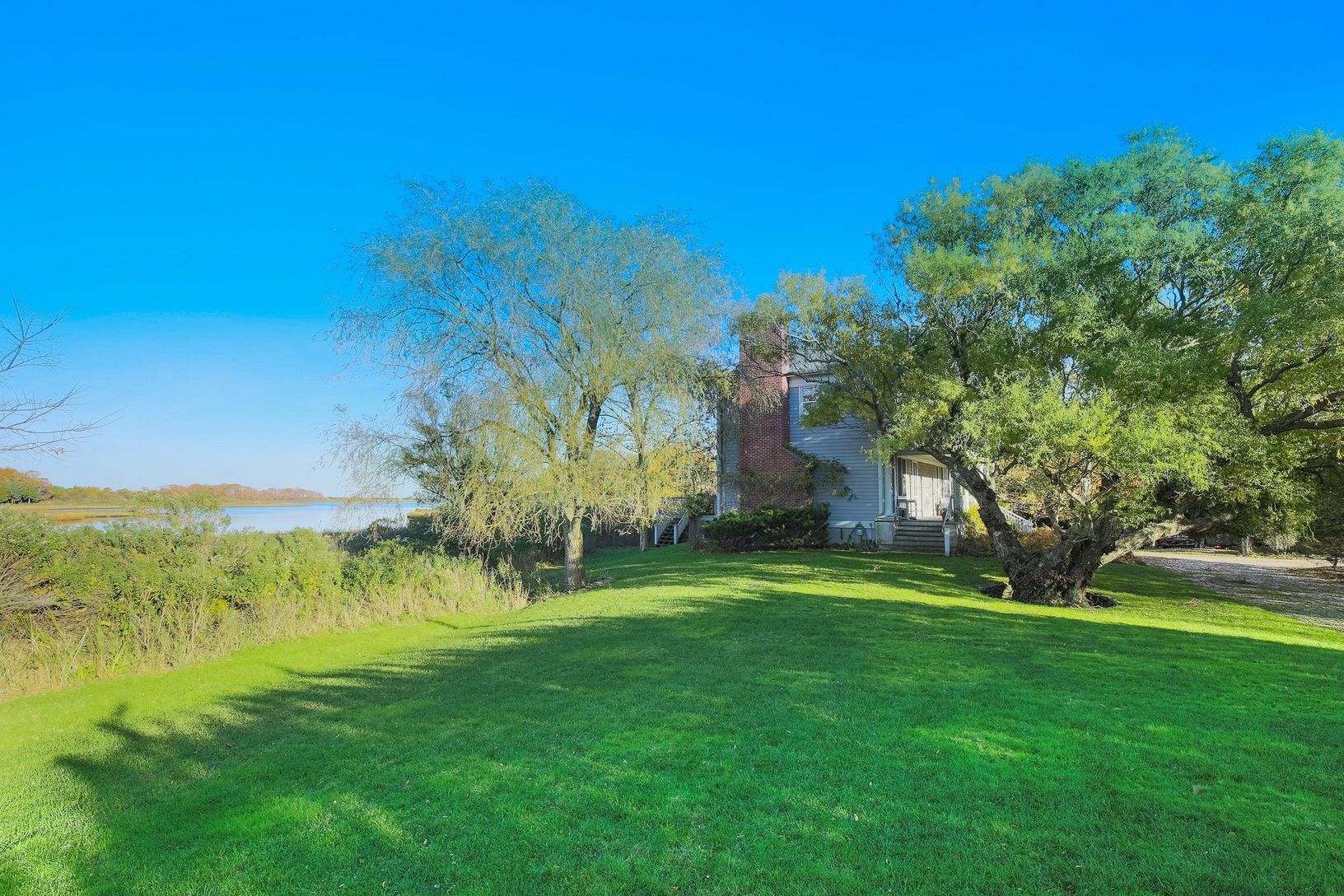 With serene Accabonac Harbor at its back door, this charming traditional on a full acre is a nature lover's sanctuary. A massive specimen curly willow tree sets the stage leading to an inviting pillared front porch. Built in 2004 by Ben Krupinski, the 2400 sq. ft. open interior living space is warmed by floor to ceiling bookshelves flanking the fireplace, beautiful hardwood floors and oversized windows to welcome the light and incredible vie