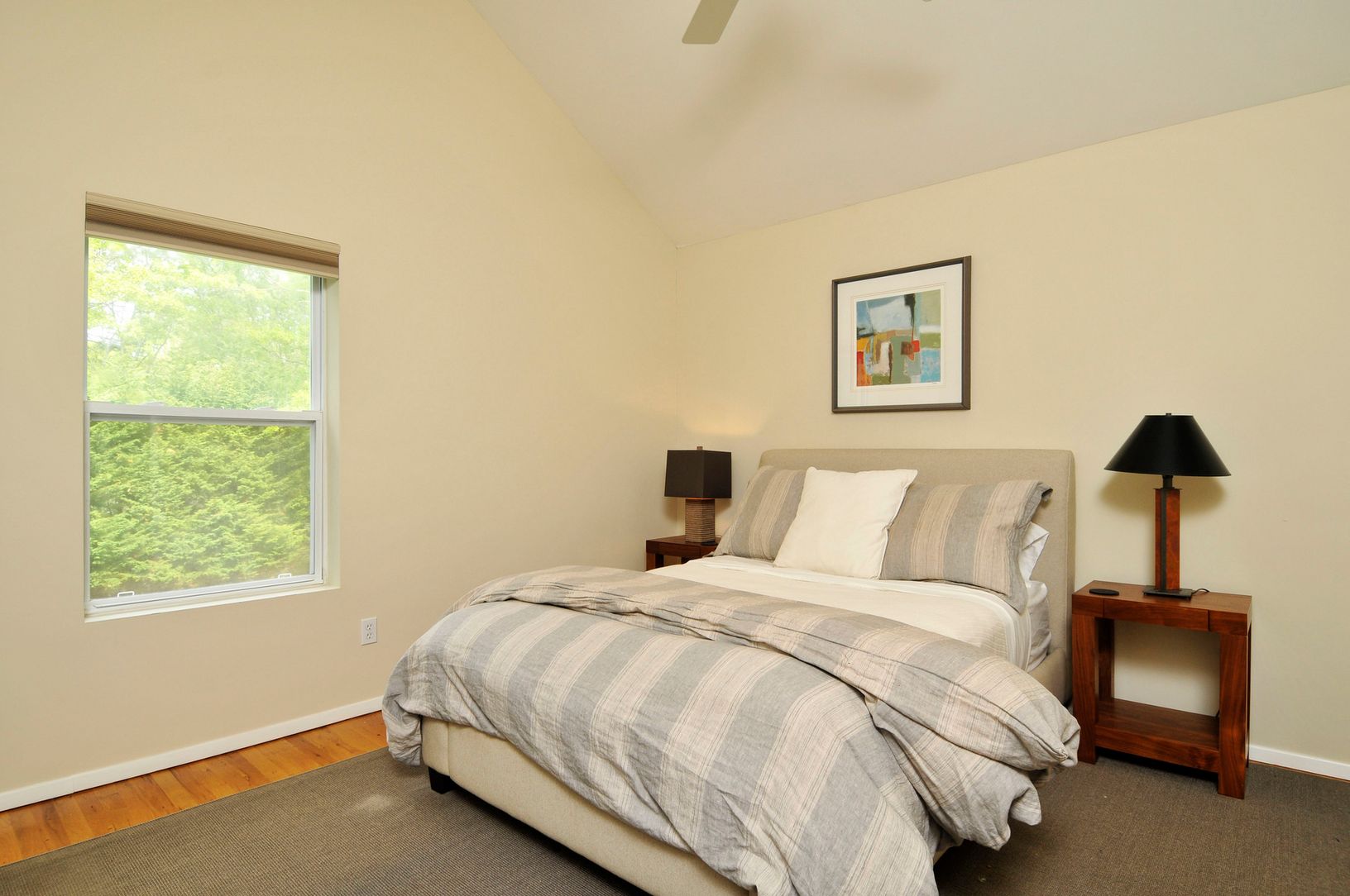 This freshly painted and lightly used three bedroom, two bath beach house is move in condition. Sited on a lovely street proximate to the village of East Hampton on a third of an acre plot, this two story contemporary sparkles. Open living room and dining room flow easily to kitchen and freshly stained outdoor deck, yard and hot tub. There is room for a pool if one desires. There is a guest bedroom and a full bath plus laundry on the main