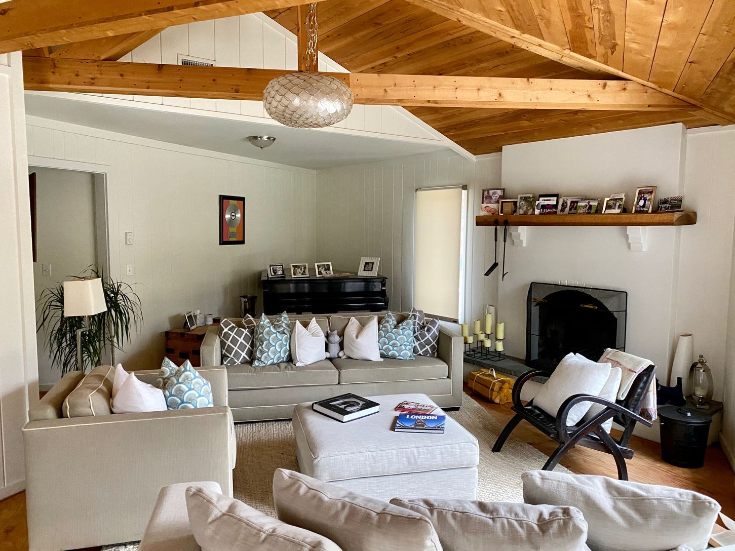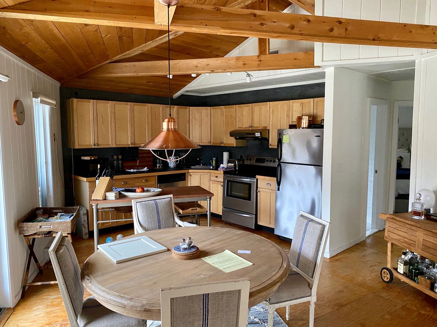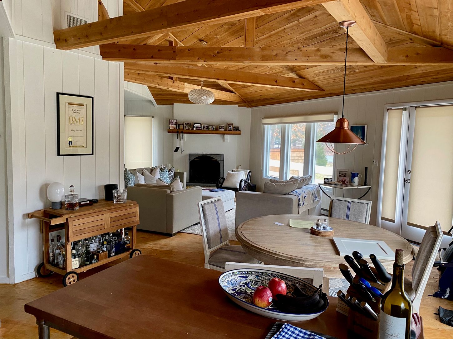 Now available for immediate rental. Stylish and chic, this Beach Bungalow is truly one of a kind! Sited on almost 1/2 acre, and adjacent to a reserve, this hexagonal shaped home features 3 bedrooms, 2 bathrooms and an open floor plan with exposed cedar beamed ceilings, open kitchen, dining area and living room with wood burning fireplace. The first floor master and guest bedrooms share the common bathroom, and the finished lower level boasts a
