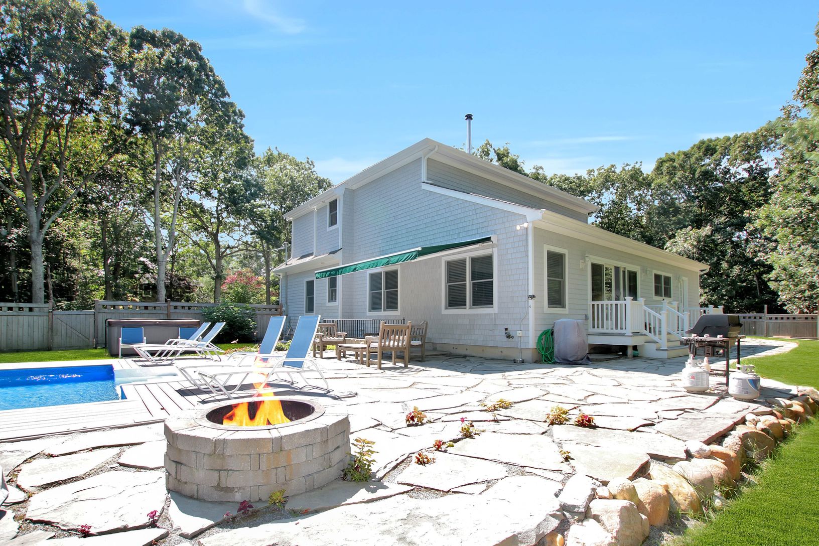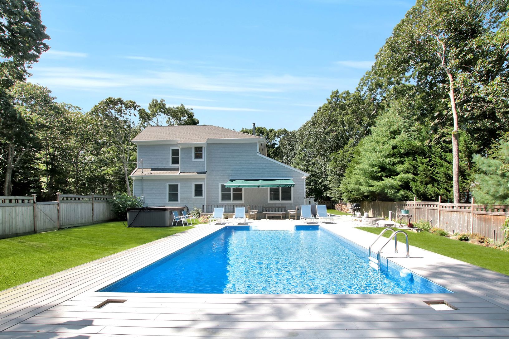 Desirable Post Modern on a quiet street, with all the finishing touches! All 4 bedrooms are en suite, with two master suites on the first floor and an additional half bath., This home is a wonderful year round retreat and/or a perfect rental investment property. Soaring cathedral 20 ft ceiling over living and dining room leads to gourmet kitchen and den. Sliding patio doors lead to heated pool and bluestone patio. House features gleaming hardw