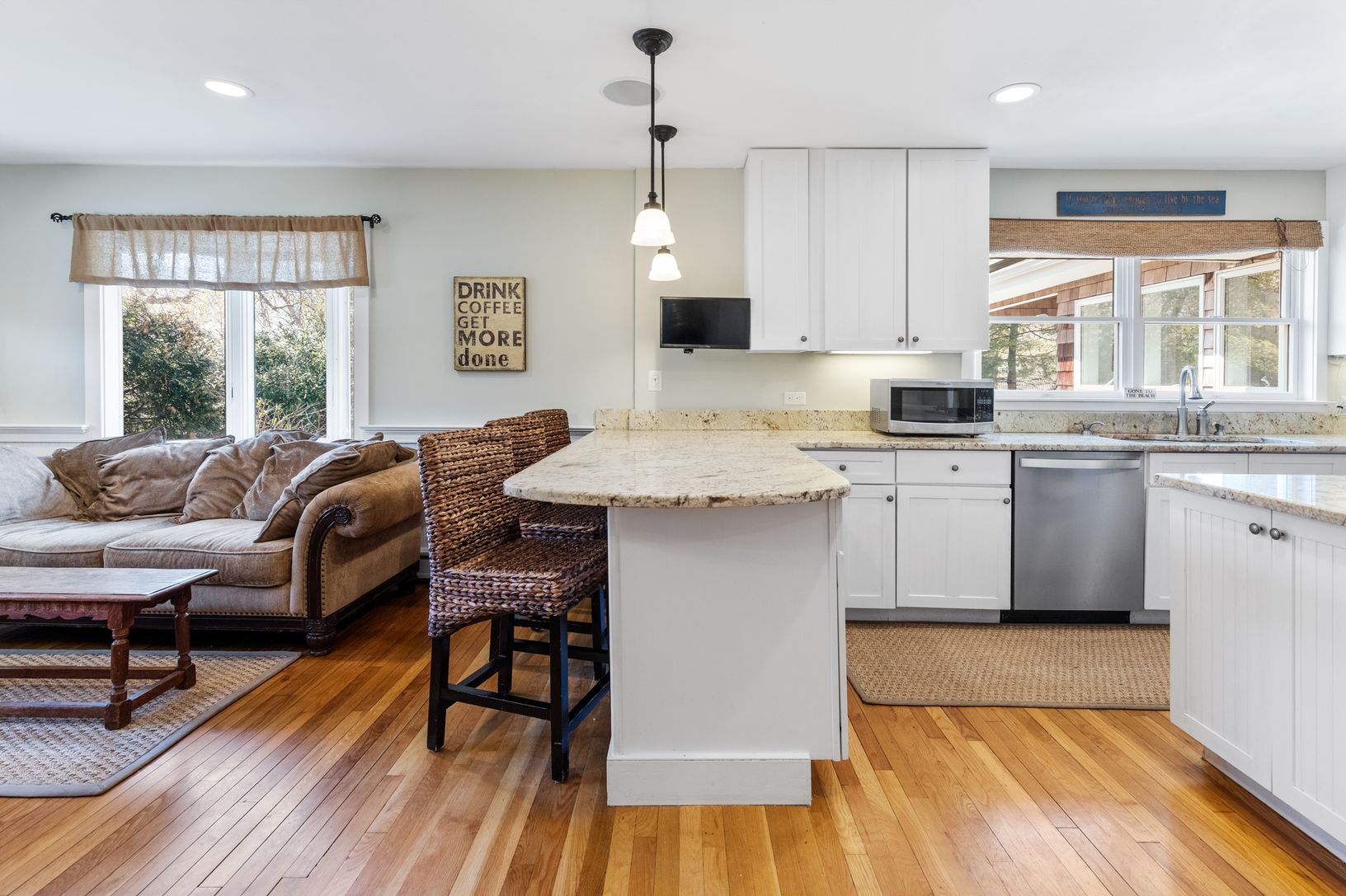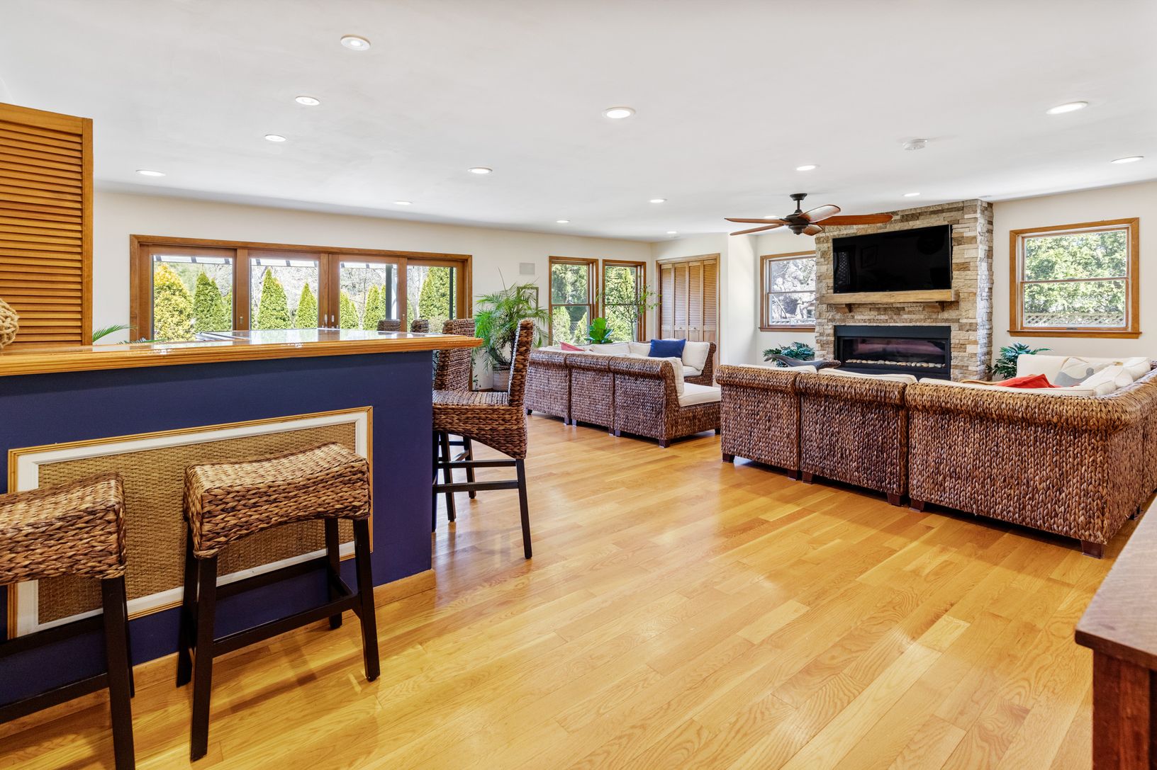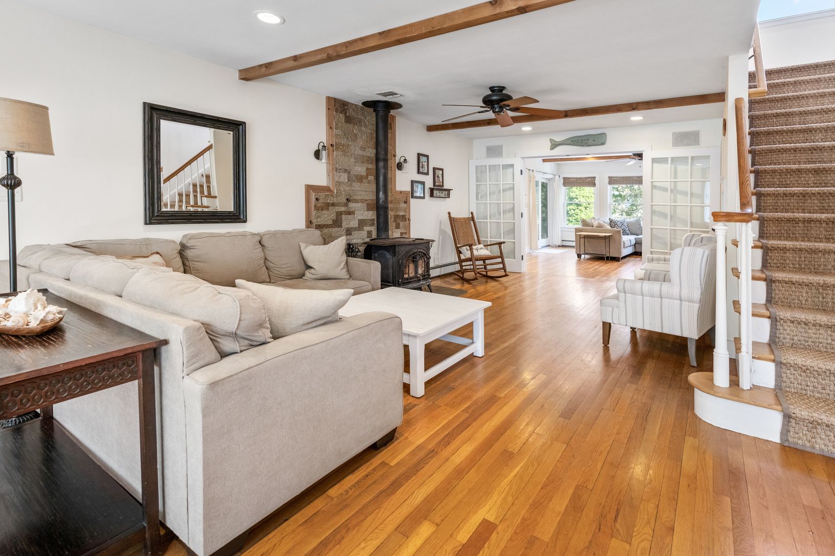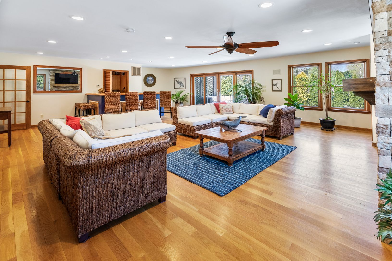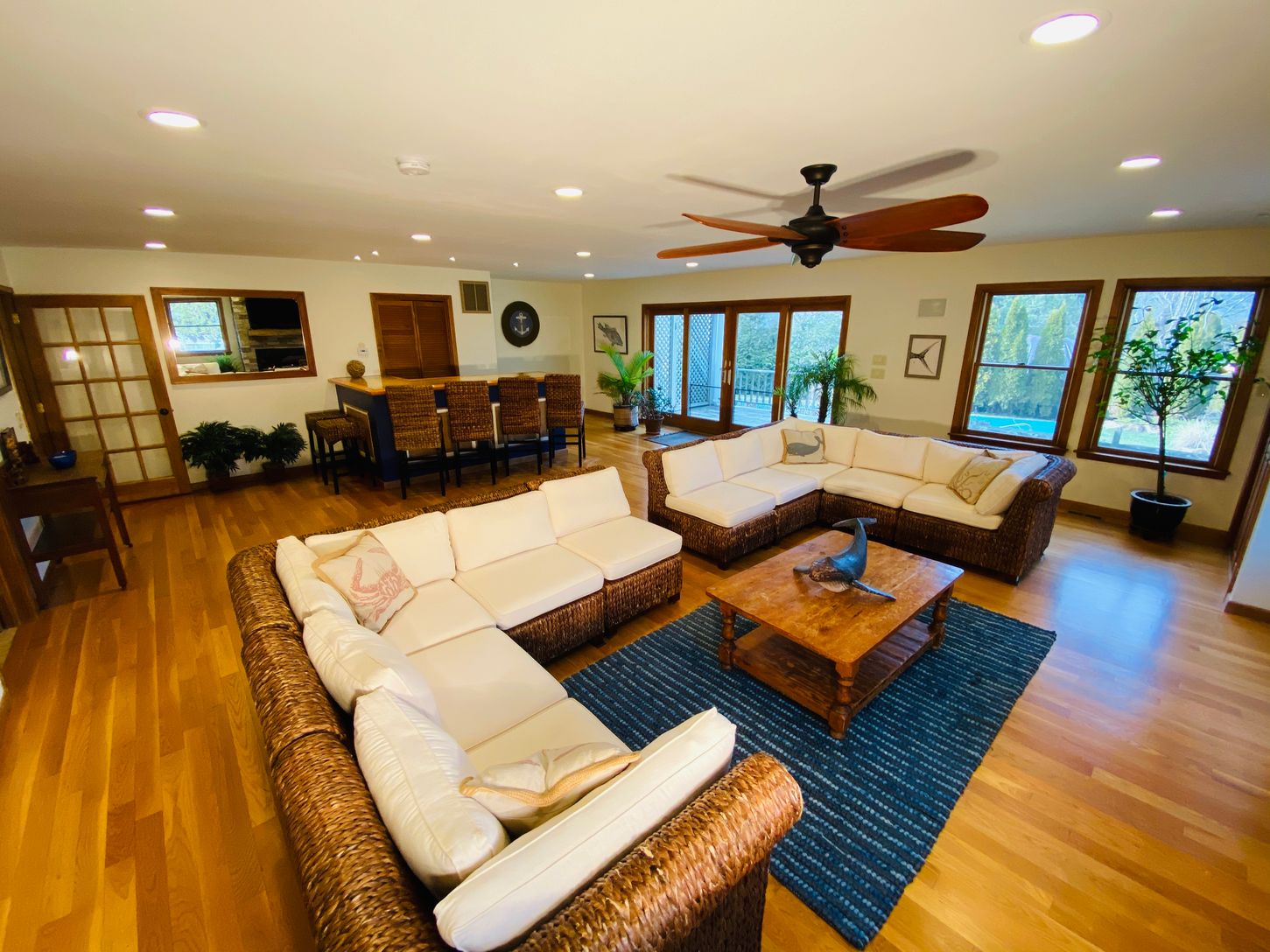 Rental Registration # 0952 Welcome to this Prefect East Hampton get away! Beyound four bedrooms there is 1 office, 1 study, 1 large bonus room, 1 sitting room with wood burning stove, 1 entertainment room, 1 oversized media room with full sized bar, 1 piano room/playroom and 1 mud room. This house has it all! There is tiled foyer with custom compass mosaic as you enter the house. The house has a 3 bay garage with slop sink. It is a 2 story hou
