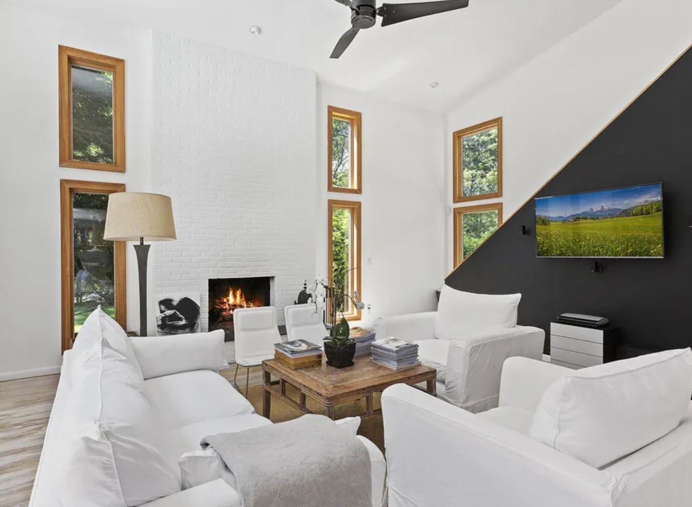 The interior of this home features a Stainless Steel kitchen appliances, designer furniture, Central Air, Asian Antiques, flat screen TV, Living room with Fireplace, soaring double-height ceiling, open kitchen, marble counter top, bar stools. Relax a