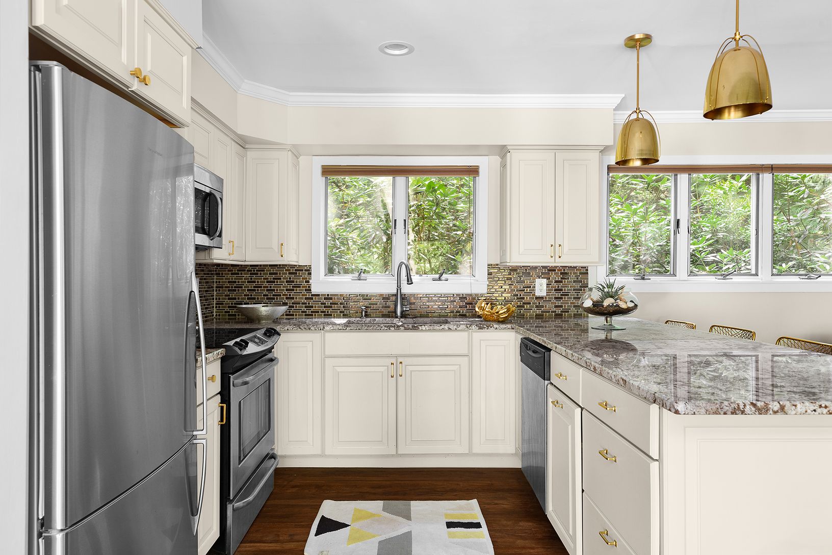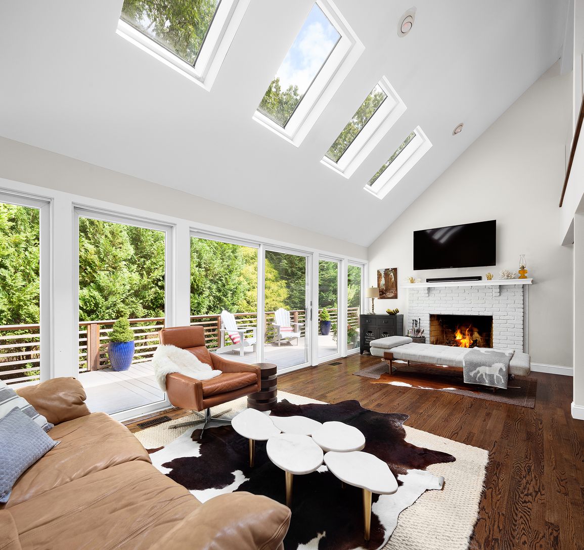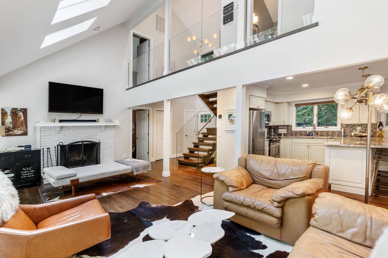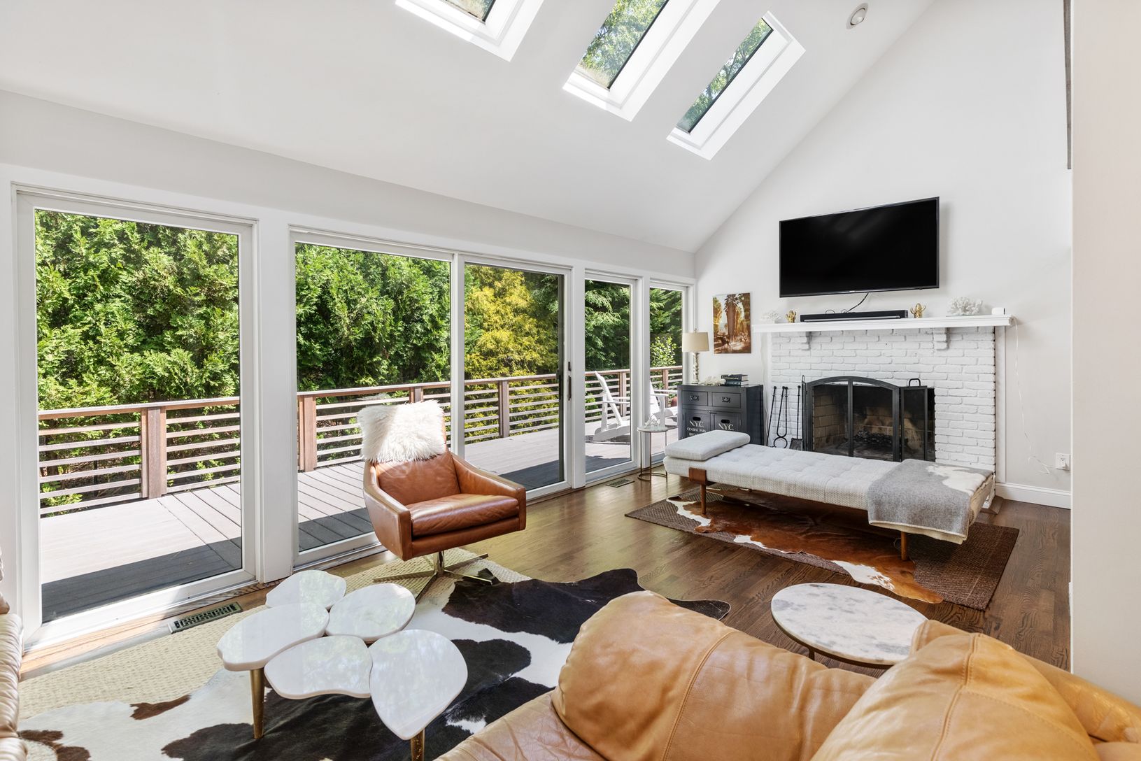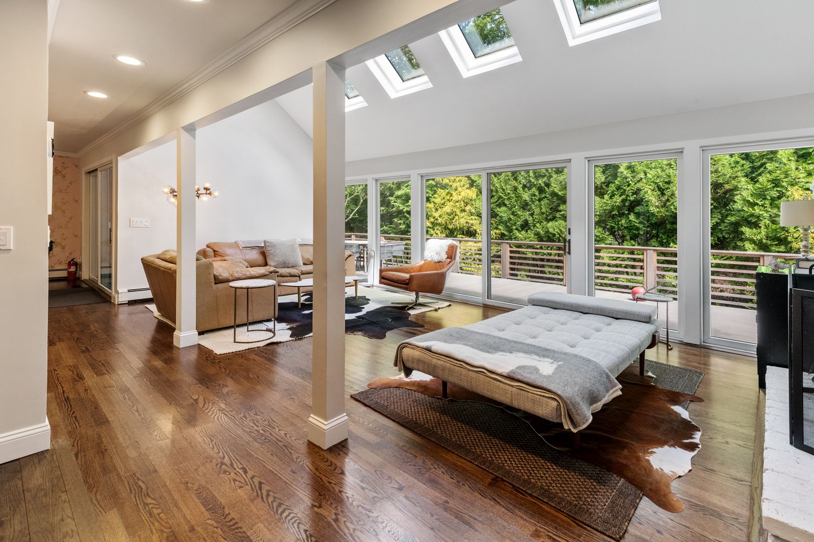 Chic and refined, this renovated, impeccably maintained, and thoughtfully furnished Northwest Woods home offers the perfect combination of serenity and enjoyment. Upon entering the home from your secluded and wooded driveway, you’re welcomed by walls of glass window, rowed evergreens, and a sophisticated triplex staircase clad in glass. The vaulted open living room is bathed in natural light via skylight windows and made for relaxation w/ work