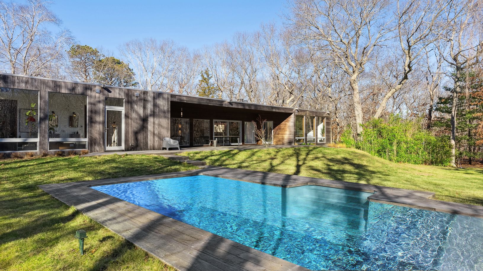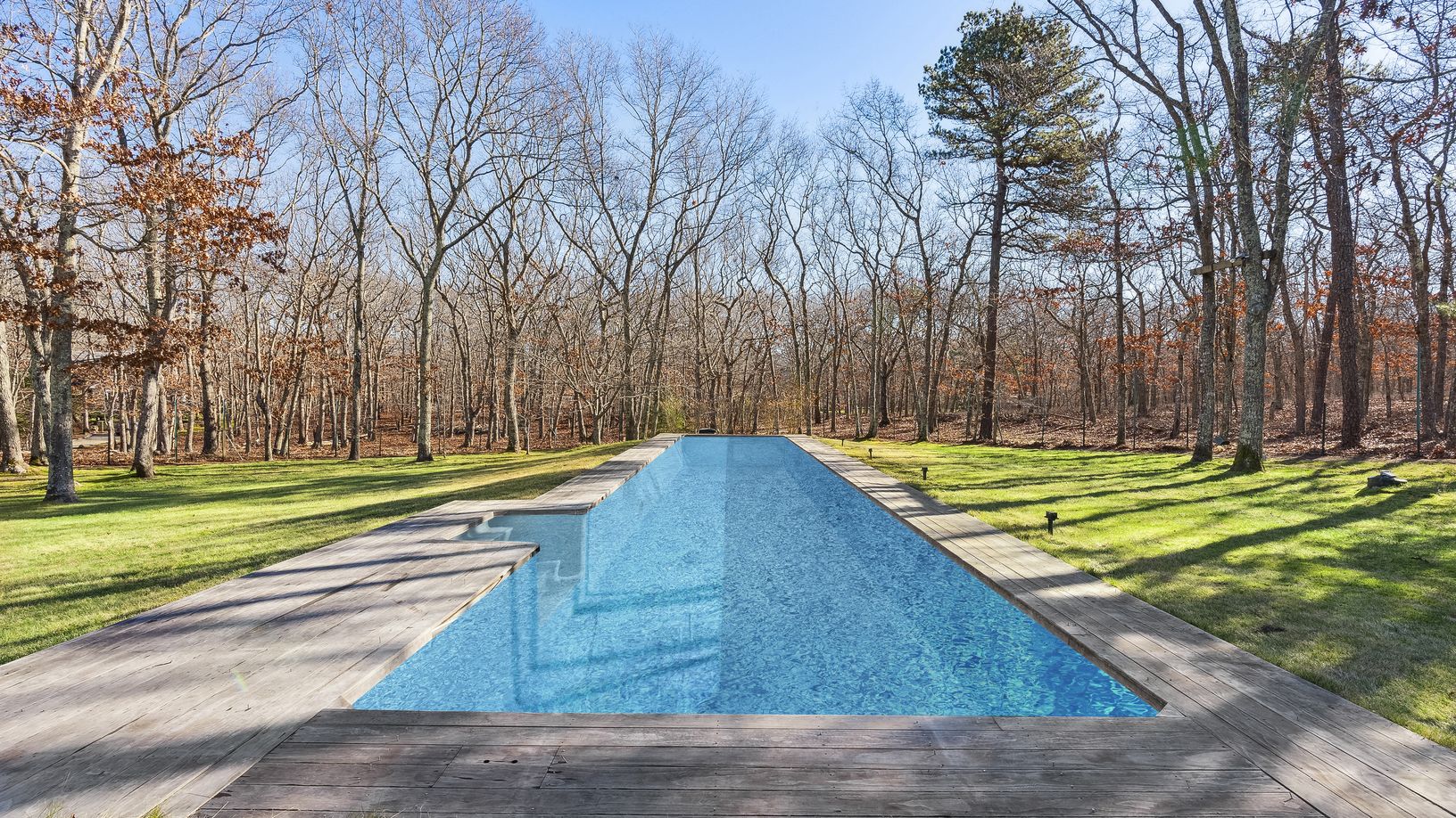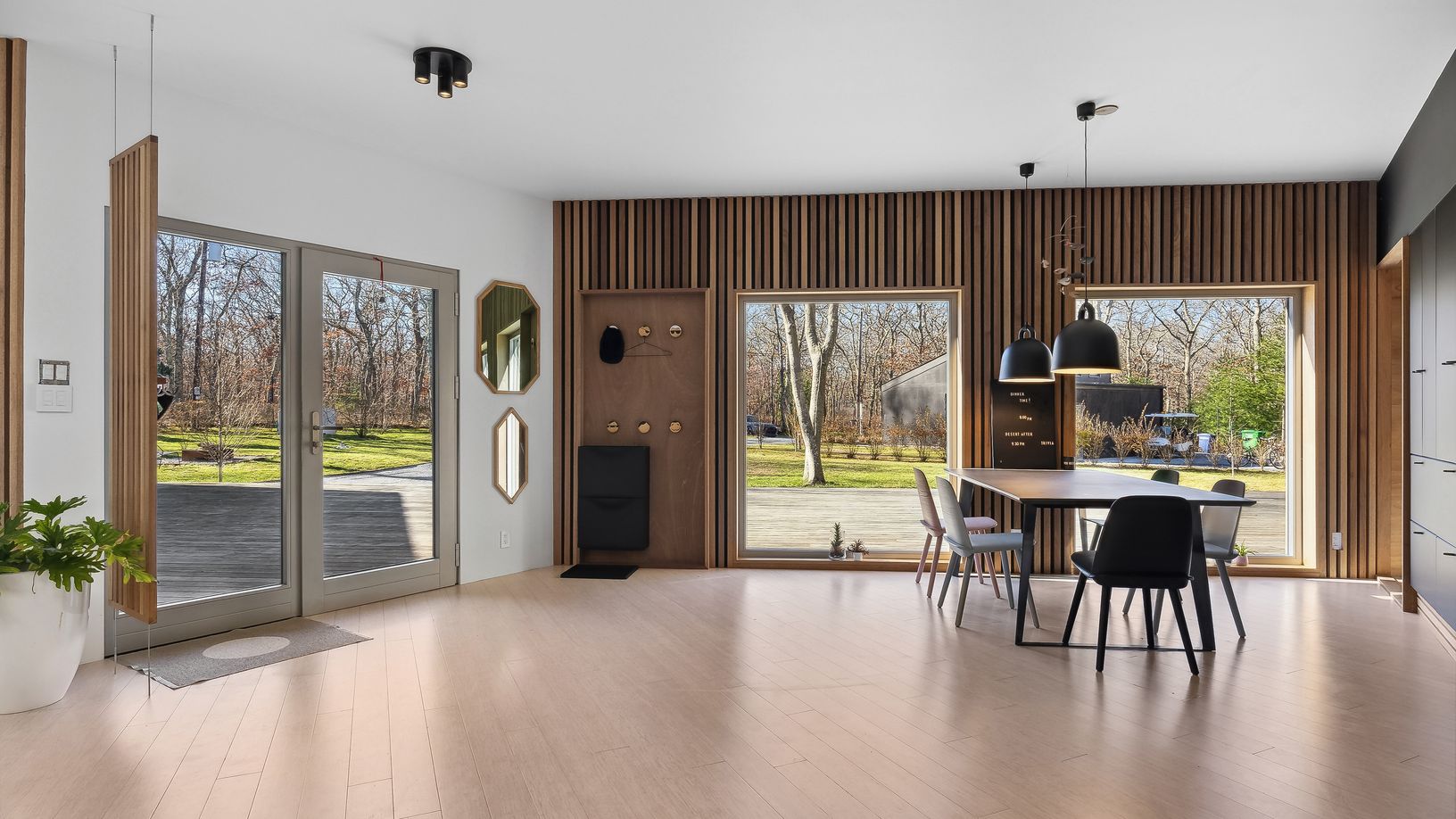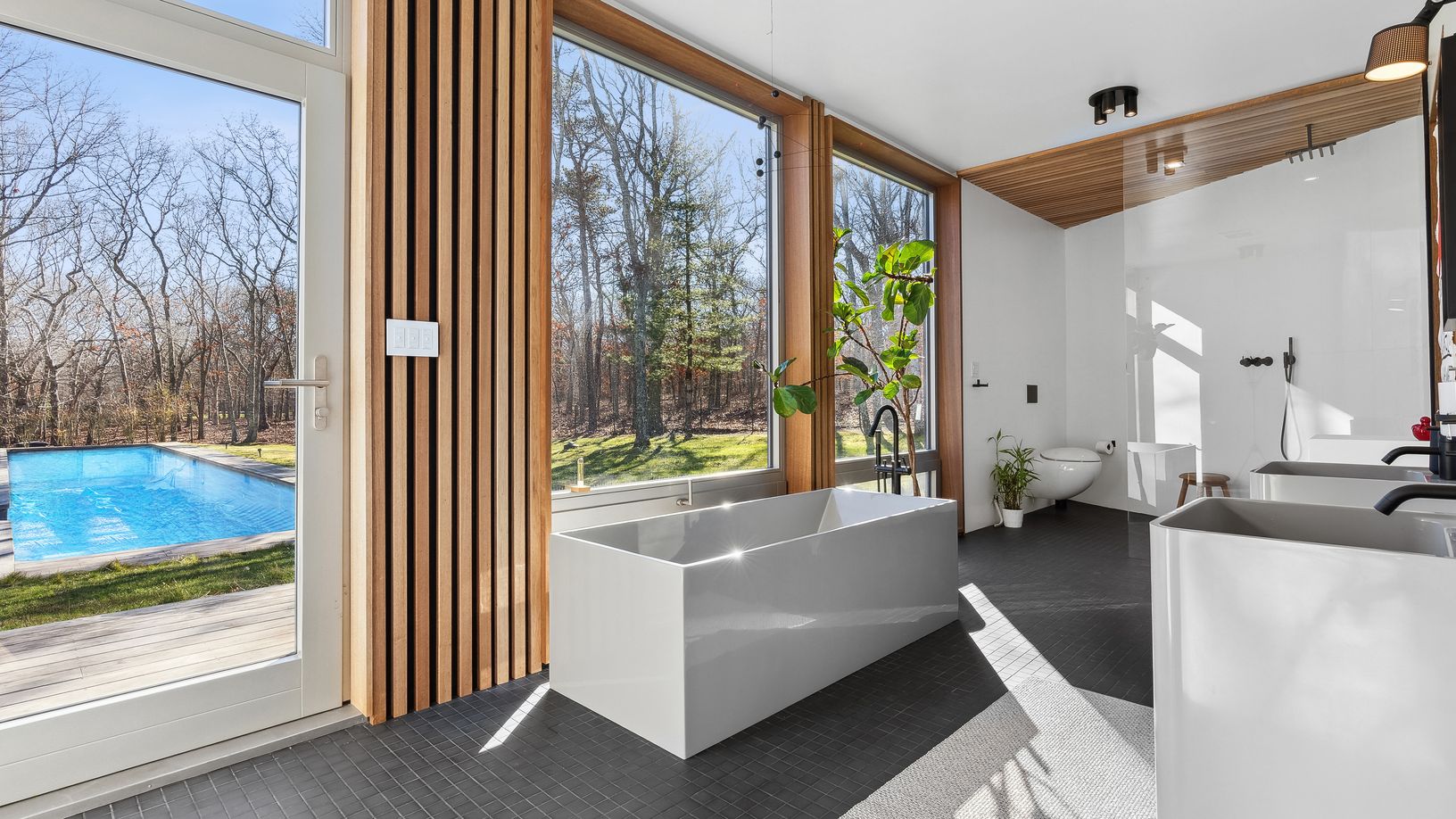 Experience modern elegance in this architectural masterpiece by Hans Noe. Nestled on a 3-acre property, this single-story gem offers three bedrooms and three bathrooms. The open-plan living room, adorned with a wall of windows and a wood-burning stove (RAIS), seamlessly connects to the kitchen. The master bedroom suite boasts an en-suite bathroom with radiant heat floors and captivating views of the seventy-five-foot-long pool, complemented by