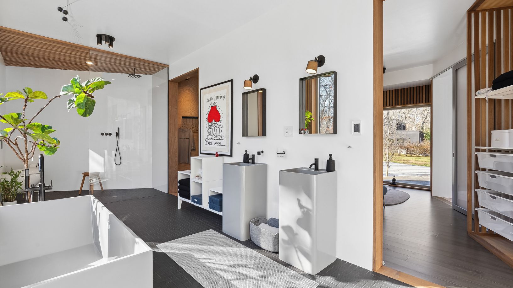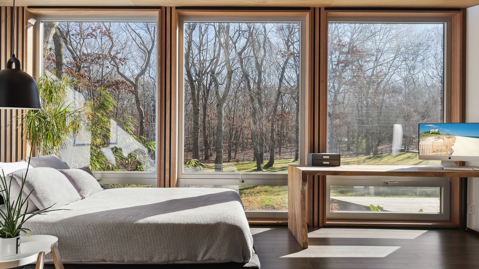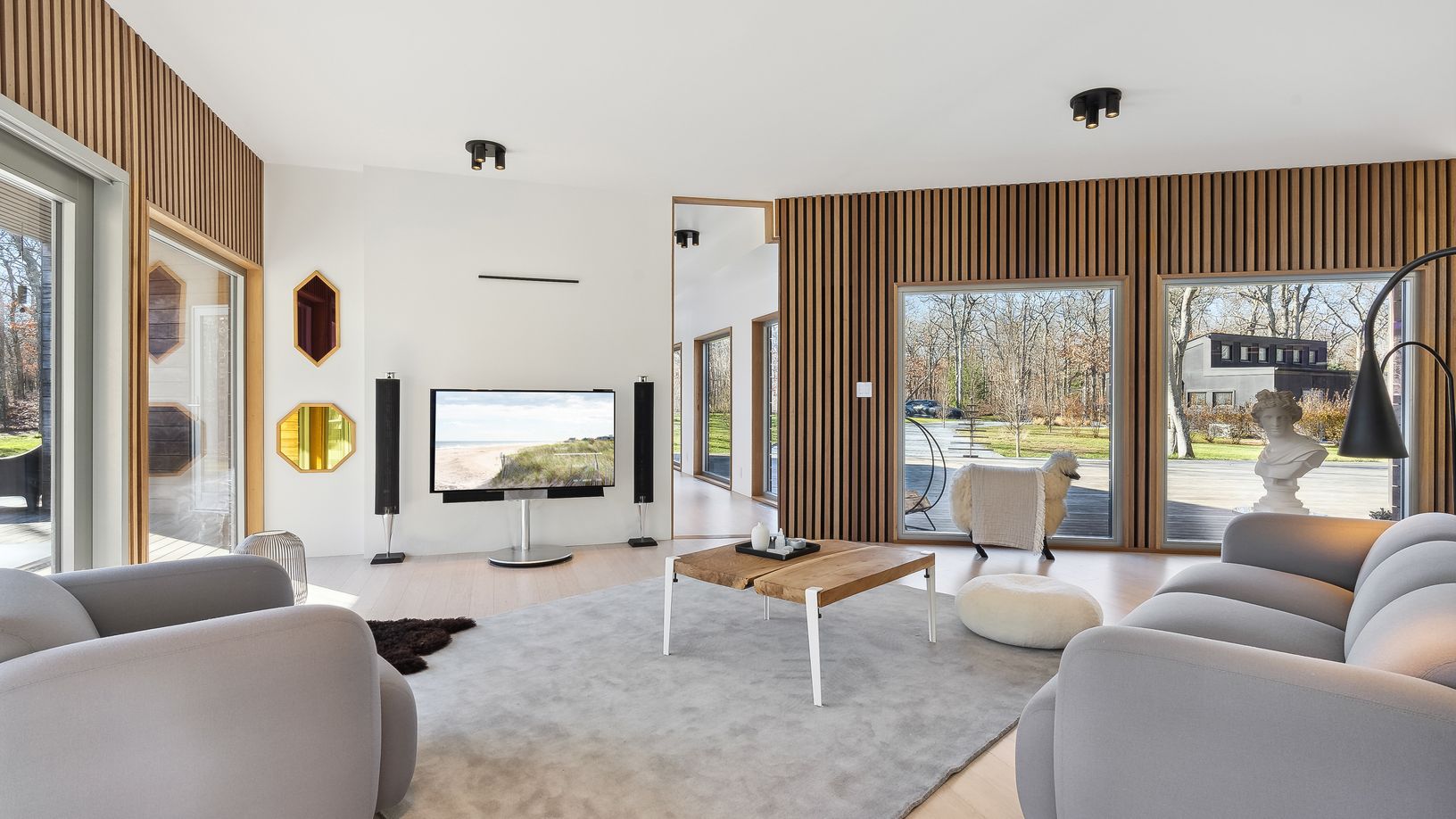 Experience modern elegance in this architectural masterpiece by Hans Noe. Nestled on a 3-acre property, this single-story gem offers three bedrooms and three bathrooms. The open-plan living room, adorned with a wall of windows and a wood-burning stove (RAIS), seamlessly connects to the kitchen. The master bedroom suite boasts an en-suite bathroom with radiant heat floors and captivating views of the seventy-five-foot-long pool, complemented by