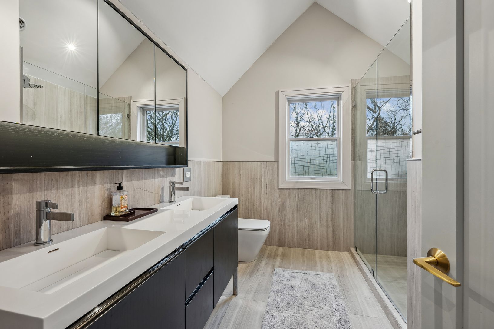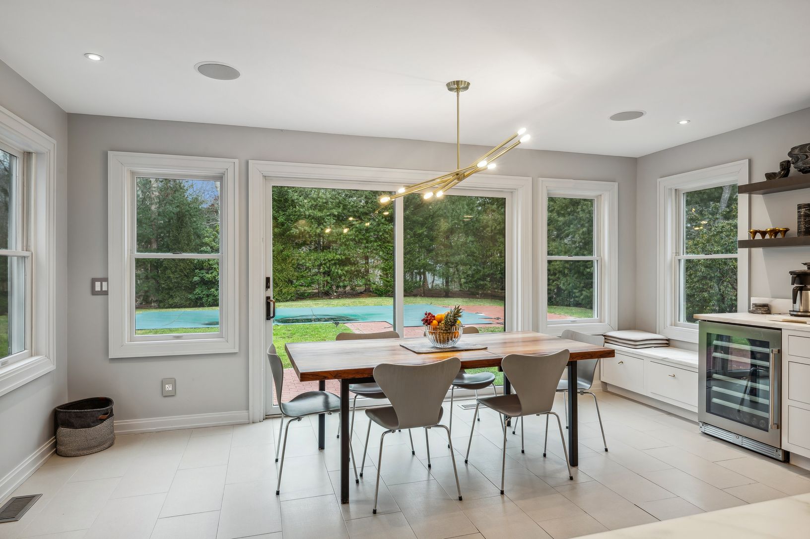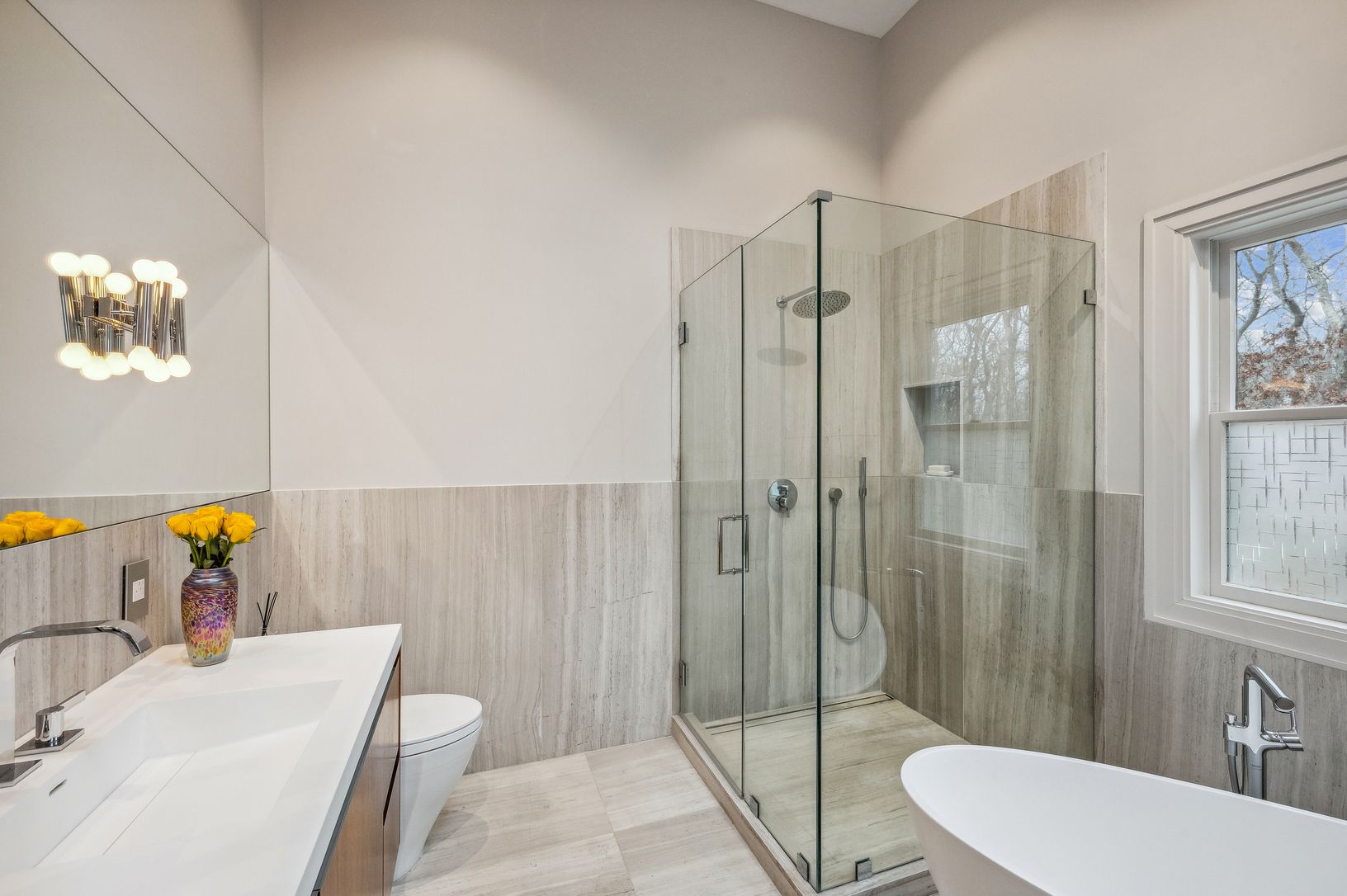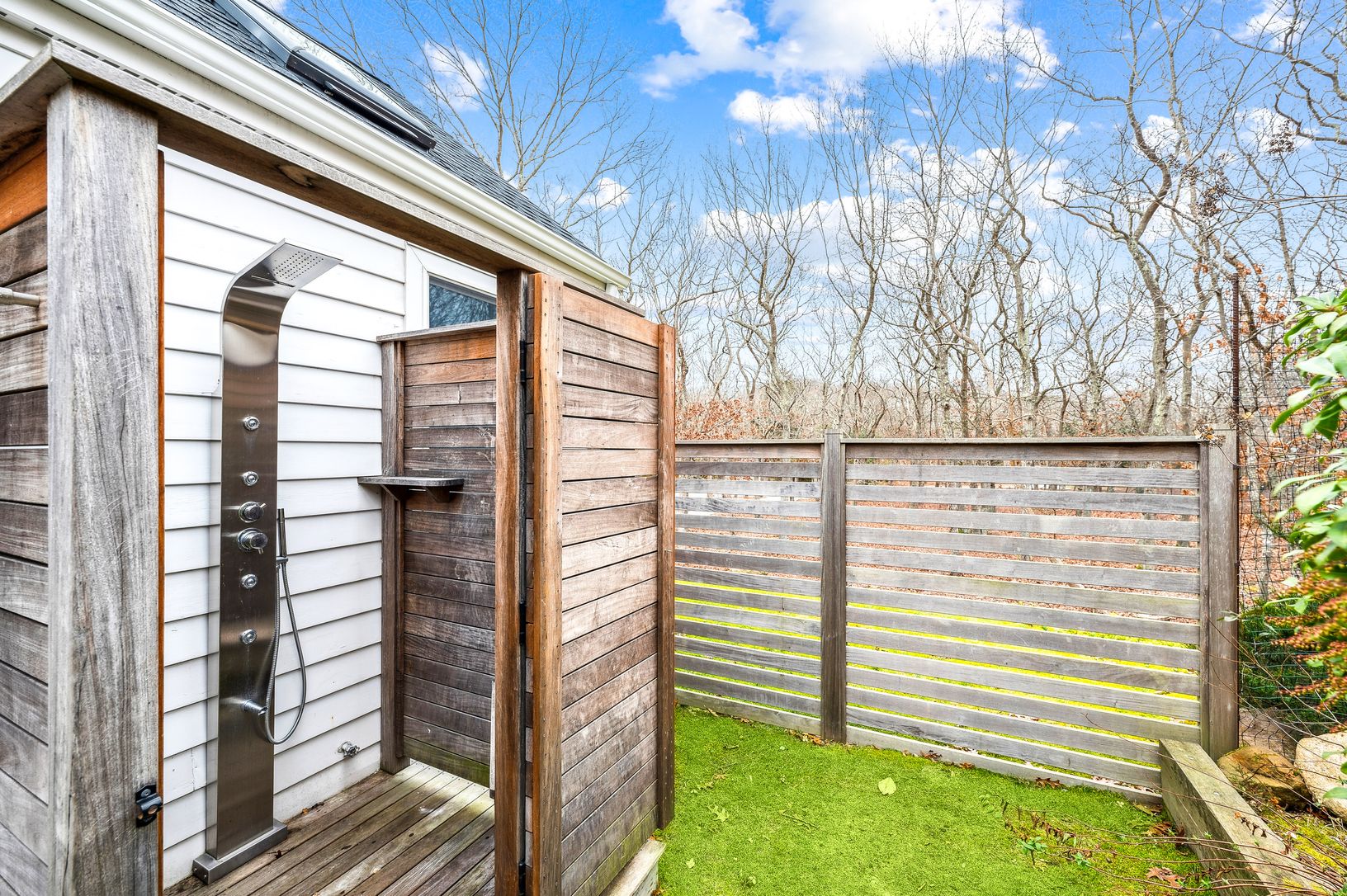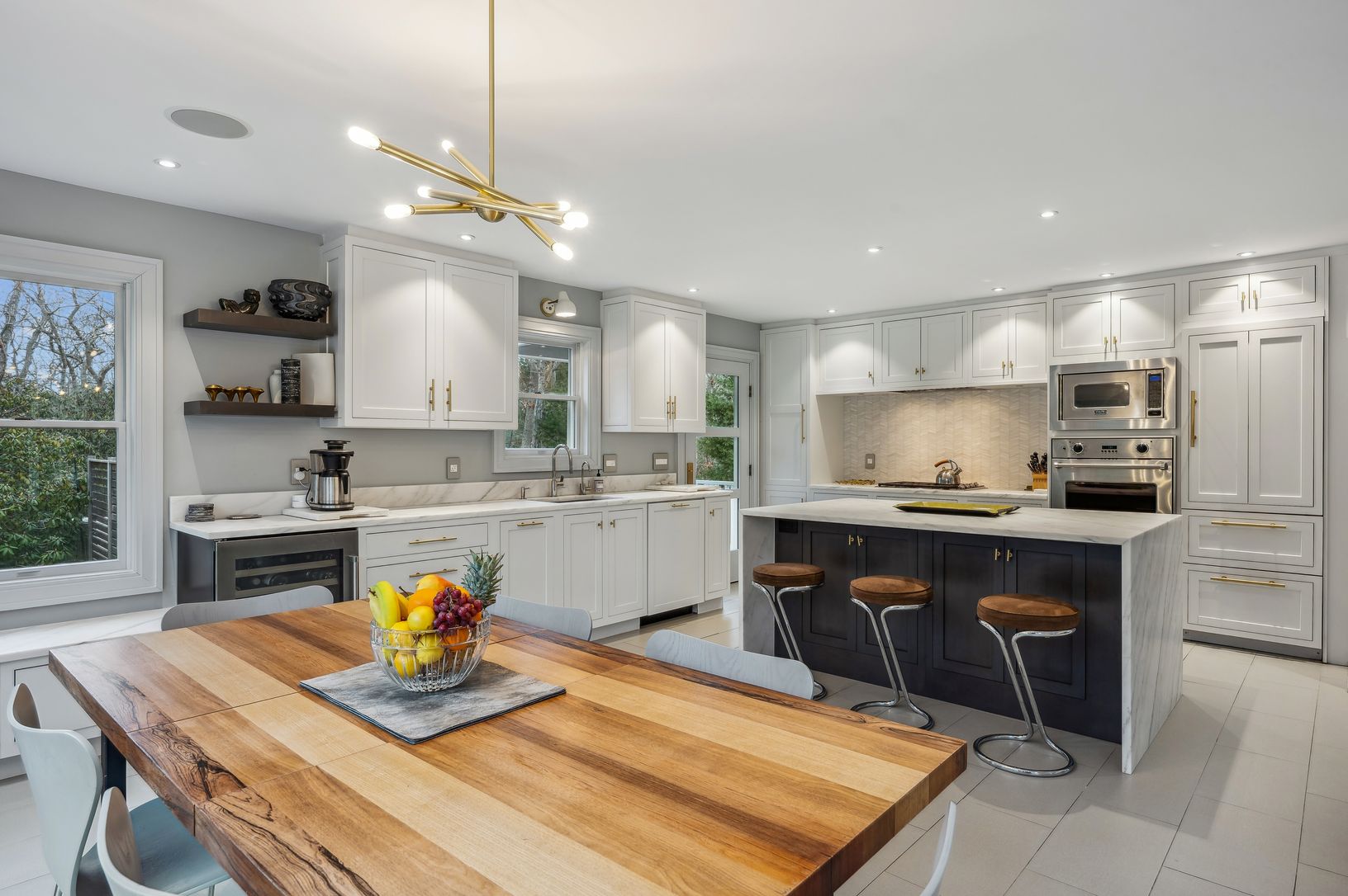 DESIGNER OASIS IN EAST HAMPTON. No detail was spared with the modern renovation of this impeccably styled, open, airy and light filled modern beach house set far back from the road. Tucked away on a private 1.1 acre in peaceful Northwest Harbor, backing to a reserve, located in the Hampton Waters Community with private bay beach access and community bulkhead/launching dock. Stunning open eat-in kitchen with sliders overlooking the heated salt