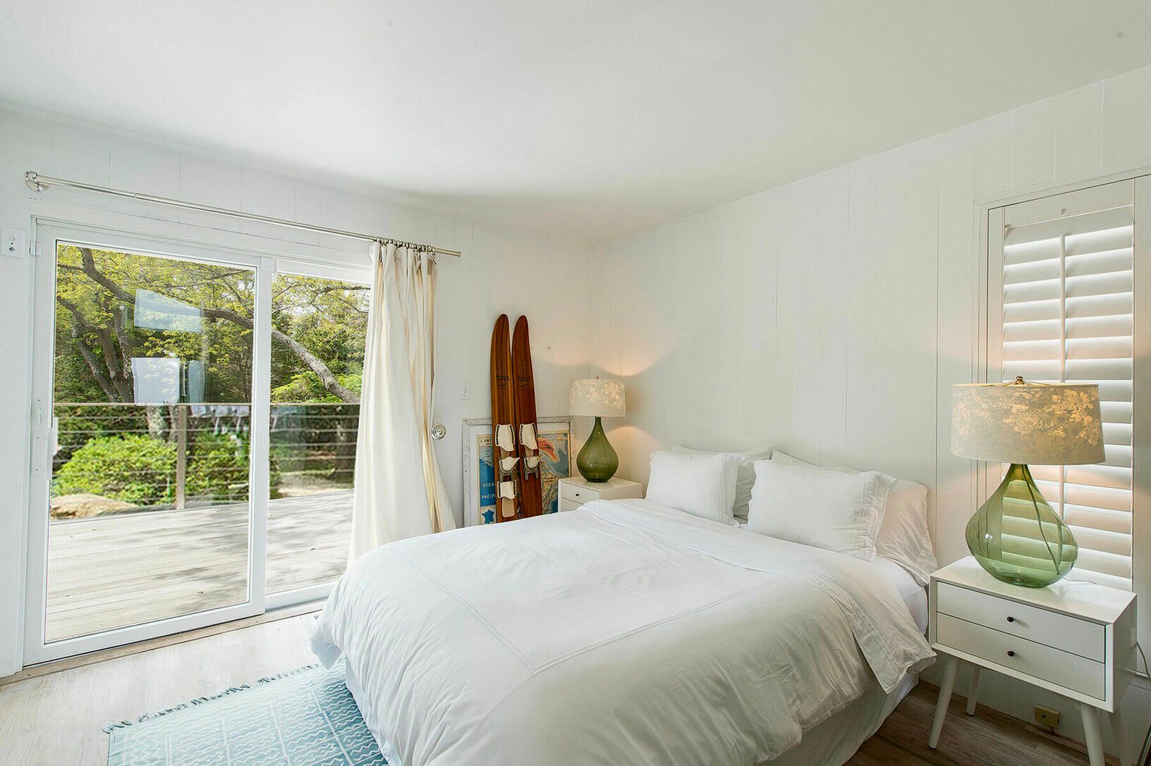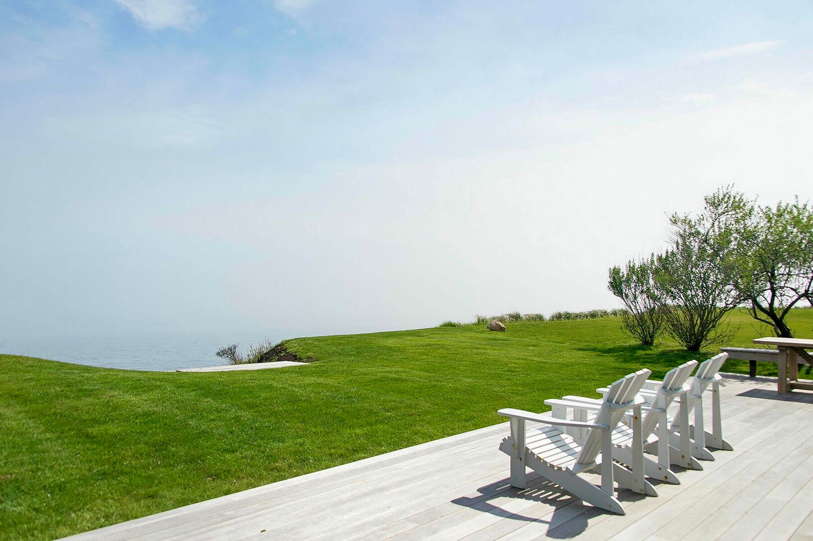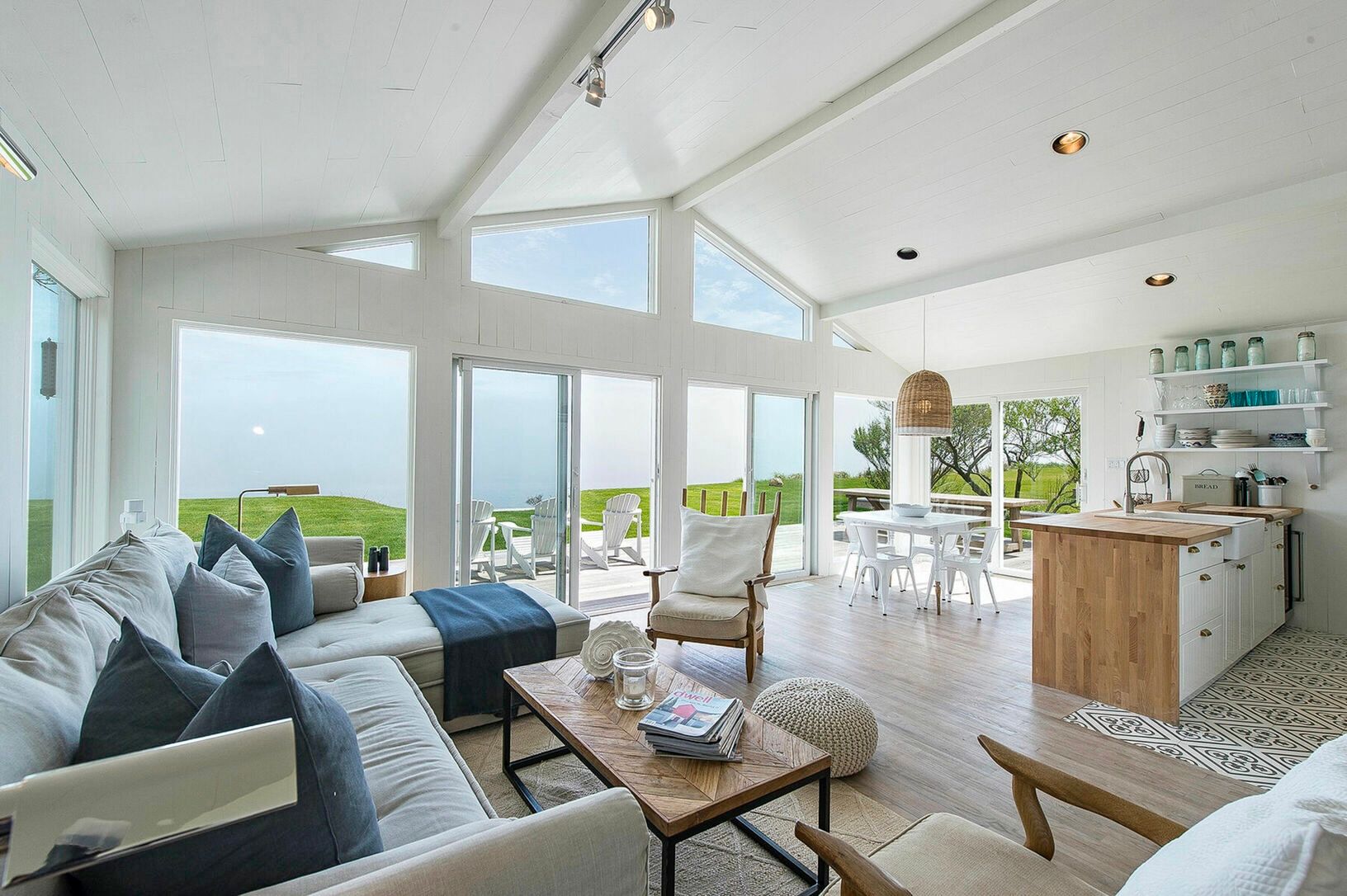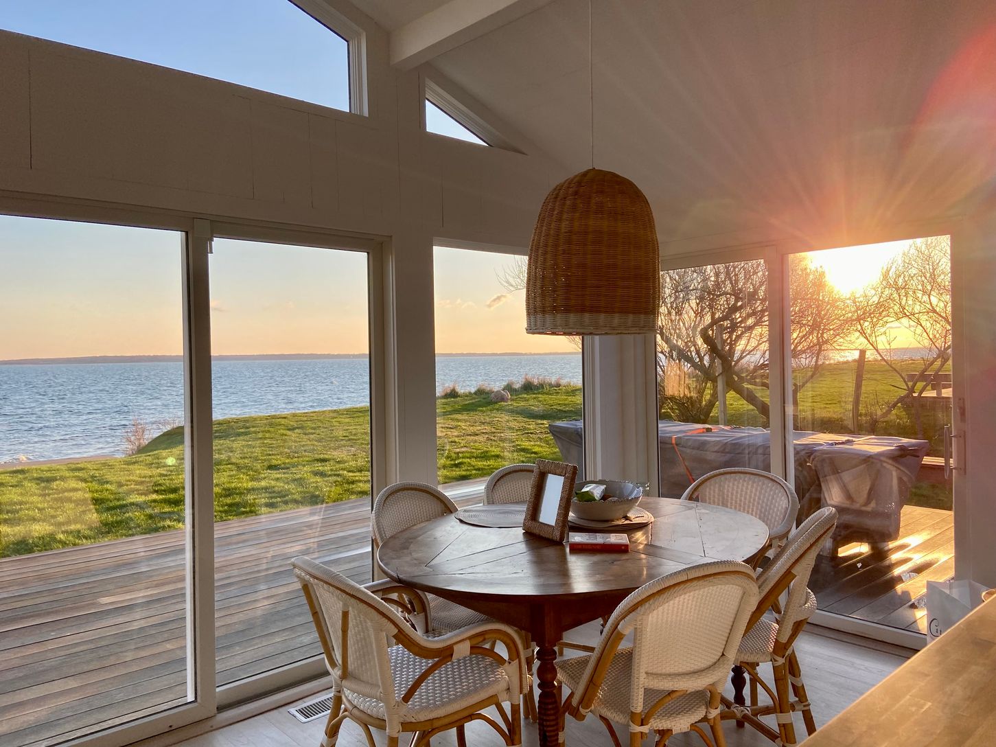 This chic waterfront beach house is perfectly sited on Gardiners Bay with an expansive open lawn in a most magical setting. Calm waters invite paddle boarding, kayaking and any other water sports you like. Stunning bay views are captured from nearly every vantage point of this wonderful two bedroom oasis. Both living room and dining room have walls of glass doors that open onto a waterside deck ideal for al fresco dining. A well stocked ch