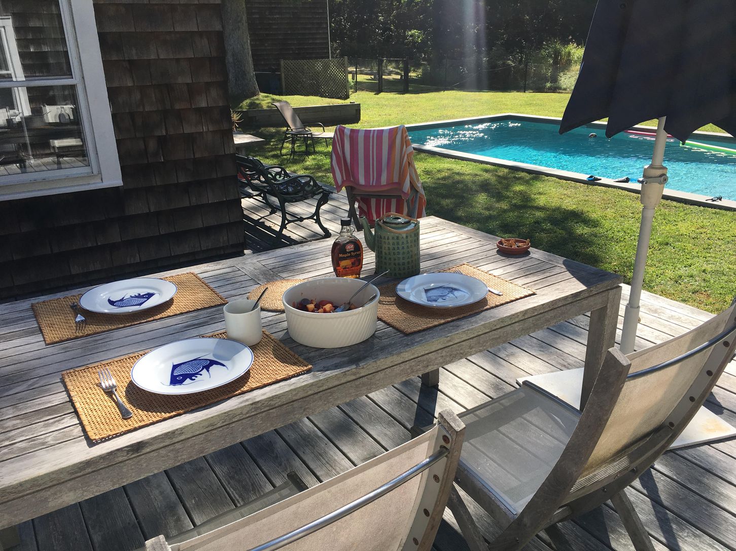 Escape to this charming summer rental on Old Stone Highway in East Hampton. This comfortably casual 4-bedroom, 2-bath home boasts a beautiful yard featuring a saltwater pool and ample space to relax. Enjoy dining al fresco on the large deck or unwind on the covered porch. The inviting eat-in kitchen comes complete with a farmhouse table for ten, perfect for meals with family and friends. Just a short distance to the ocean and bay beaches. Amb