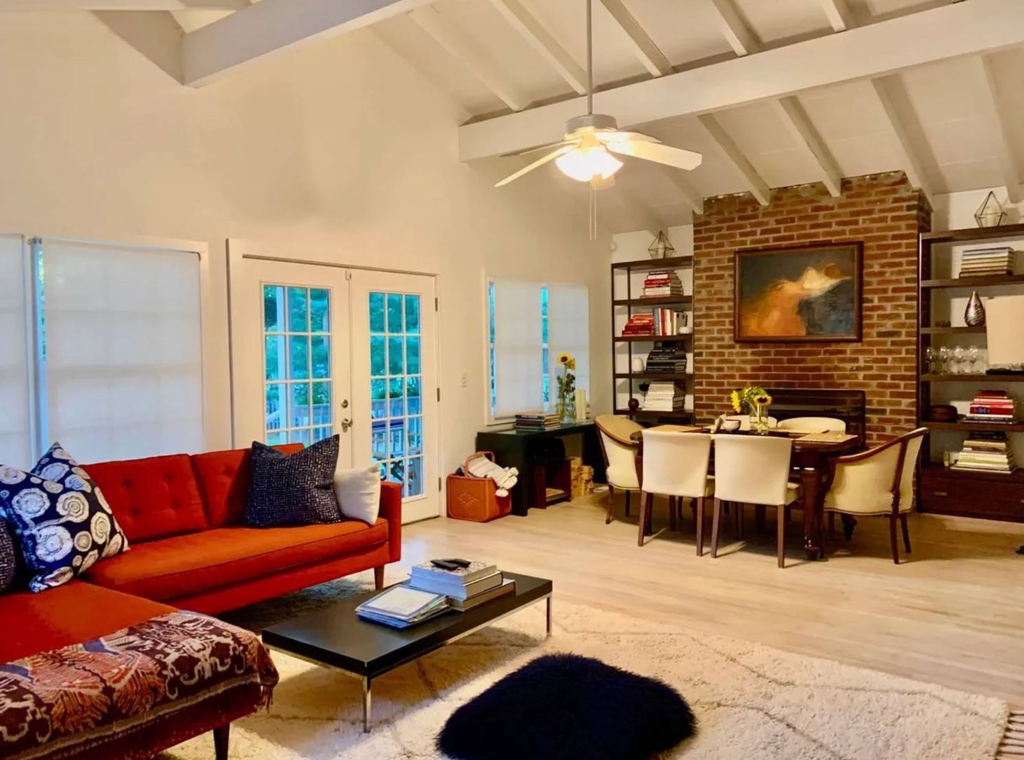 Hardwood floors flow throughout the residence, complemented by a light-filled living area centered around a classic fireplace. The ope