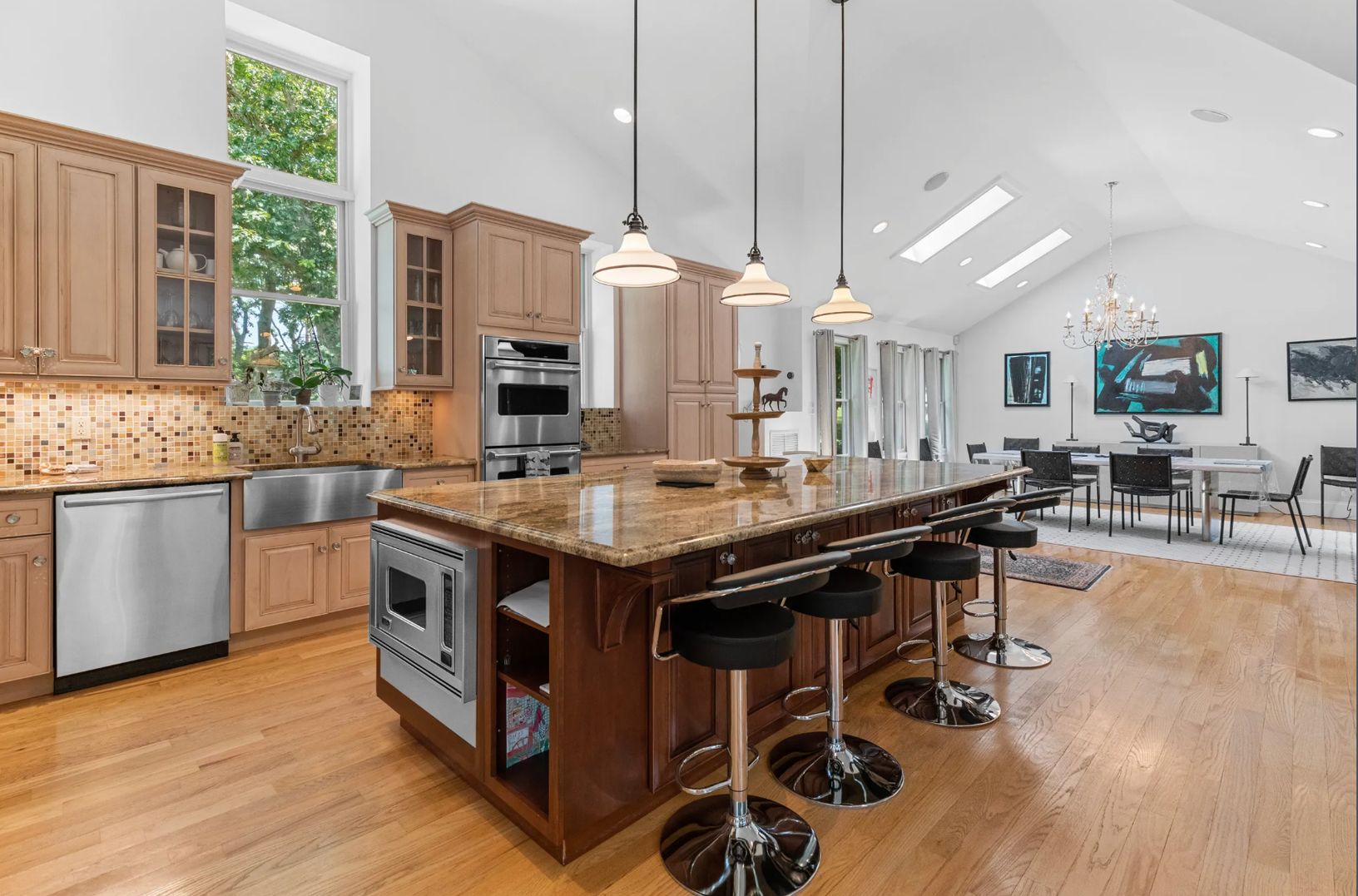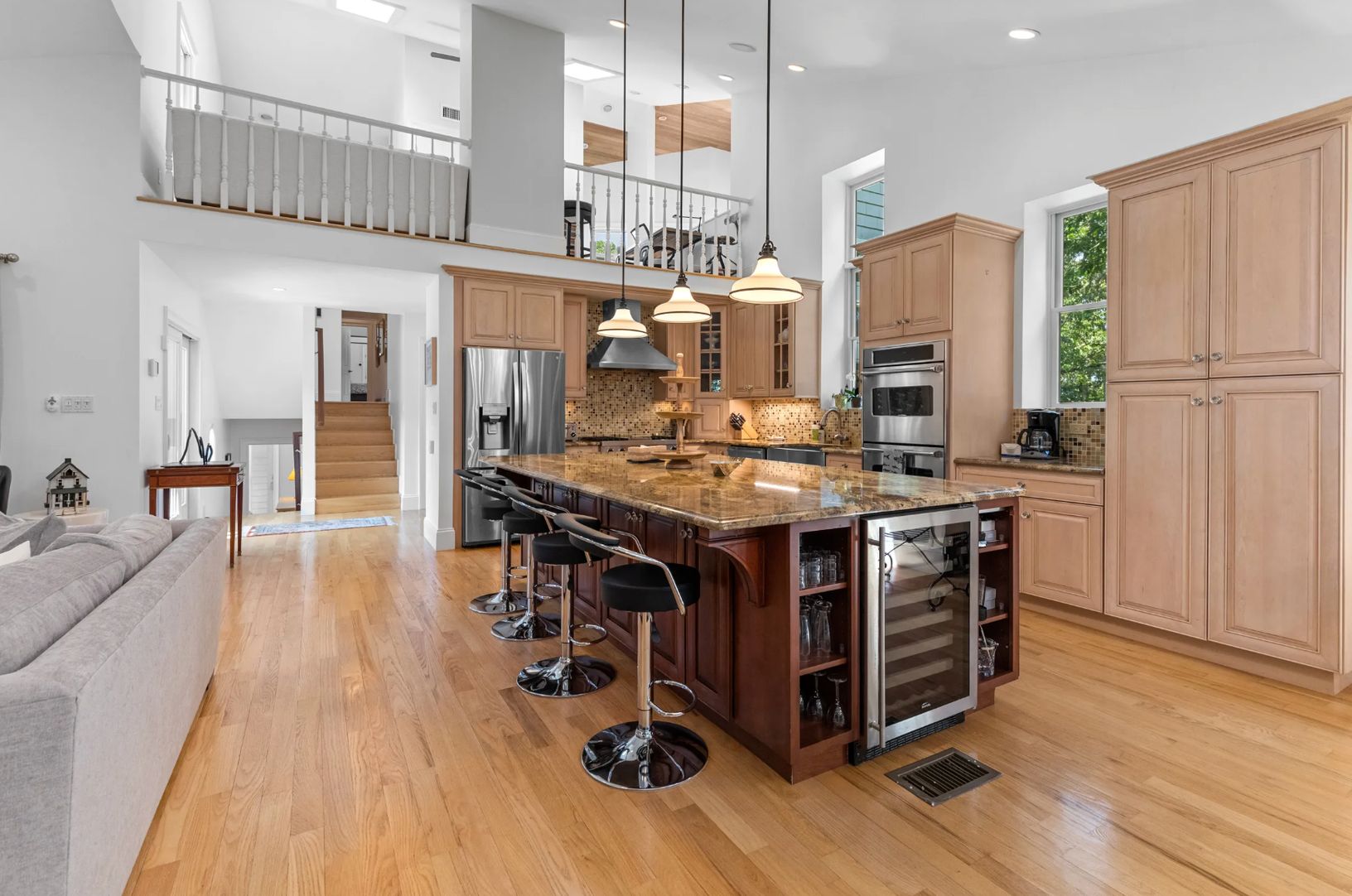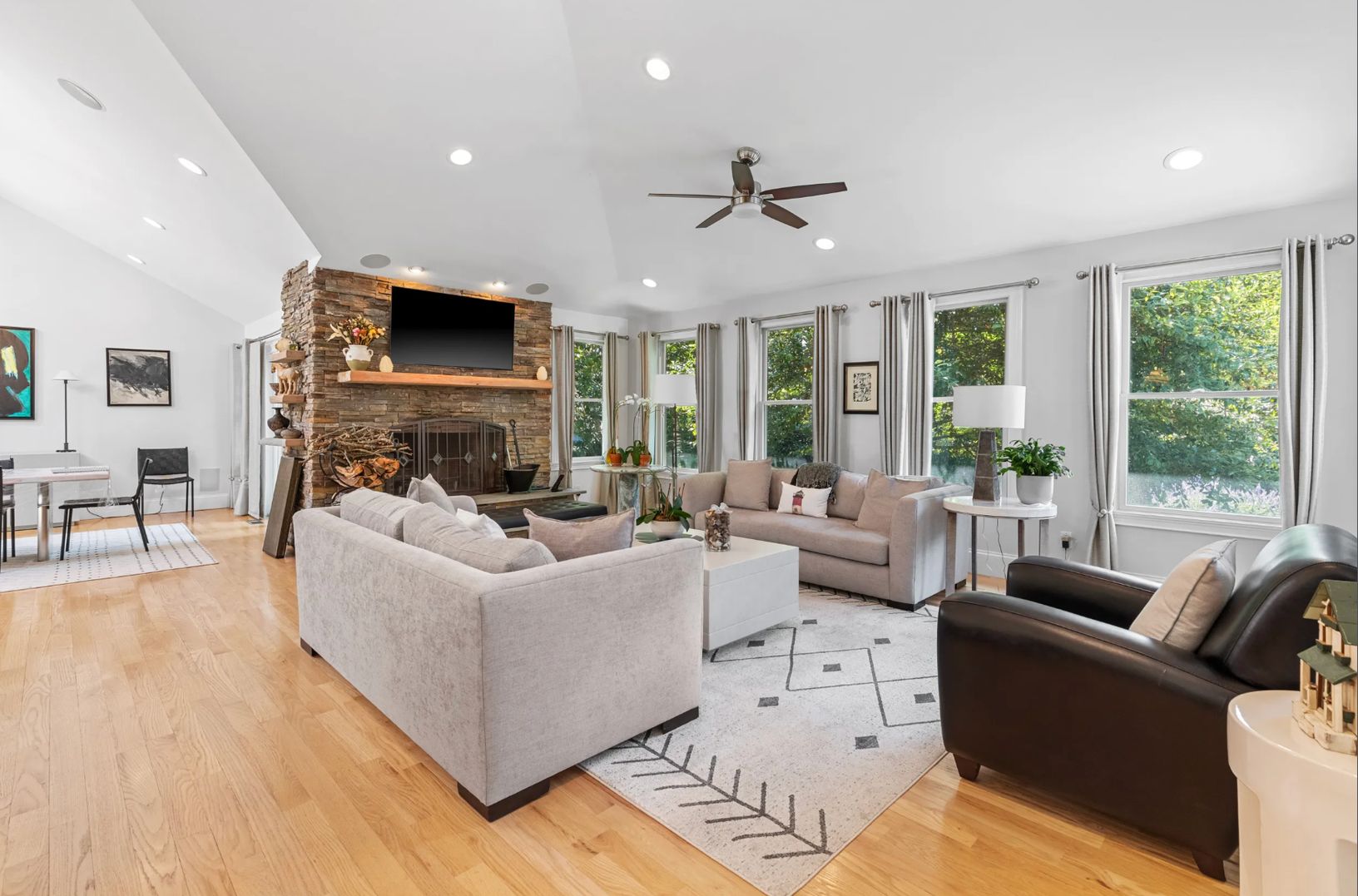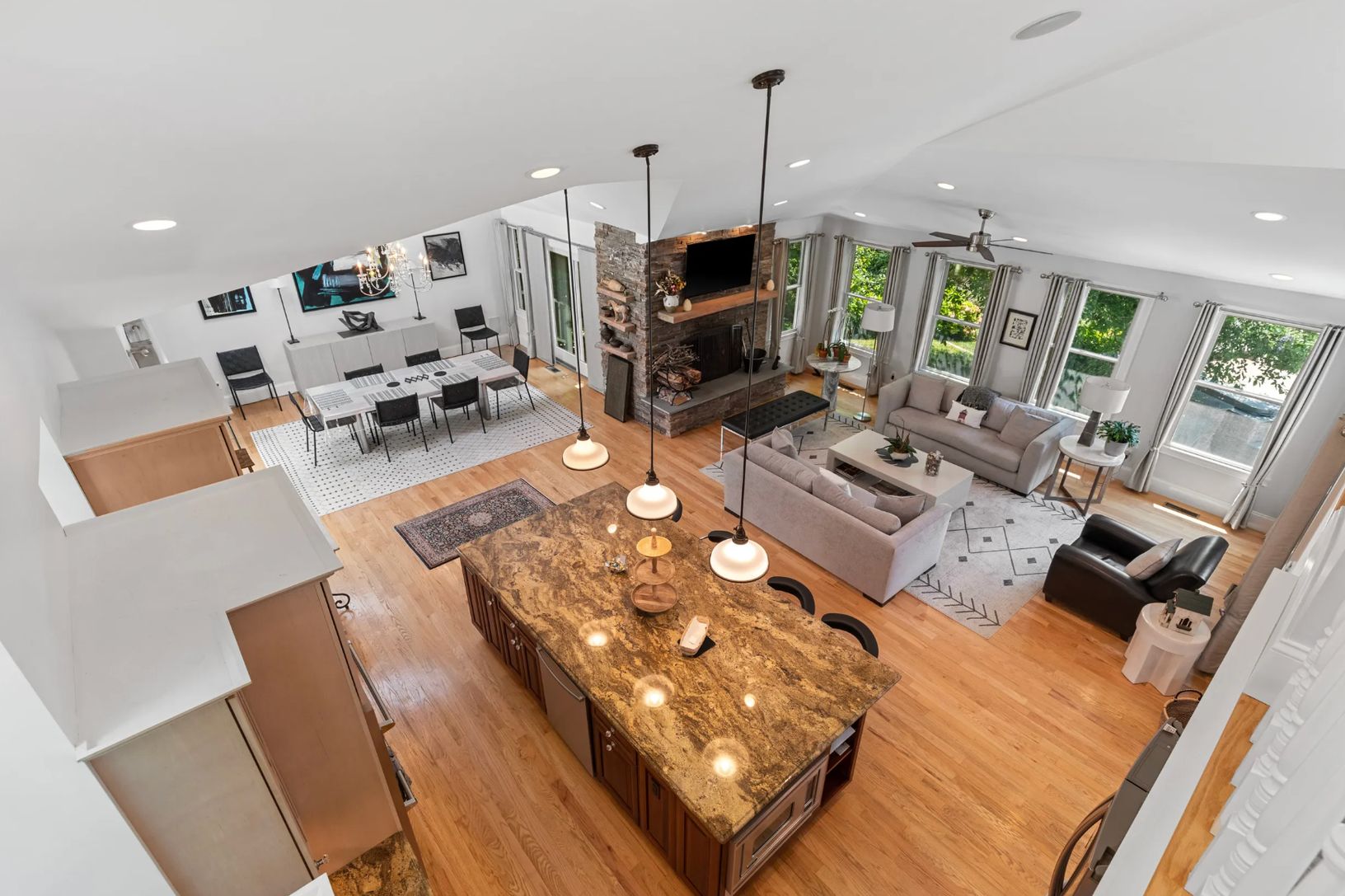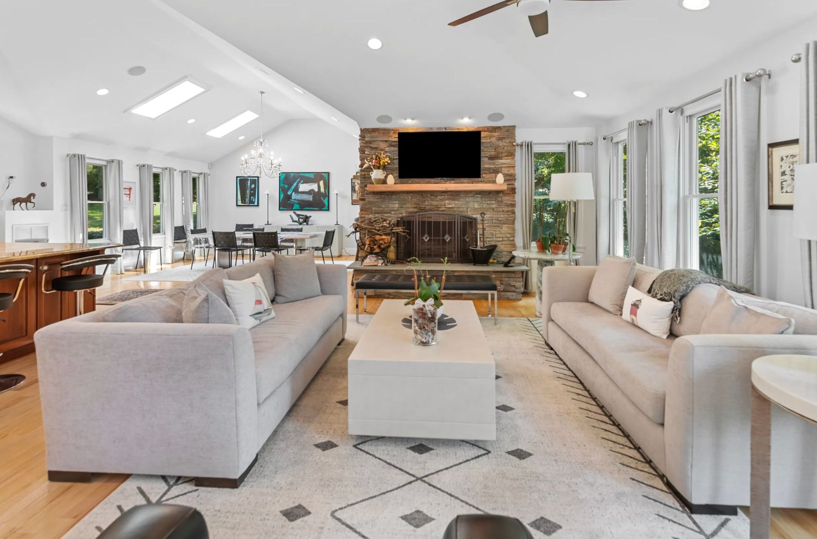 -The open interior areas include a custom kitchen, dining room, and living room featuring a beautiful stone fireplace.