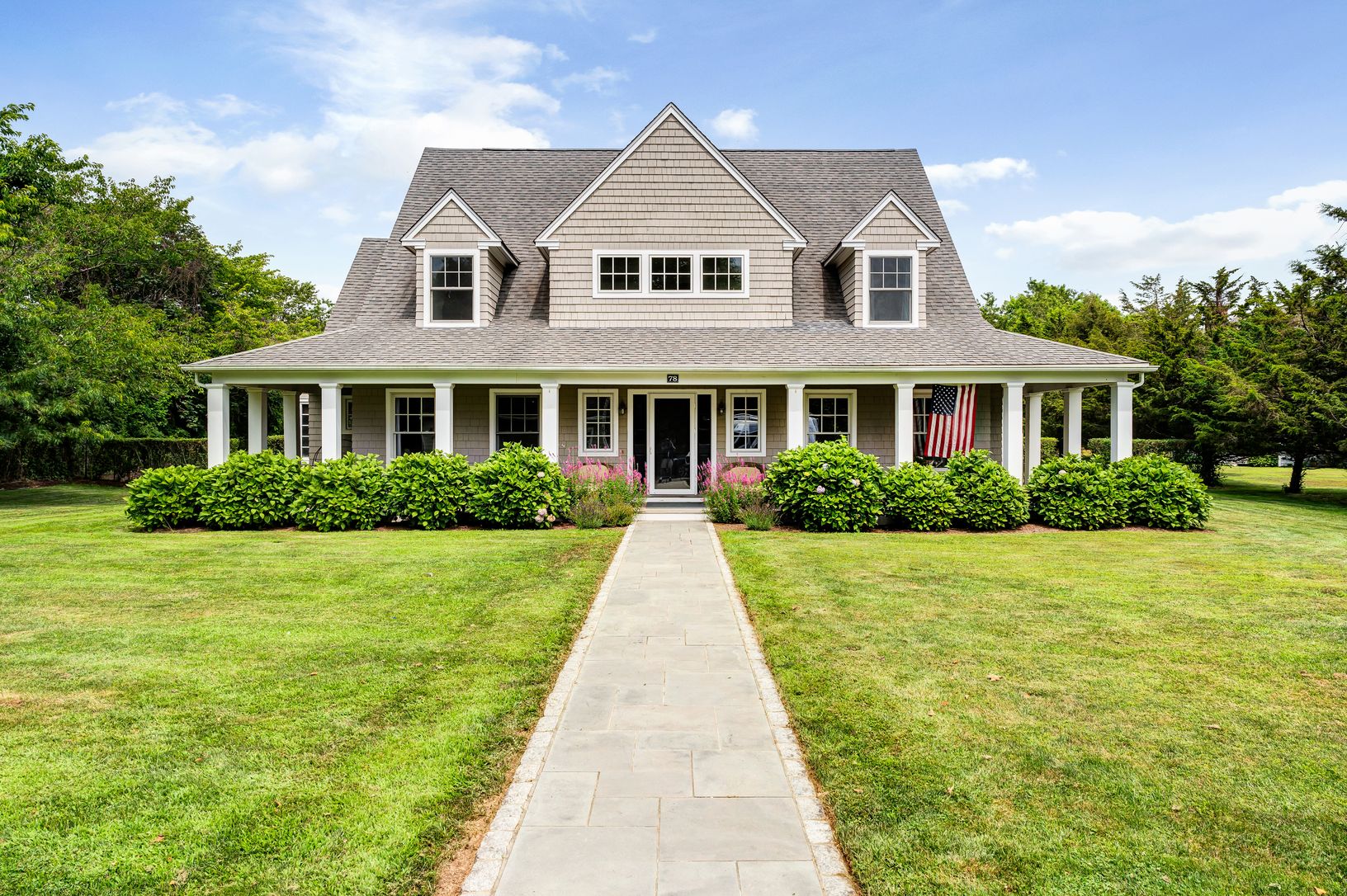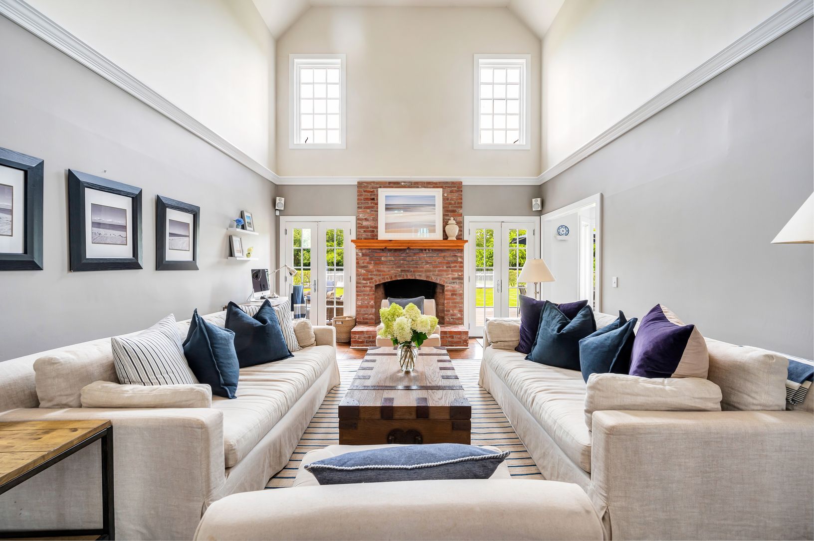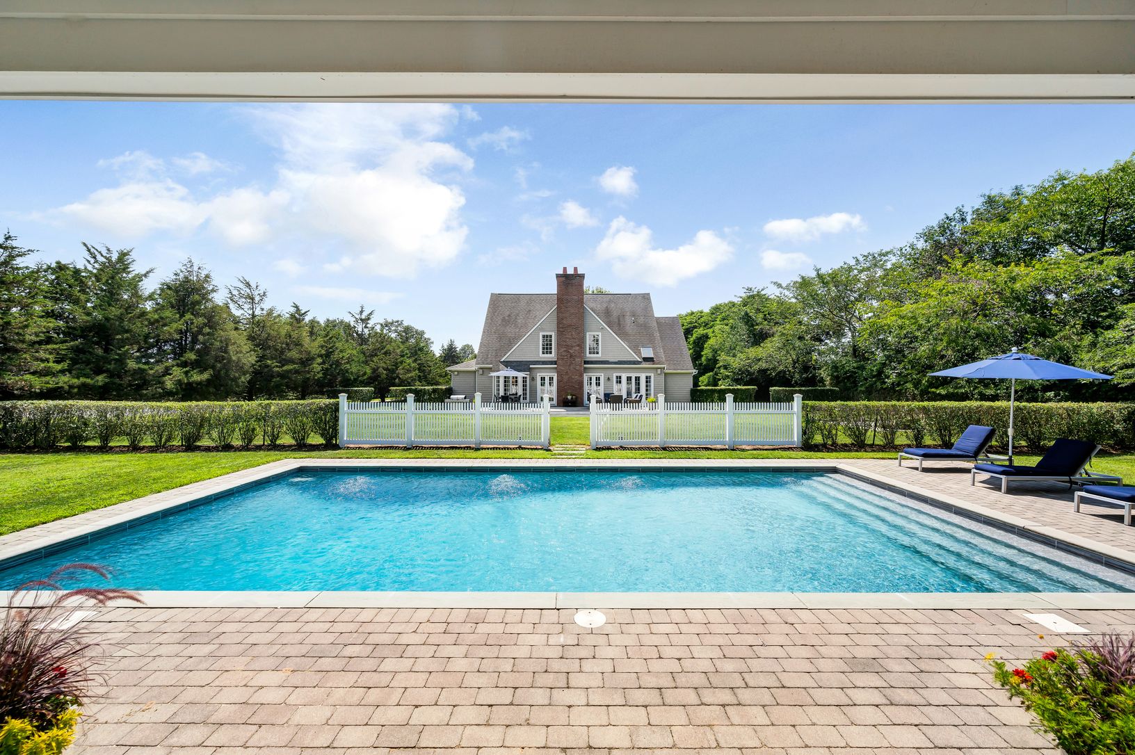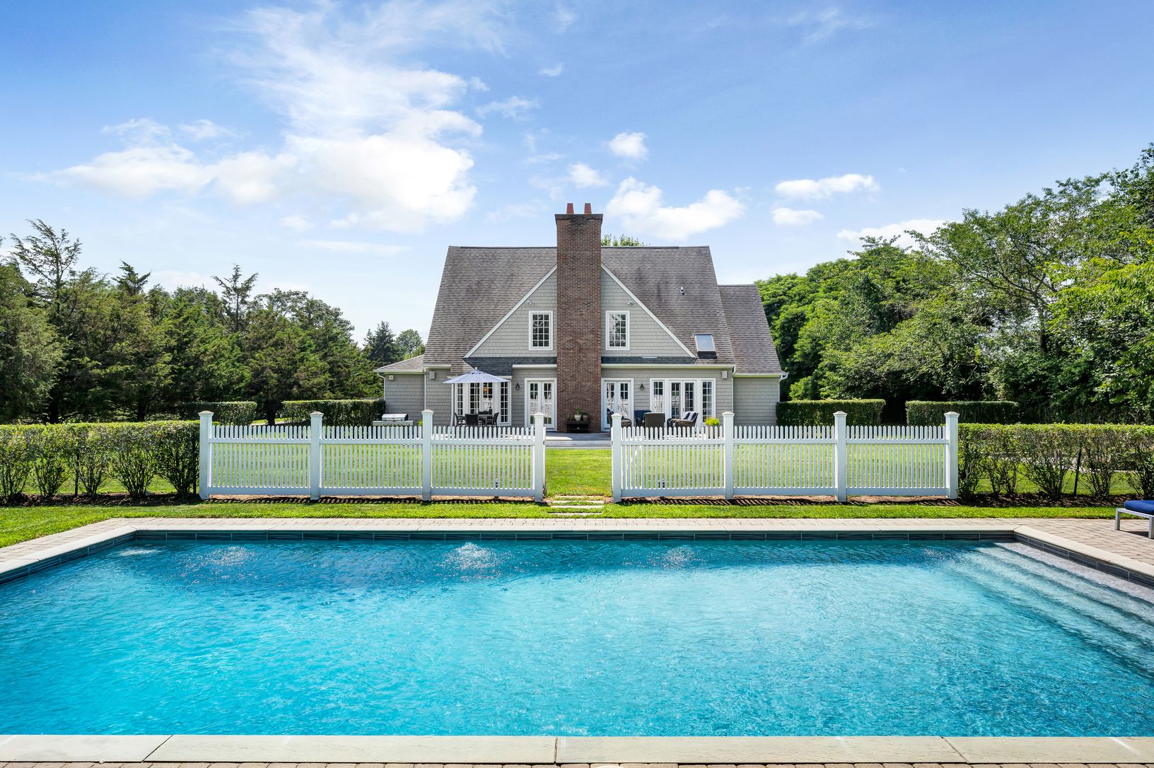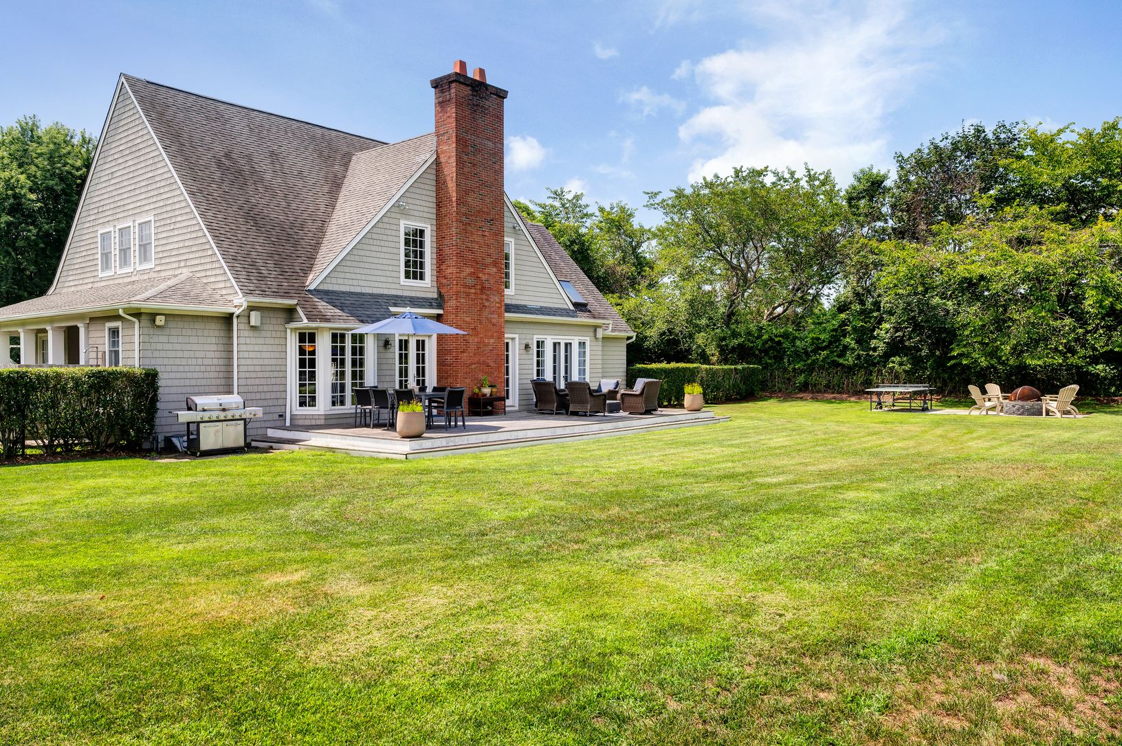 Set right at the edge of East Hampton Village, this elegant four-bedroom, three bath residence is sited on a private, beautifully landscaped acre and designed for refined indoor-outdoor living. The main level offers a sun-drenched living room with fireplace, a sophisticated den, and an open chef's kitchen and dining area ideal for entertaining, along with a gracious first-floor primary suite. Upstairs, three well-appointed guest bedrooms share