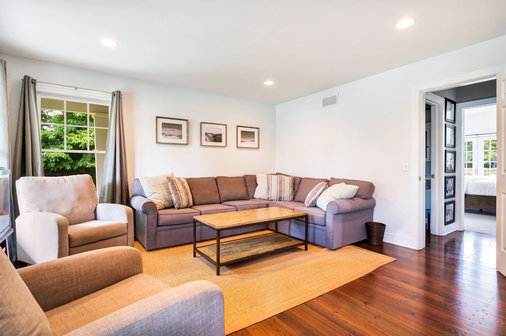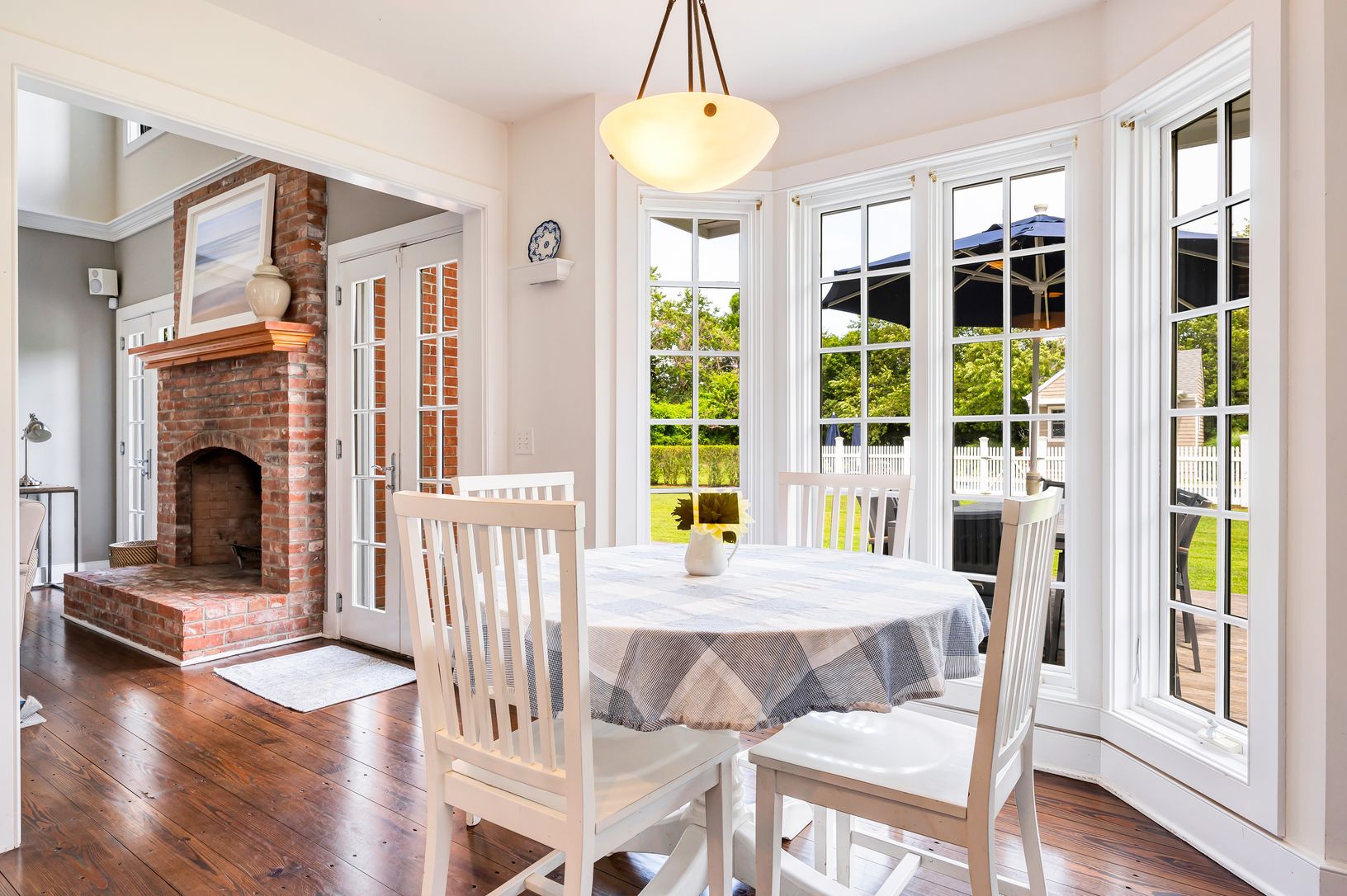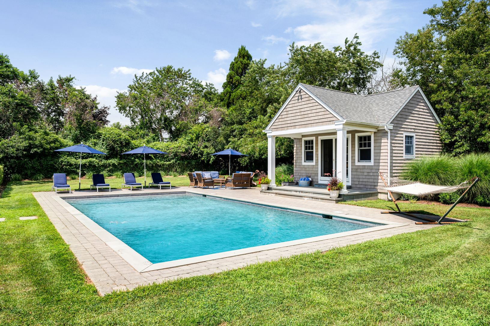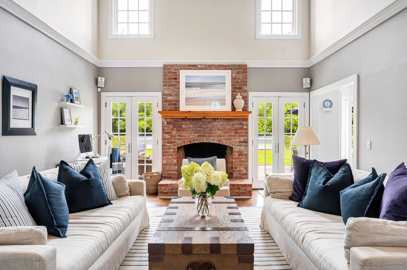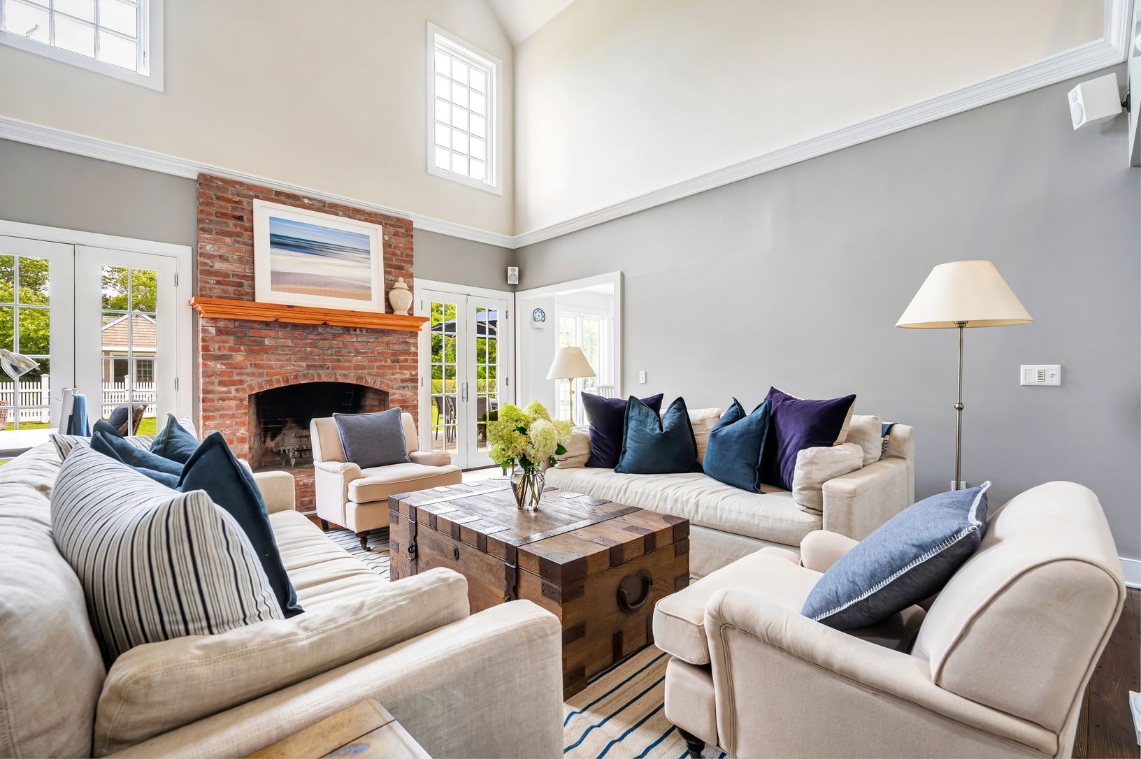 Set right at the edge of East Hampton Village, this elegant four-bedroom, three bath residence is sited on a private, beautifully landscaped acre and designed for refined indoor-outdoor living. The main level offers a sun-drenched living room with fireplace, a sophisticated den, and an open chef's kitchen and dining area ideal for entertaining, along with a gracious first-floor primary suite. Upstairs, three well-appointed guest bedrooms share