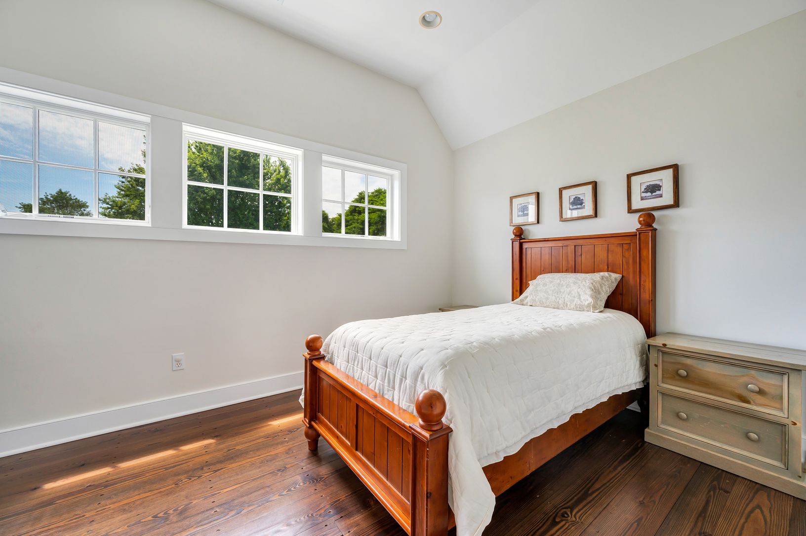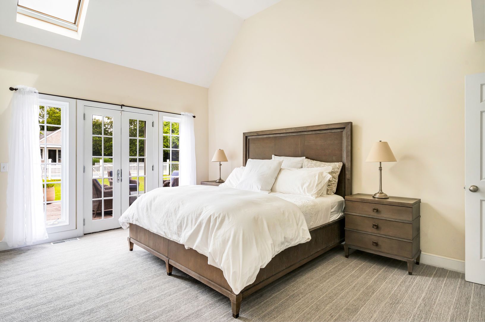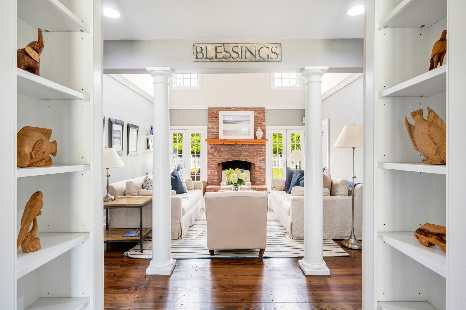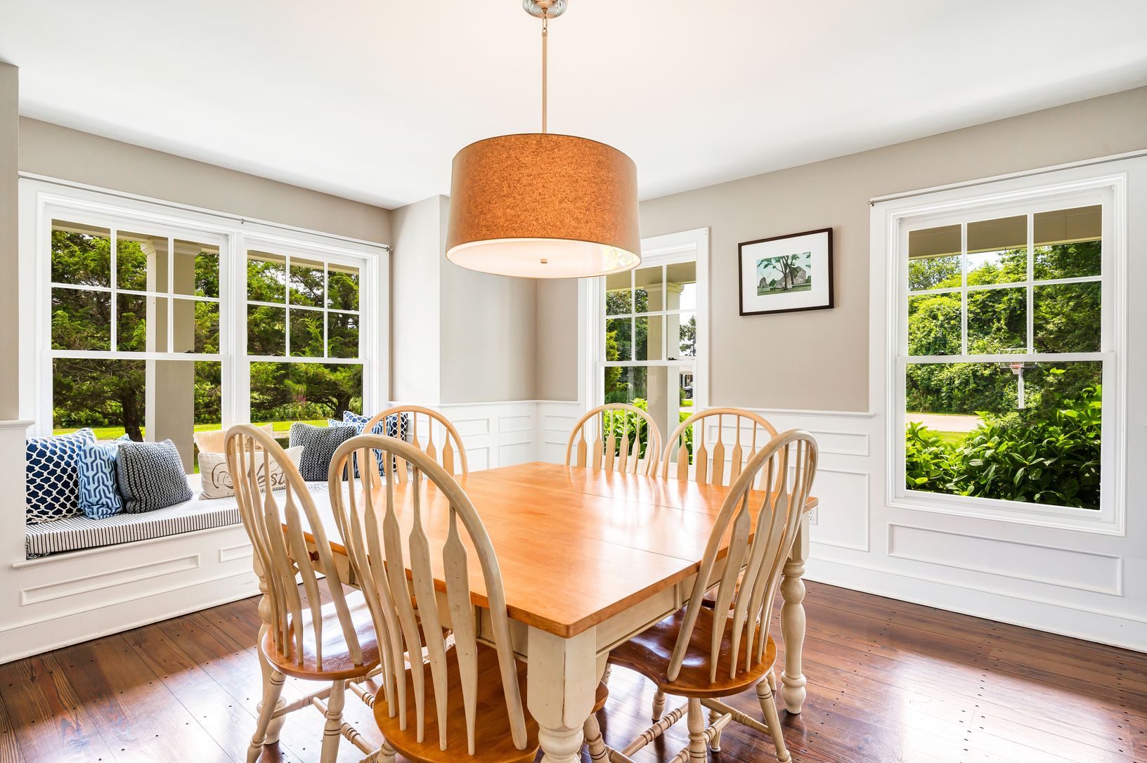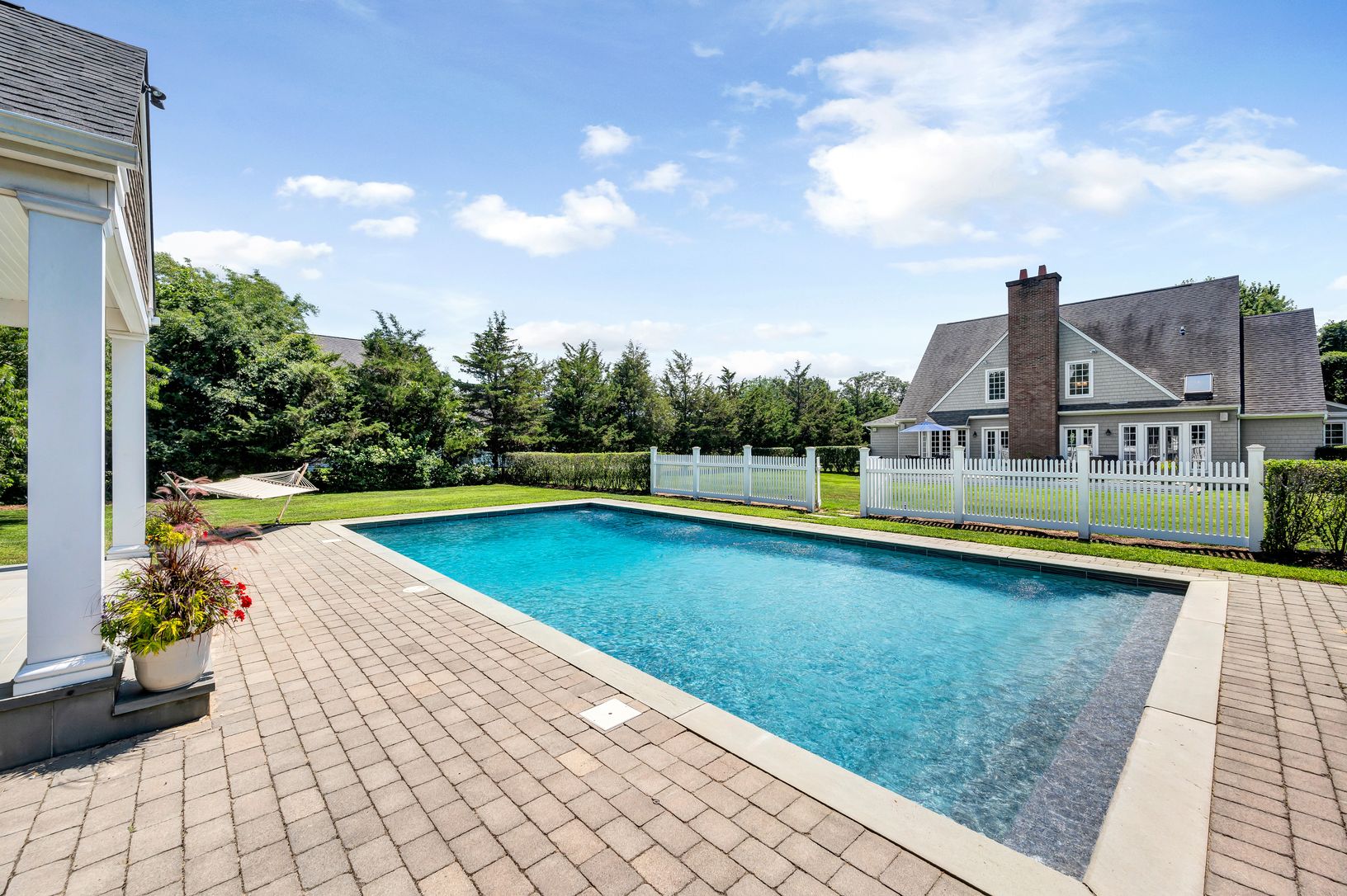 Set right at the edge of East Hampton Village, this elegant four-bedroom, three bath residence is sited on a private, beautifully landscaped acre and designed for refined indoor-outdoor living. The main level offers a sun-drenched living room with fireplace, a sophisticated den, and an open chef's kitchen and dining area ideal for entertaining, along with a gracious first-floor primary suite. Upstairs, three well-appointed guest bedrooms share