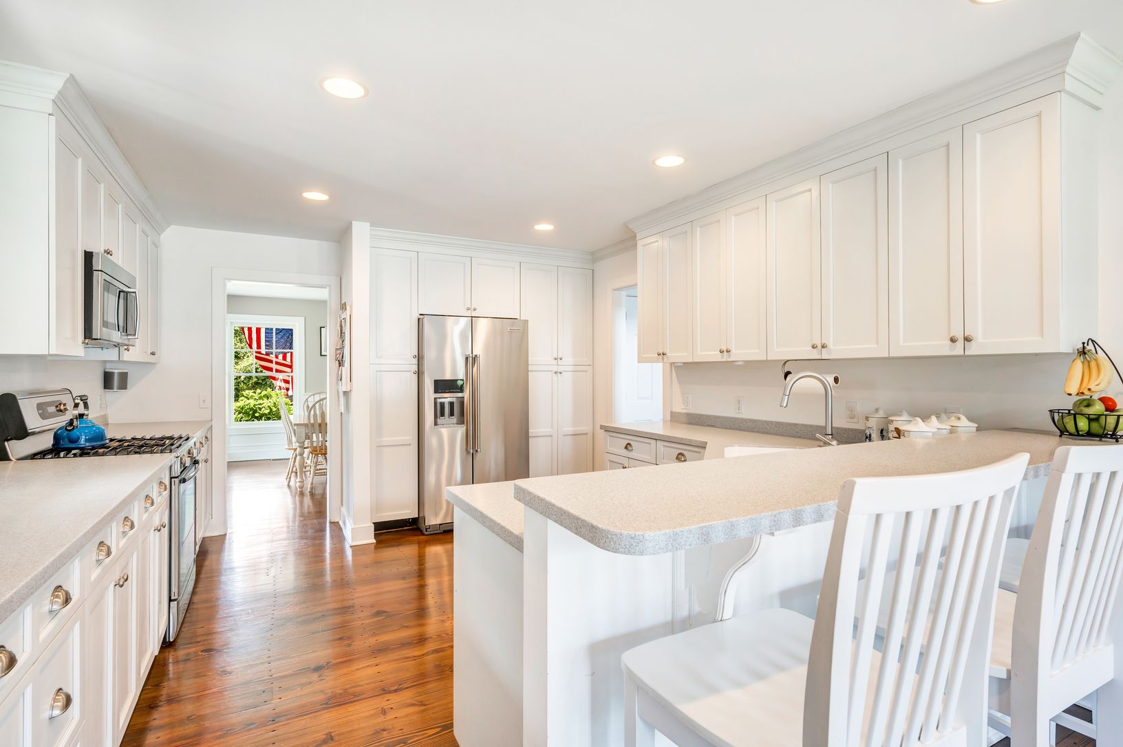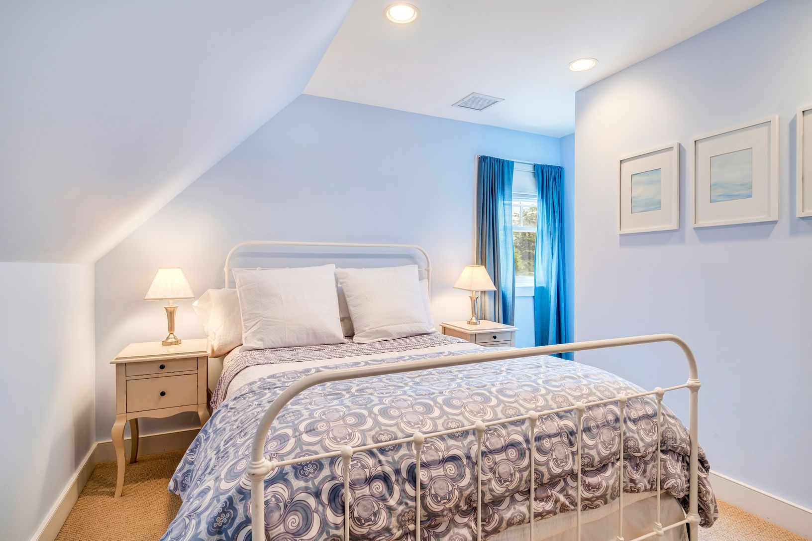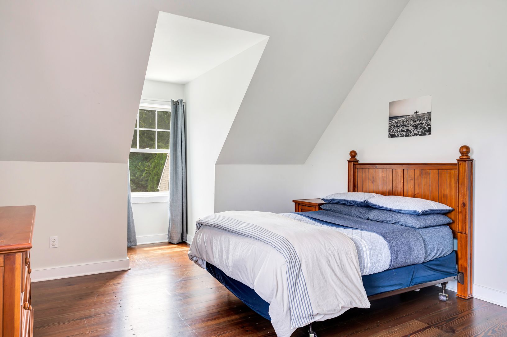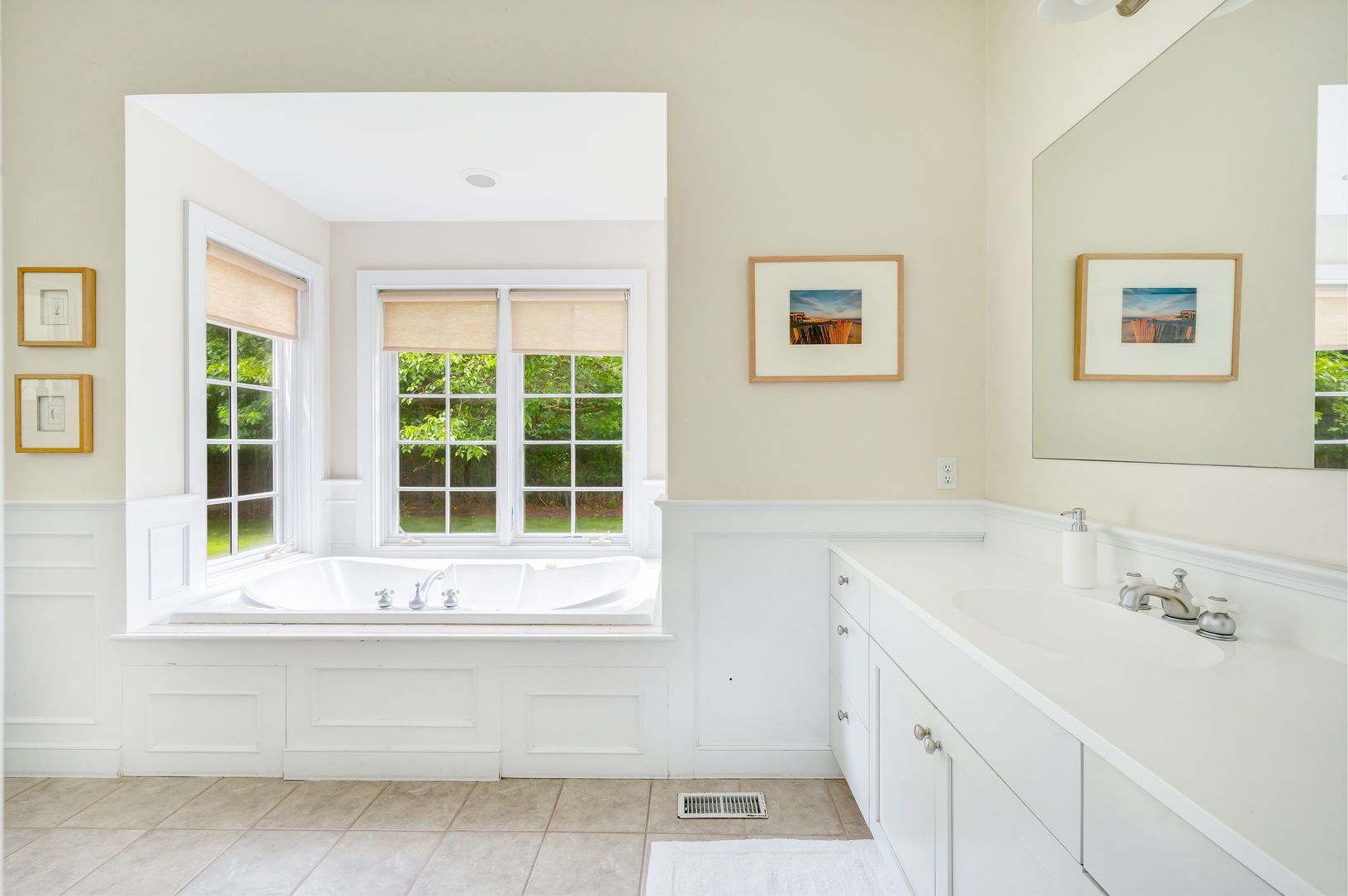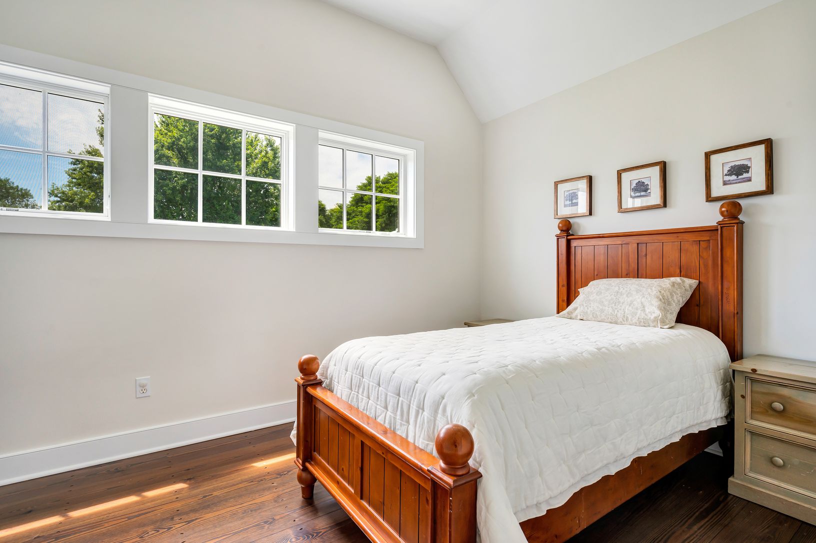 Set right at the edge of East Hampton Village, this elegant four-bedroom, three bath residence is sited on a private, beautifully landscaped acre and designed for refined indoor-outdoor living. The main level offers a sun-drenched living room with fireplace, a sophisticated den, and an open chef's kitchen and dining area ideal for entertaining, along with a gracious first-floor primary suite. Upstairs, three well-appointed guest bedrooms share