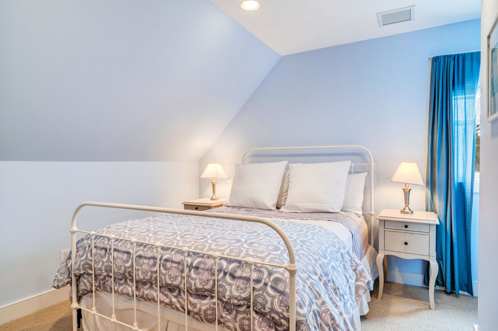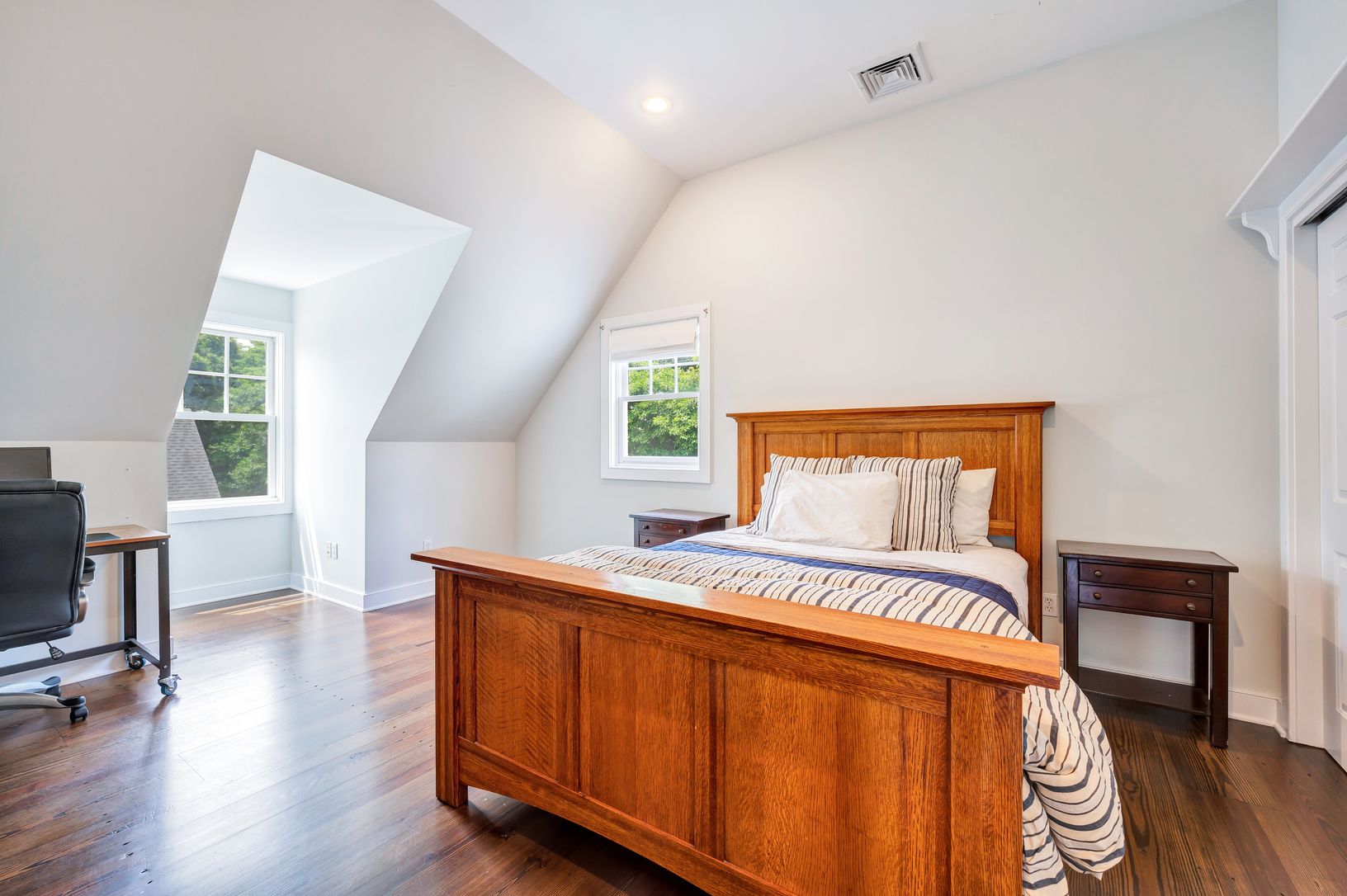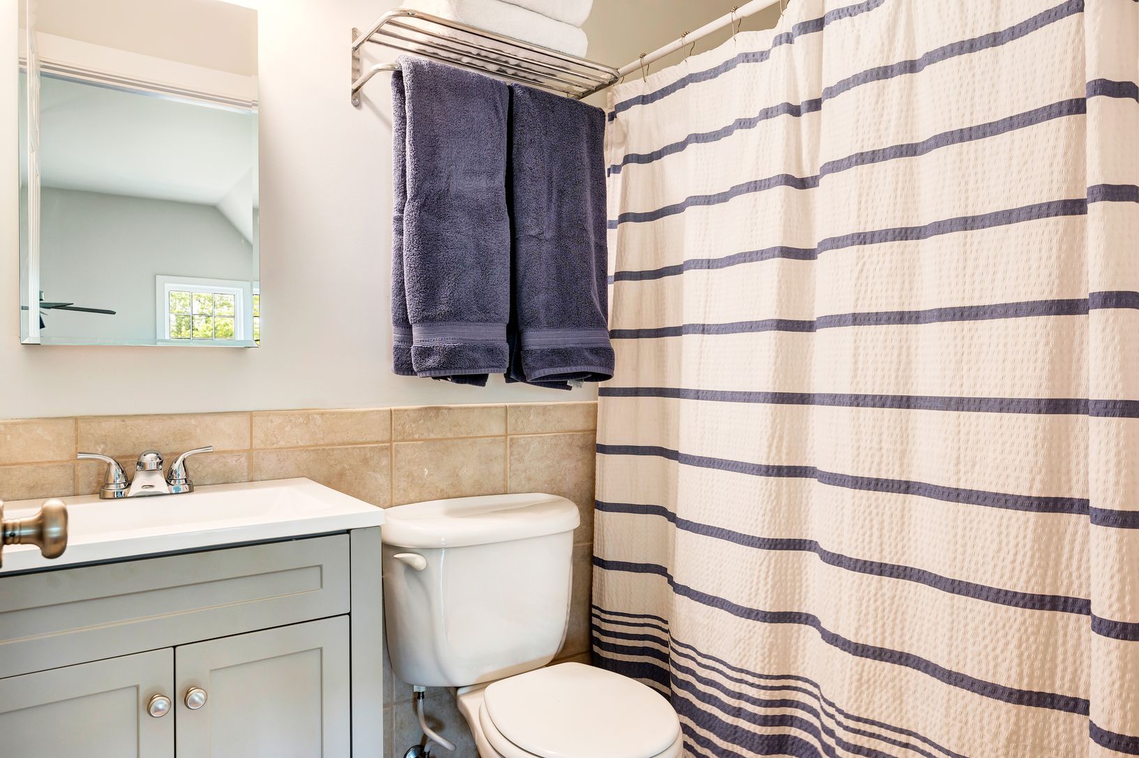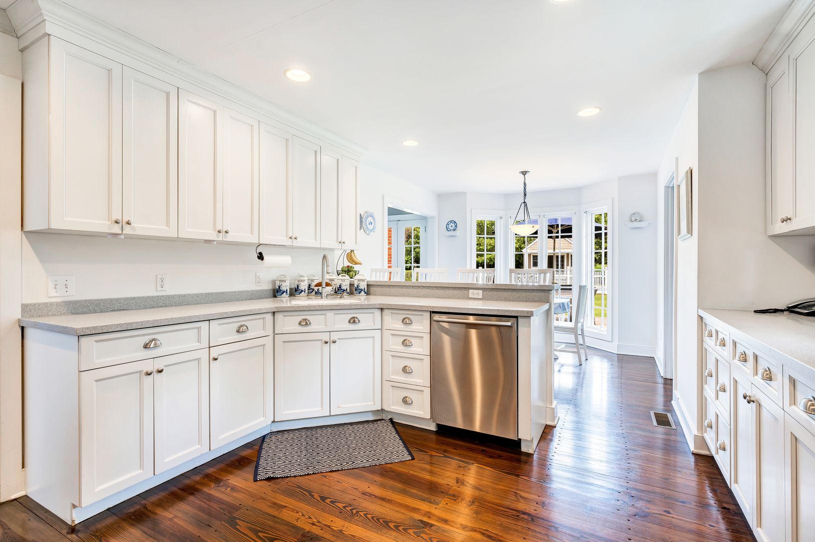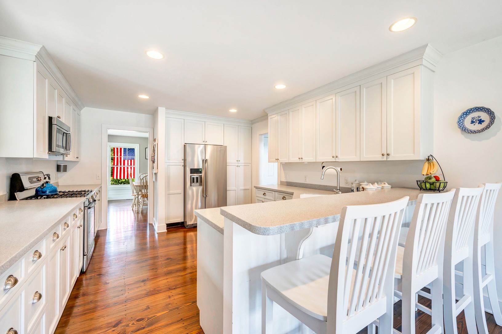 Set right at the edge of East Hampton Village, this elegant four-bedroom, three bath residence is sited on a private, beautifully landscaped acre and designed for refined indoor-outdoor living. The main level offers a sun-drenched living room with fireplace, a sophisticated den, and an open chef's kitchen and dining area ideal for entertaining, along with a gracious first-floor primary suite. Upstairs, three well-appointed guest bedrooms share