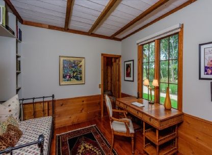 Located just 1.5+/- miles to beaches and town, this four bedroom, three and a half bath house is private, but extremely accessible to Amagansett and East Hampton. You'll feel totally relaxed and like you are a million miles from the city in this rustic feeling but totally modern home. Offering a library, three fireplaces and a double height living room. New Gunite lap pool with gas grill and wood and blue stone patio all surrounded by beautifu