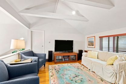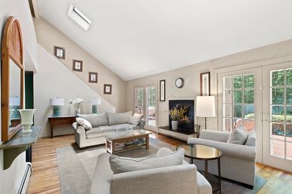 Rental Registration #: 22-634. Handsome and romantic 1,800 s.f. contemporary in super convenient area of East Hampton, only 5 minutes from the Village and under 10 minutes to the ocean. Double height open living room with fireplace and dining room, updated kitchen, king master suite on main floor. with doors out to deck. Upstairs you'll find 2 more bedrooms, full bath and open den TV area. Lovely furnishings including some antiques. 20x40 heat