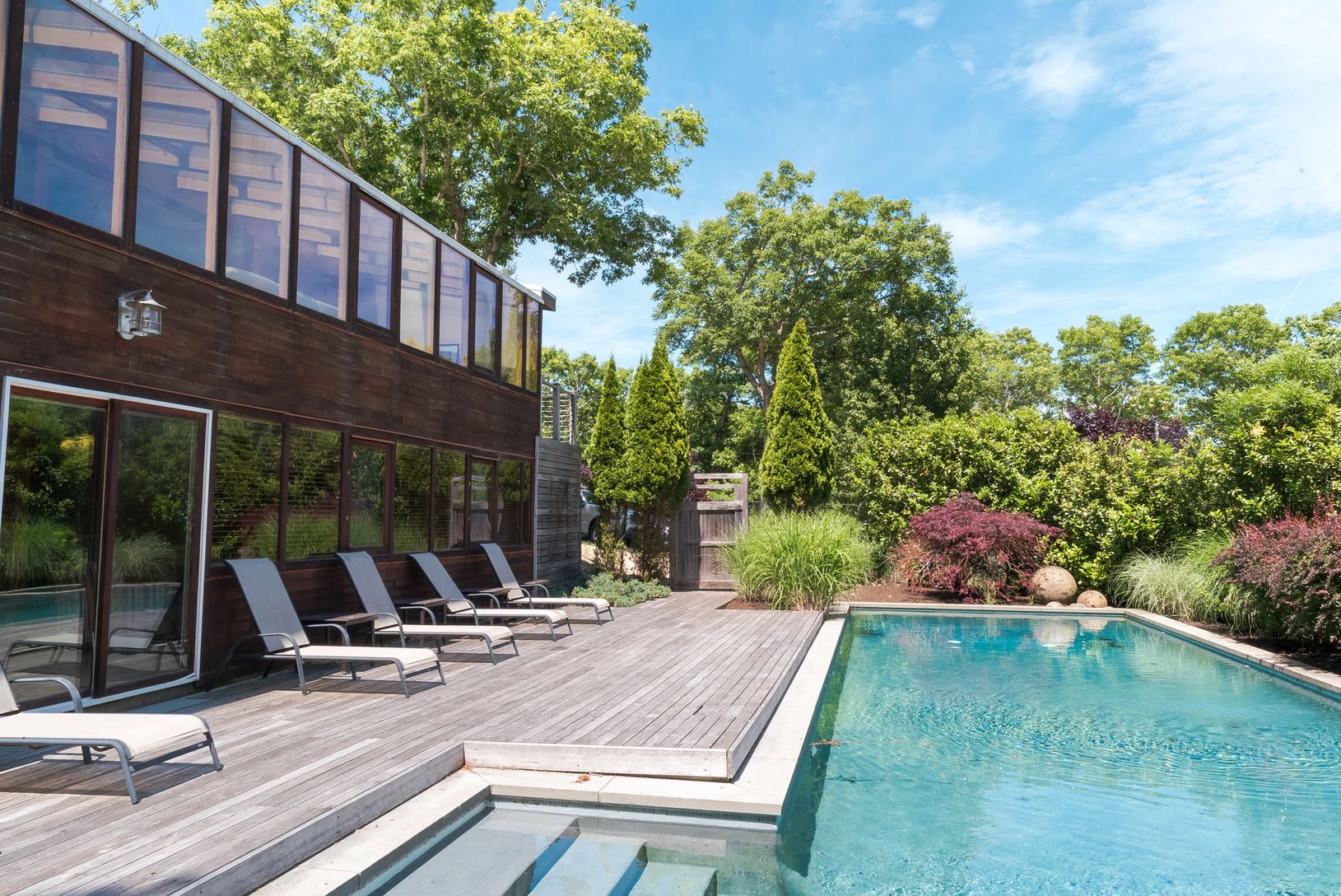 Rental Registration #: 18-1902 This sunny, one-of-a-kind East Hampton contemporary is set on a hiltop, surrounded by lush landscaping. Completely renovated/expanded in 2008, this stunning home has total privacy, walls of windows, a wide open floor plan, a gunite pool with fountains, 4 en-suite bedrooms, 5 1/2 bathrooms, an office/den, a Chef's Kitchen and tons of space for entertaining. On the main floor you'll discover an oversized living roo