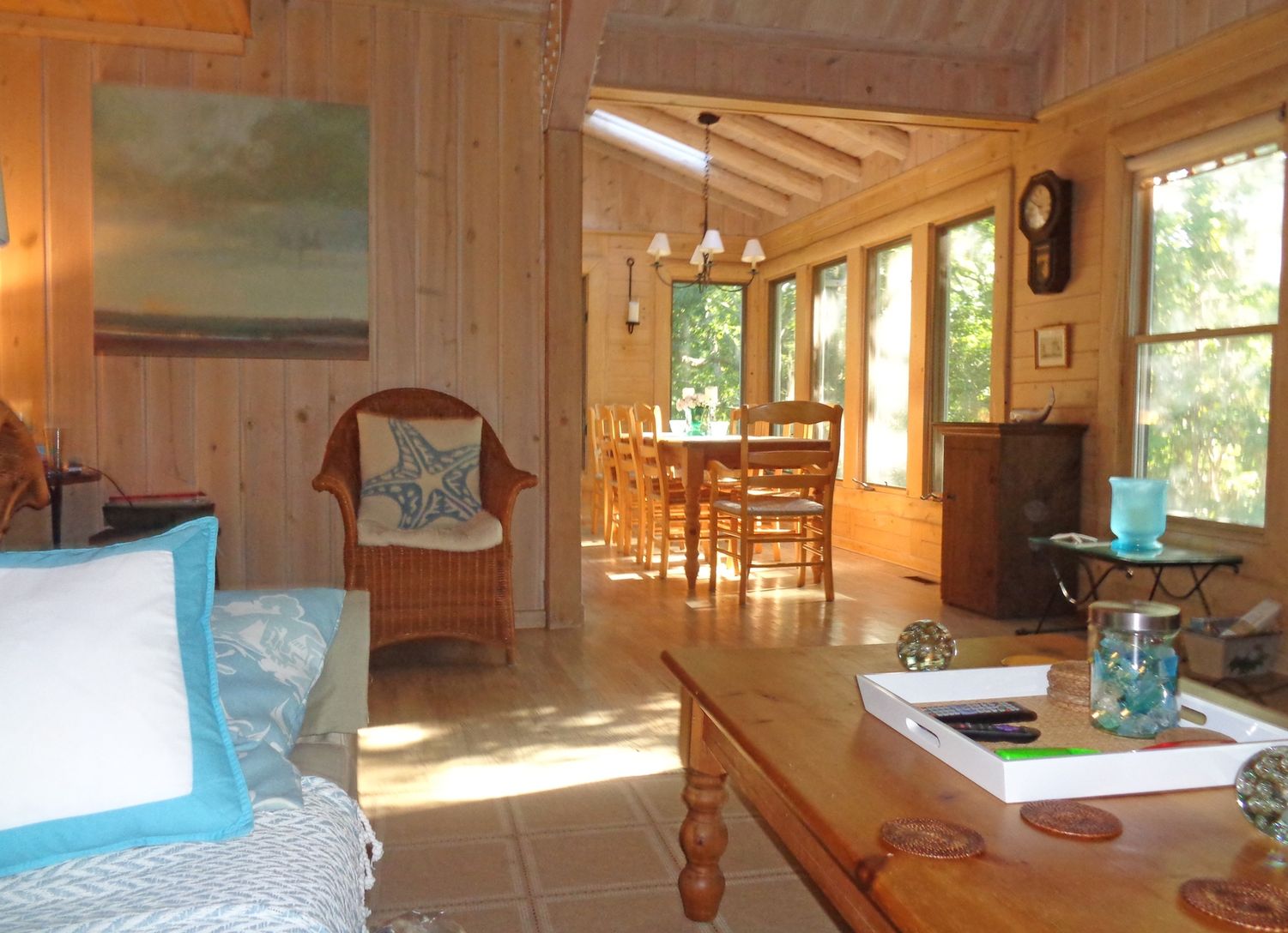 Lovely,traditional tranquil escape located in 56 Shoridge Road. 3 large bedrooms, 2.5 baths on .5 private acres, easy walking to bay beach, 5 minutes to ocean. House is beautifully decorated and appointed. First floor Master suite with marble bath and jacuzzi opens onto porch overlooking sparking swimming pool . Striking bleached pine post and beam interior, with 25 foot cathedral ceilings, Expansive covered porches and outdoor seating areas.A