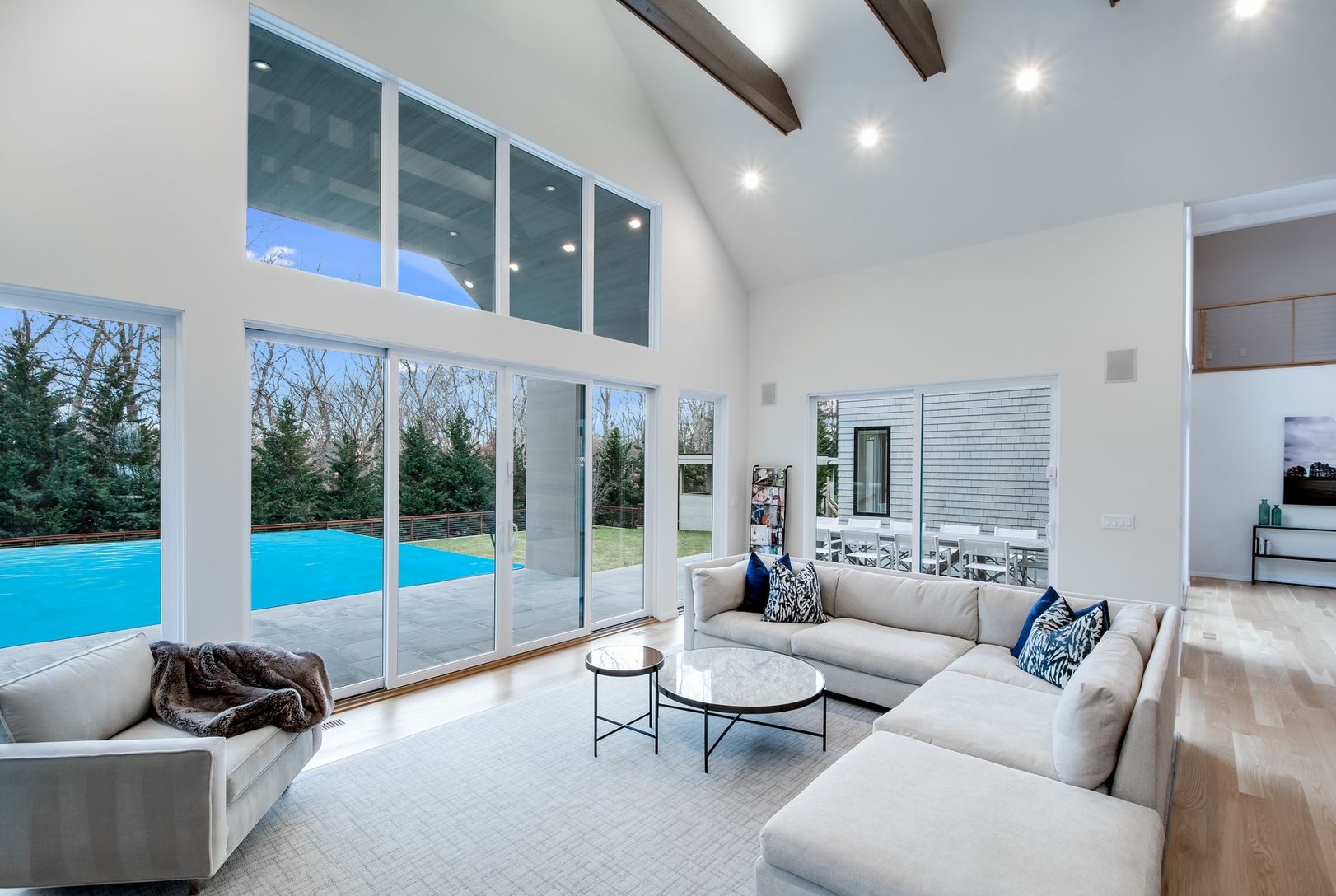 Rental Registration #: 18-169 Completed in 2017, this transitional style home is now available for rent. Clad in rift-cut clear cedar, the authentically barn style facade gives way to a truly modern interior. The grand entrance connecting the bluestone porch to the great room with its vaulted ceilings and fireplace covered in clear cedar. The expansive entertaining area expands into a barn-like space with soaring ceilings centered around a lar
