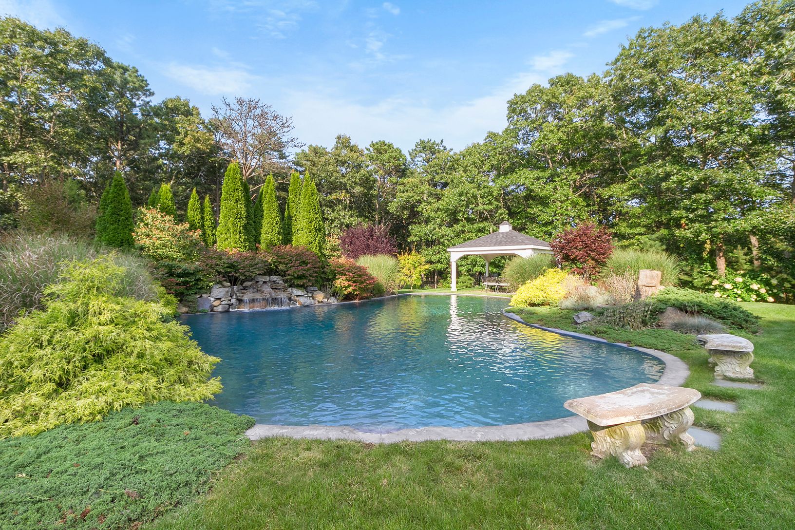 Beautifully maintained with a great room, formal dining room, four en-suite bedrooms, with master on the 1st floor, chef's kitchen, enclosed porch with fireplace, and spacious decking. All of this and more overlooks the gracious five acre estate. Heated gunite pool with waterfall. Beautiful gardens. A wonderful opportunity for your summer vacation..