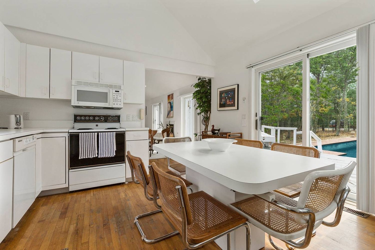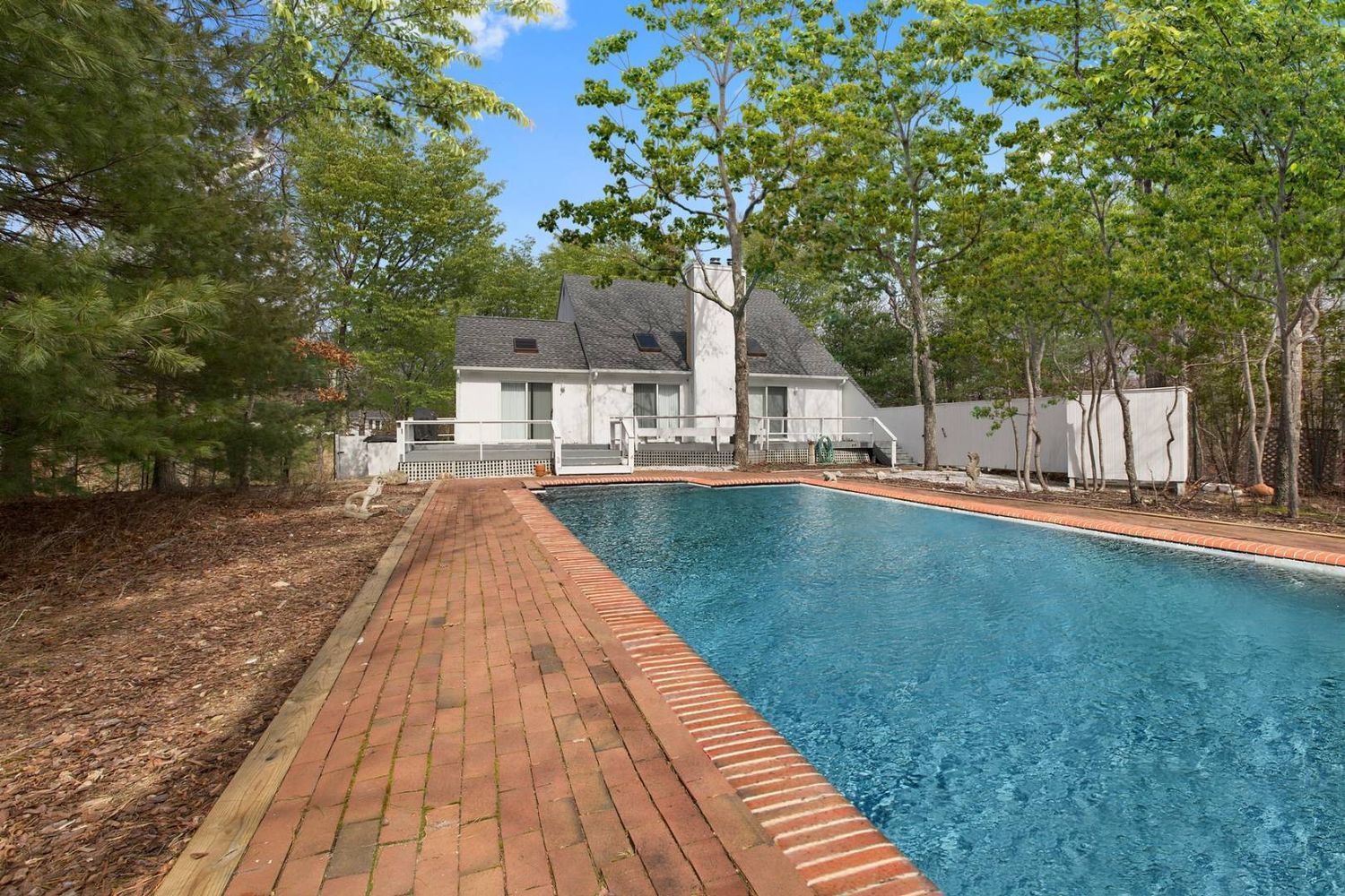 Rental Registration #: 18-709 Bright white contemporary with skylights on a quiet cul-de-sac. Features a living room with fireplace, dining area, eat-in kitchen, den, three bedrooms, two full baths and basement. Additional amenities include central air-conditioning, cable television, outdoor heated shower, retractable awning, large deck, and 18ft. x 36ft. heated pool surrounded by brick terrace. Located one block from Three Mile Harbor. RR#18