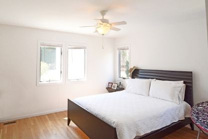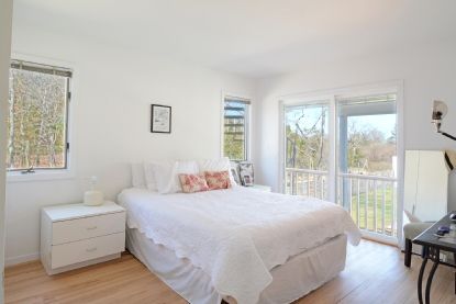 This Contemporary is sited on three quarters of an acre, with four bedrooms and three and a half baths. The pool area has upper and lower decks for outdoor living. New decks, bathrooms and floors. A stone throw from water - and across the street from Three Mile Harbor.