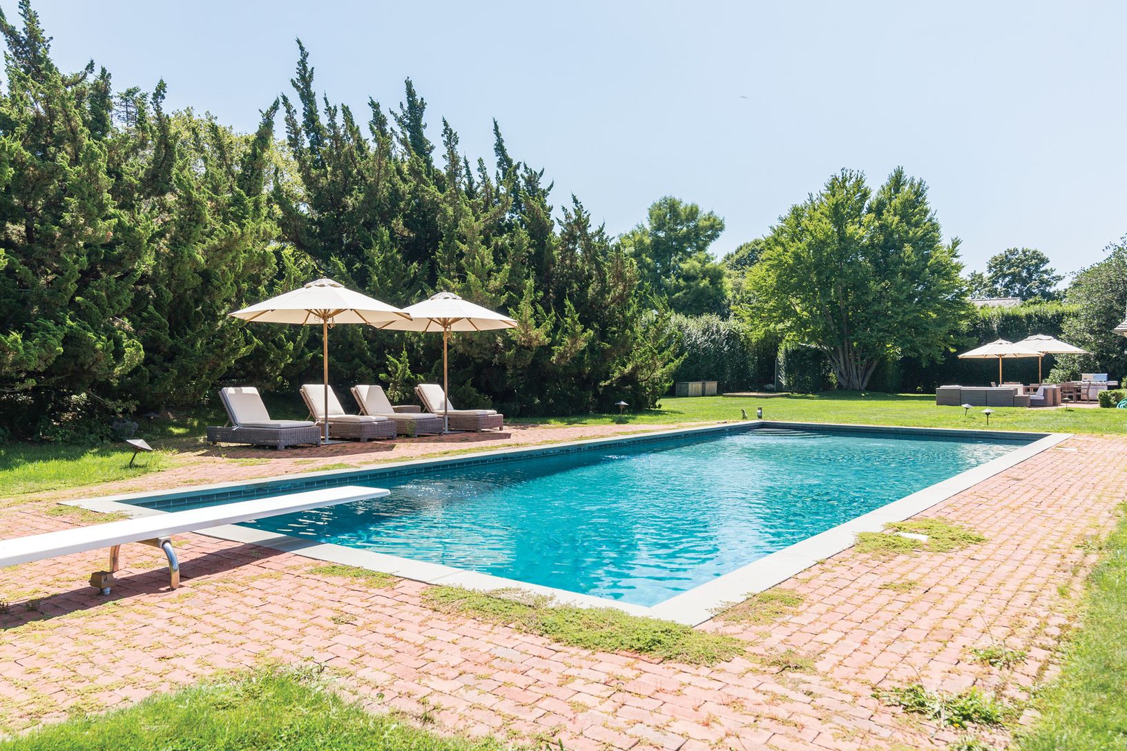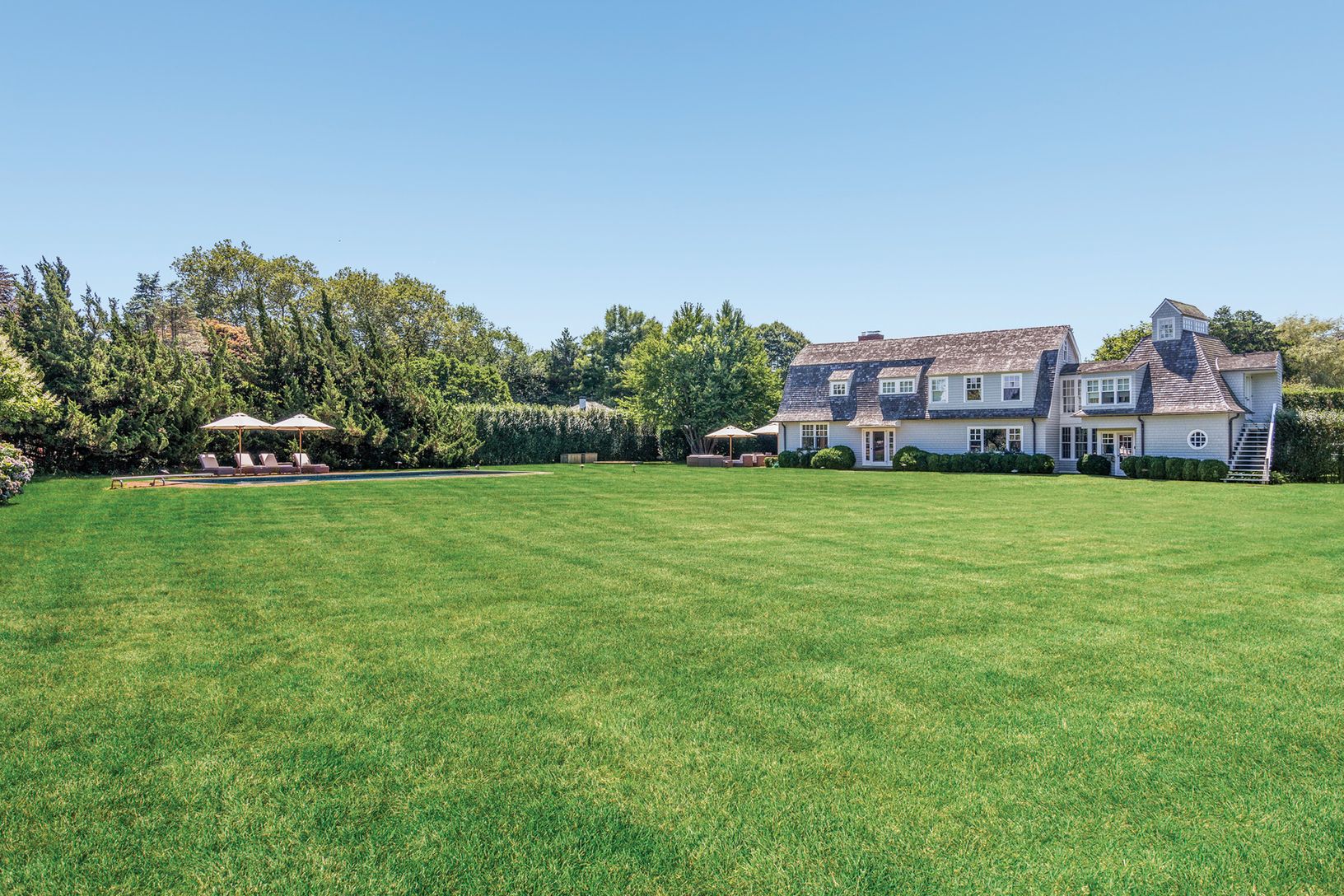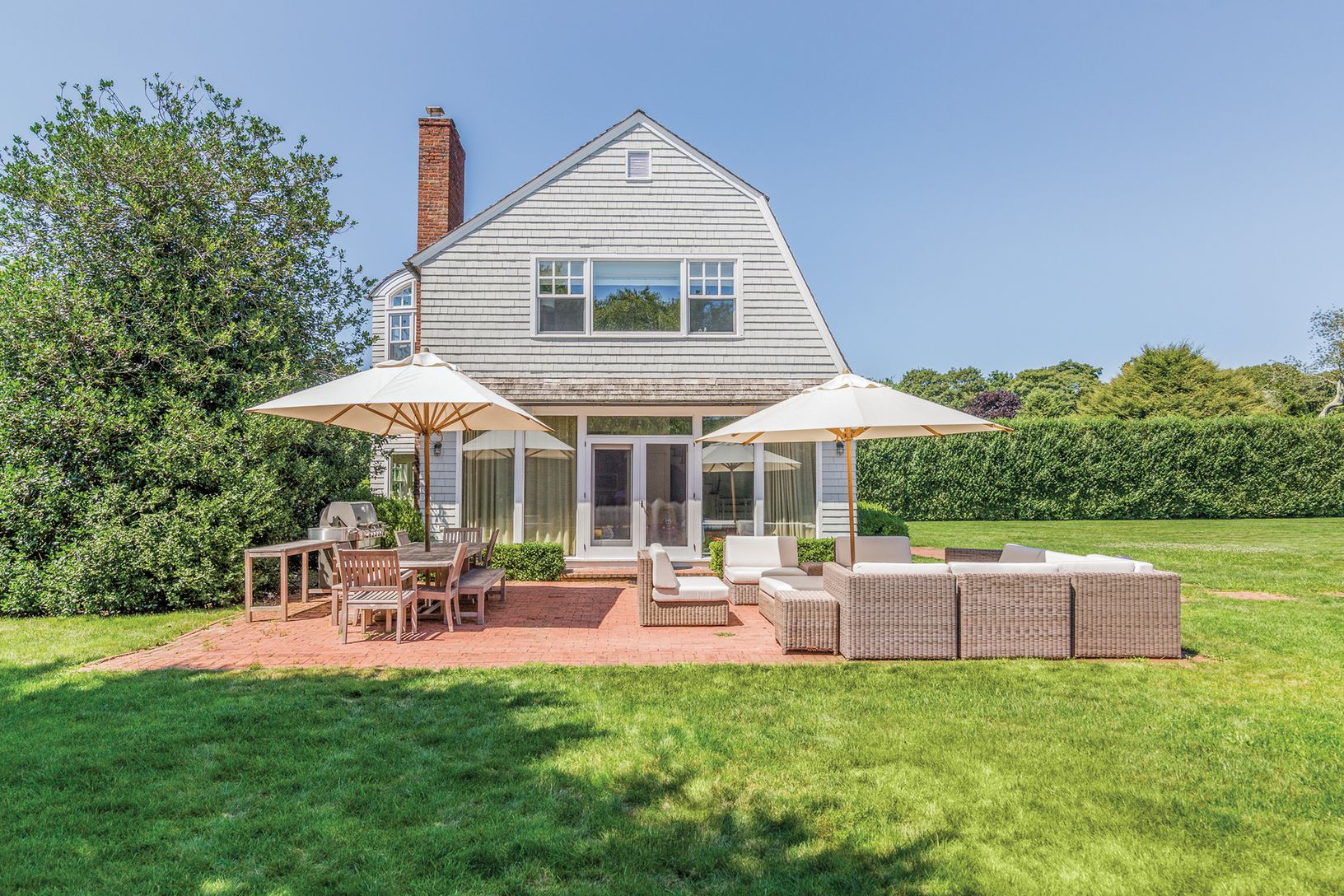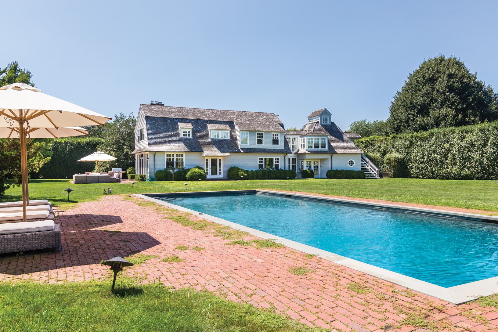 Spend the summer by the beach in East Hamptons famed estate section. This five bedroom, three and a half bath home is located on an expansive property at the end of a long drive way just a block off Lily Pond Lane. Soak in the sun before cooling off in the oversized, heated gunite pool or relax and barbecue on the patio after a long day at the beach. There's plenty of room for games on the huge manicured back lawn, all of which is surrounded b