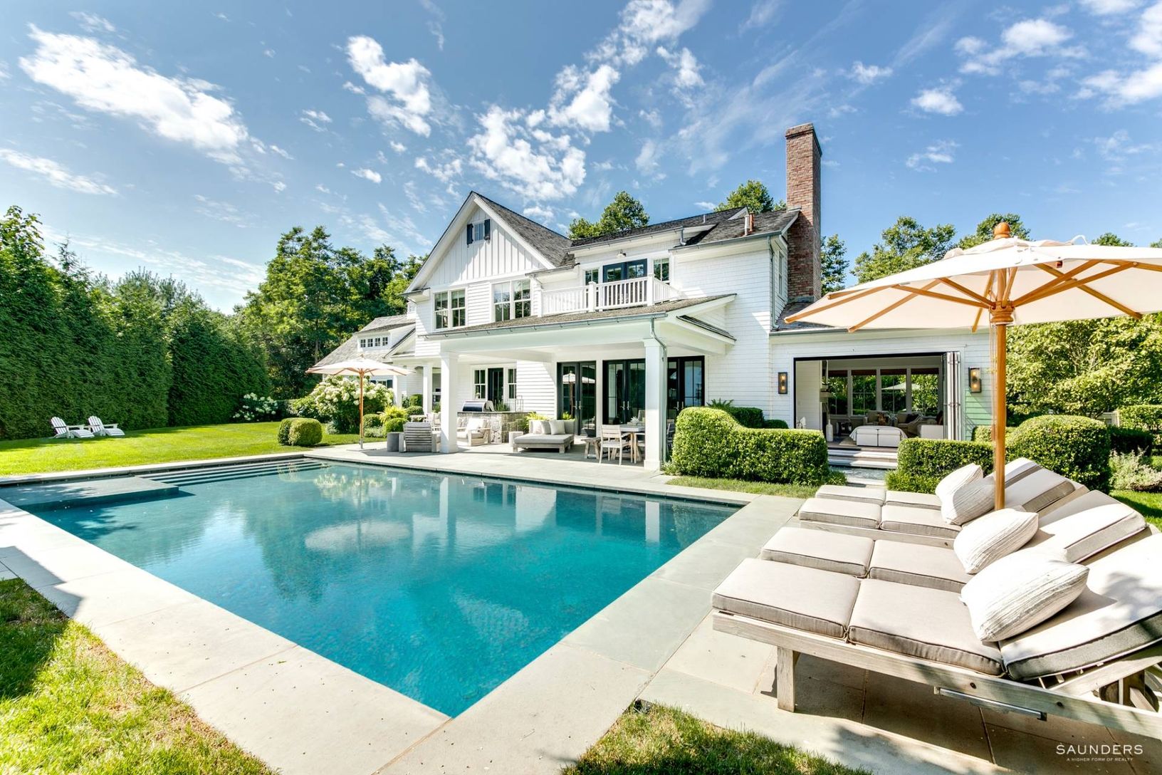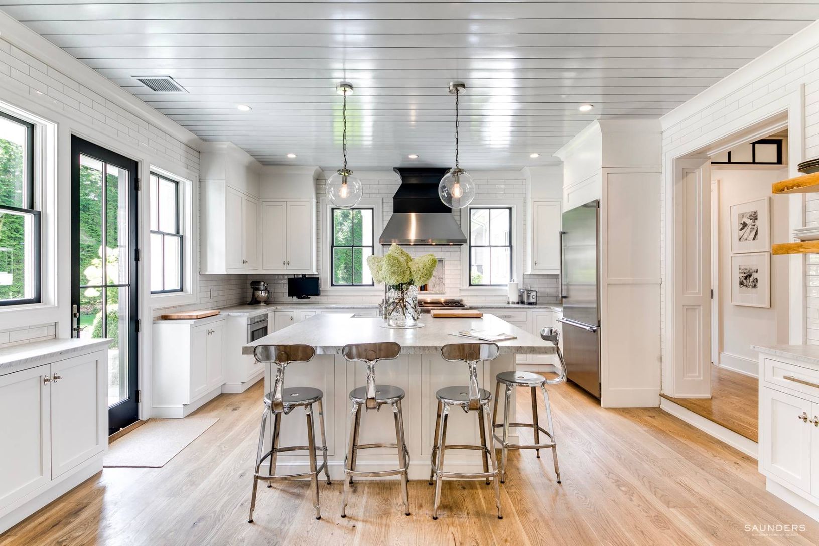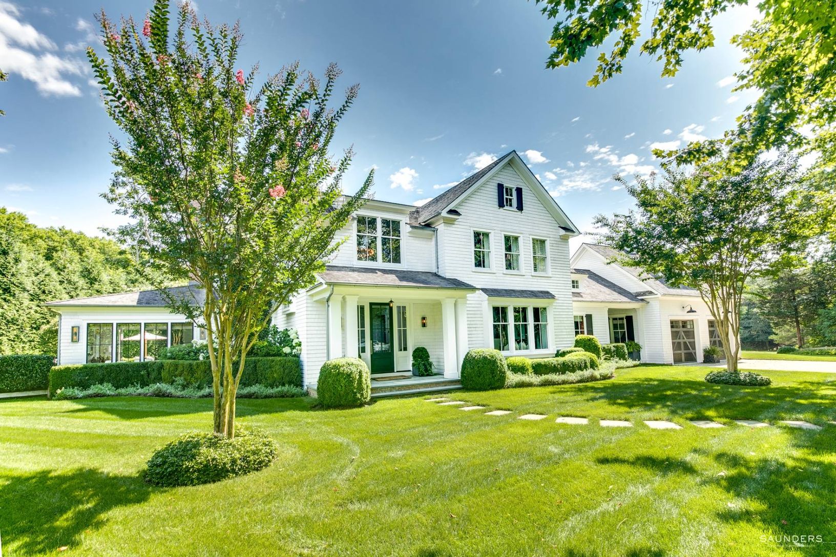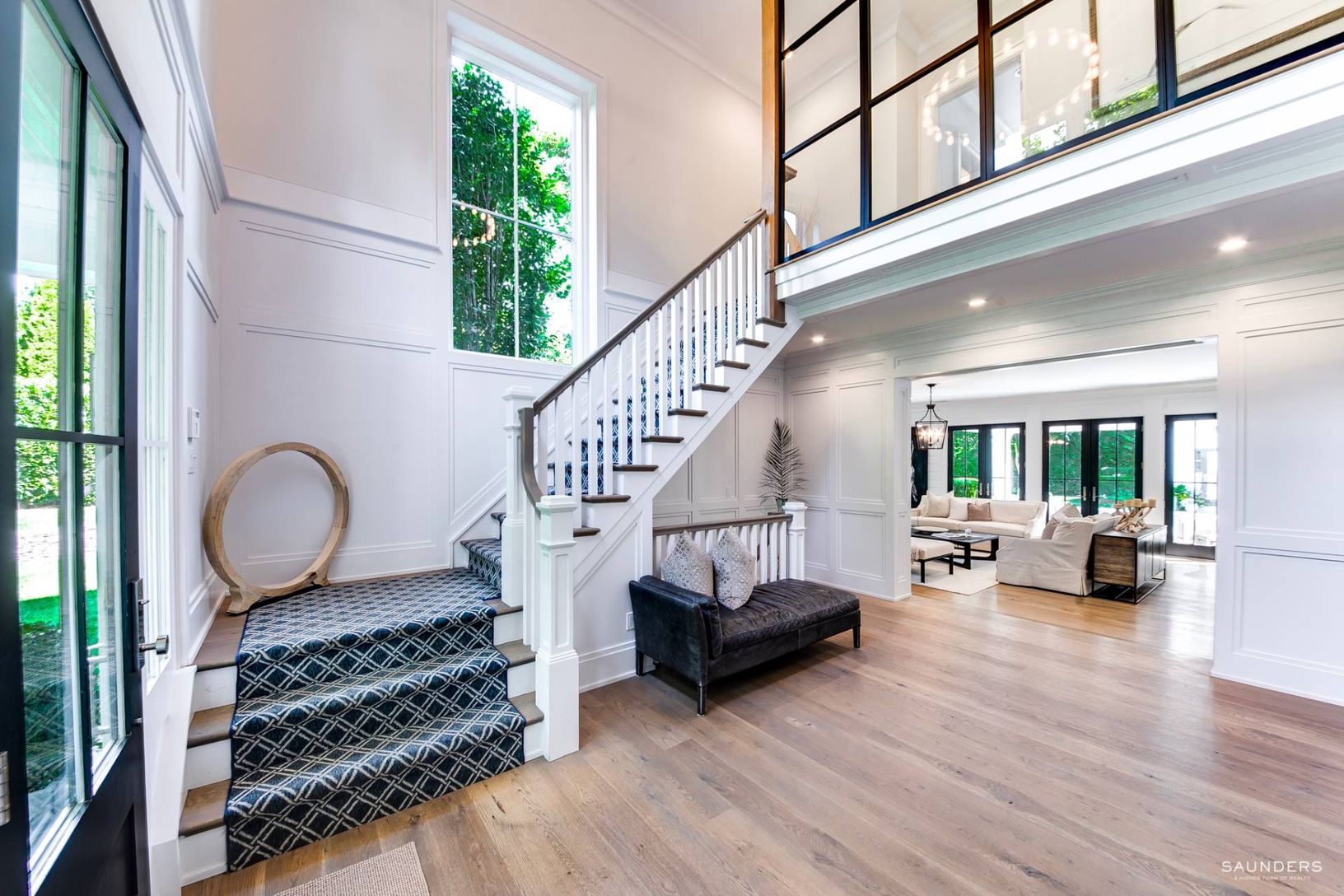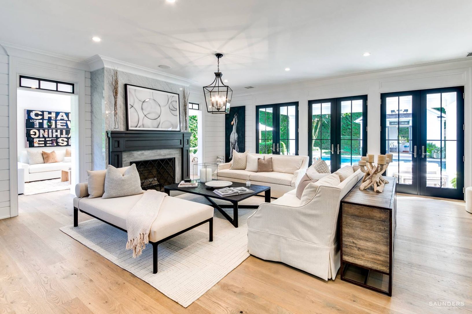 This custom built modern farmhouse-style home has all the well-heeled amenities and accoutrements one could want while also being very close to the Village of East Hampton. Located at the end of a cul-de-sac, this 4800+ sq.ft. residence features five bedrooms five and half baths, formal living & dining rooms, an eat-in gourmet kitchen, a separate office with ensuite bath, as well as a finished lower level that houses a gym and wine cellar.