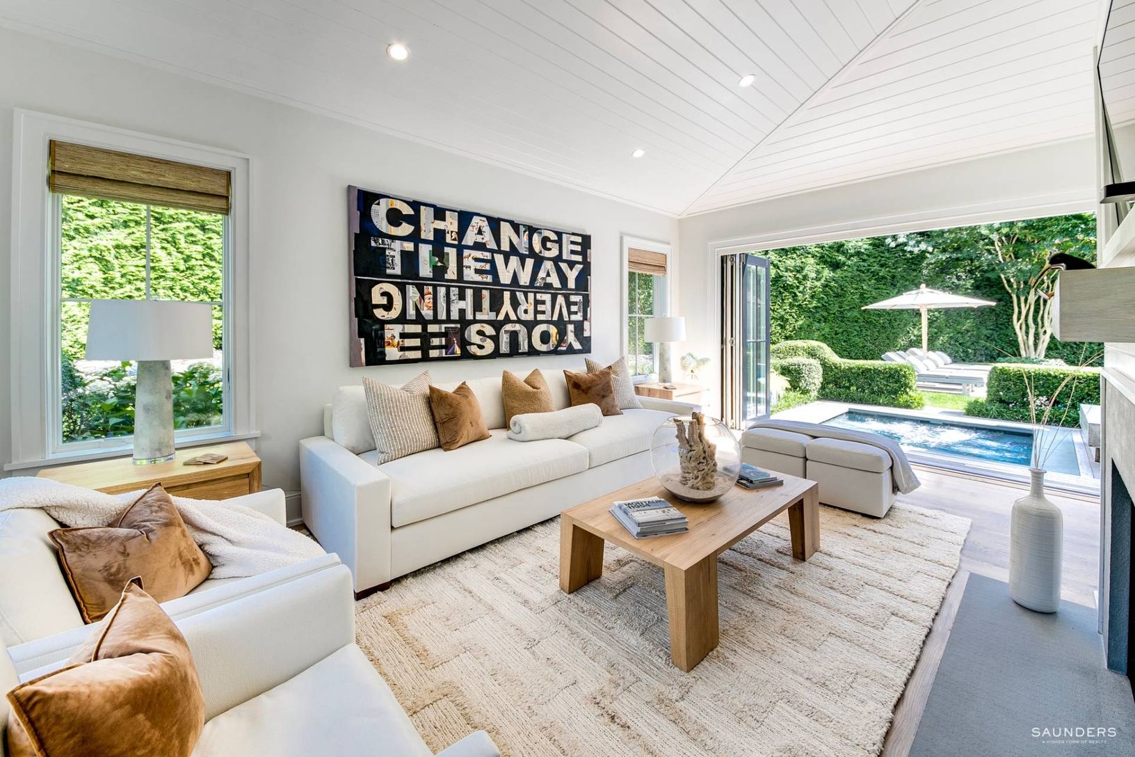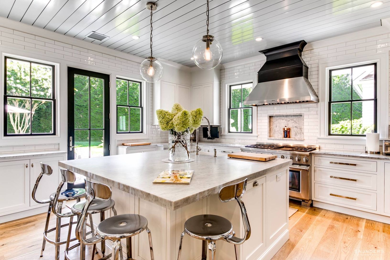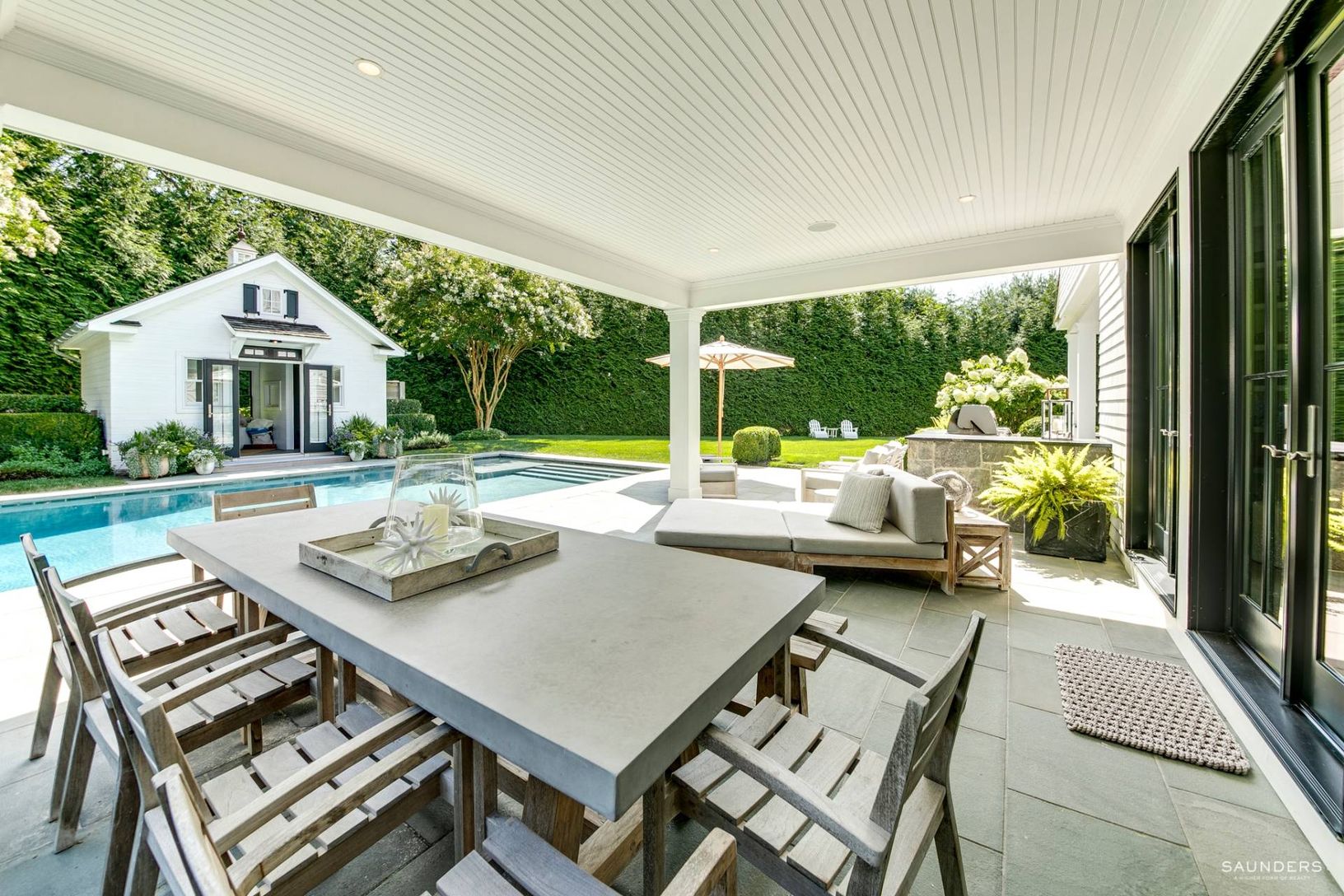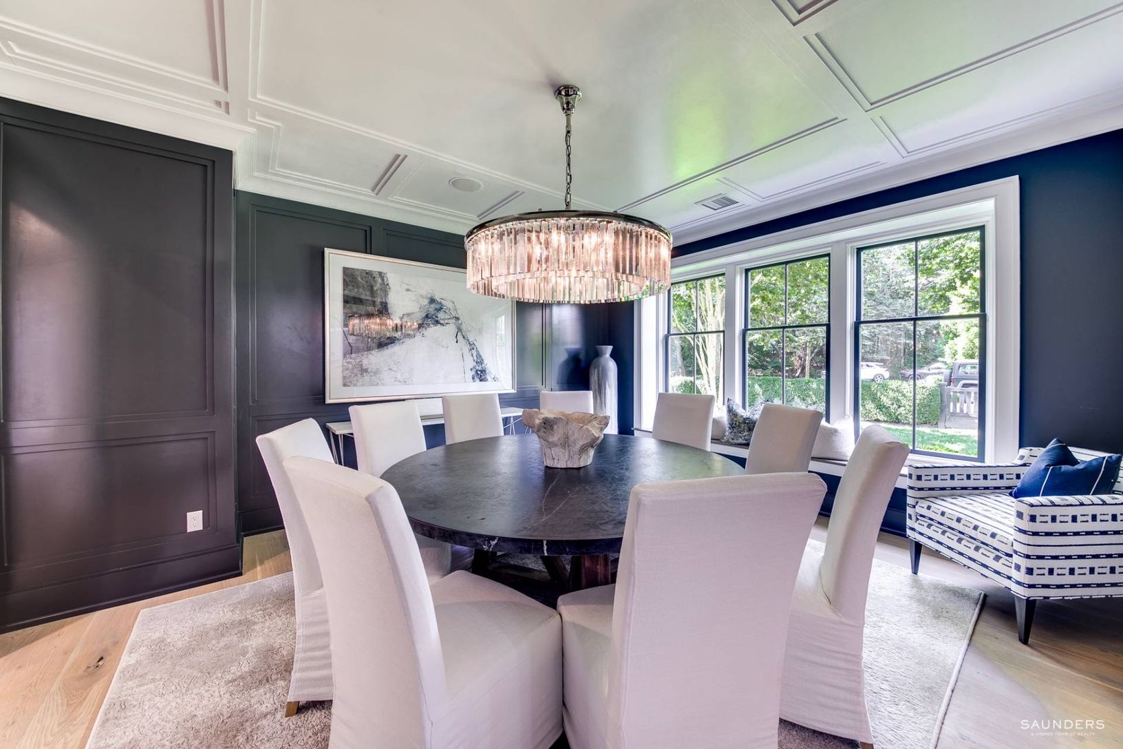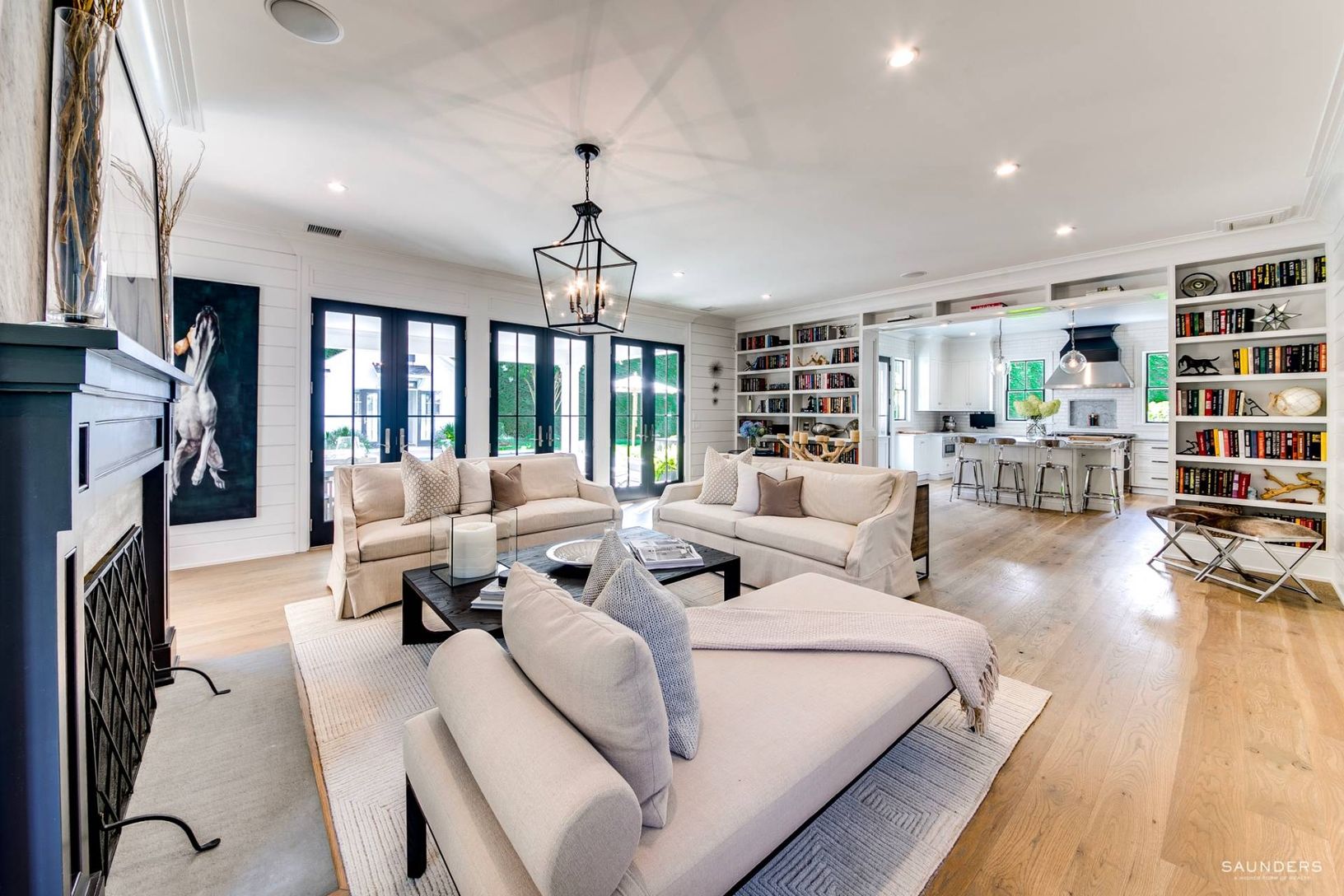 This custom built modern farmhouse-style home has all the well-heeled amenities and accoutrements one could want while also being very close to the Village of East Hampton. Located at the end of a cul-de-sac, this 4800+ sq.ft. residence features five bedrooms five and half baths, formal living & dining rooms, an eat-in gourmet kitchen, a separate office with ensuite bath, as well as a finished lower level that houses a gym and wine cellar.