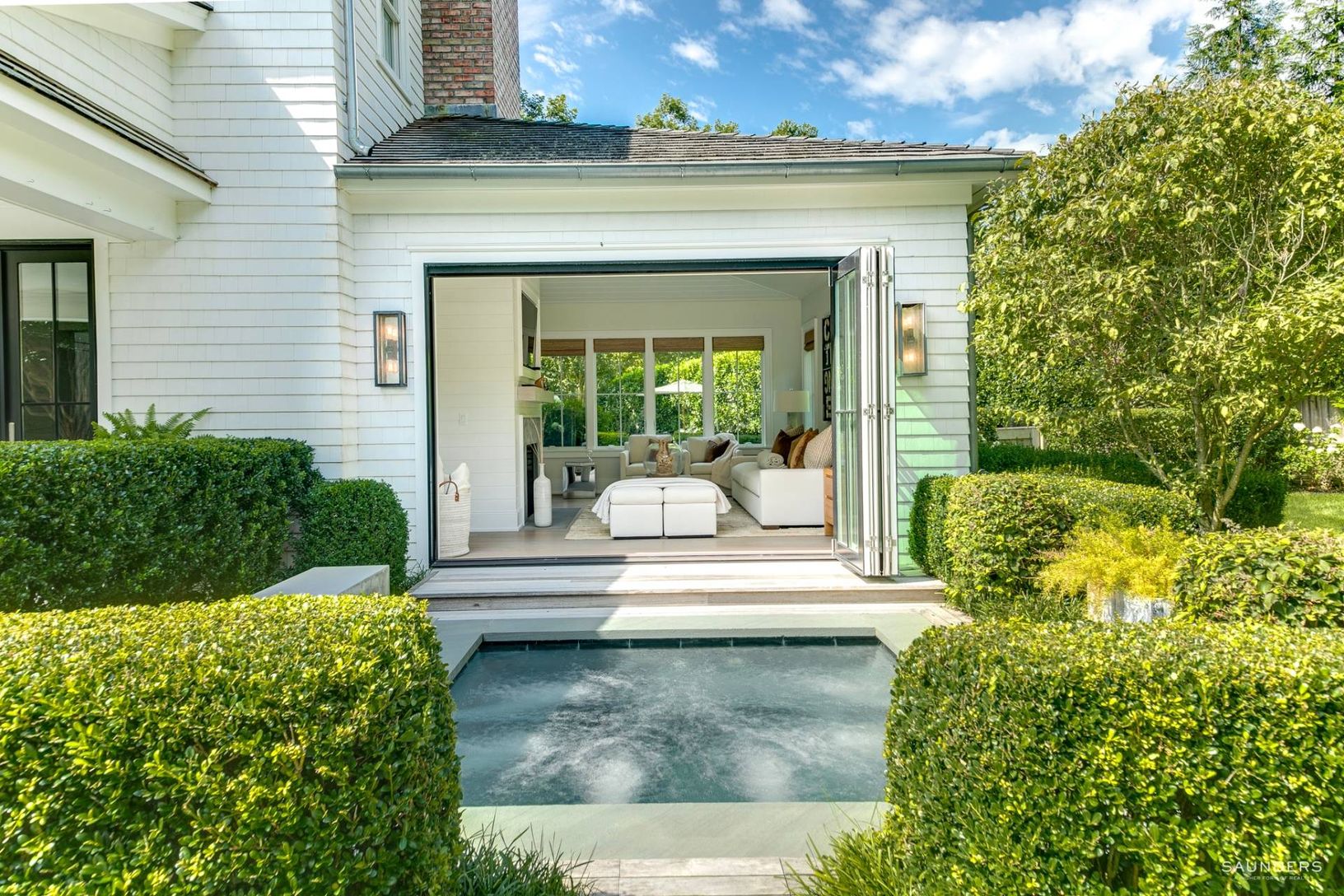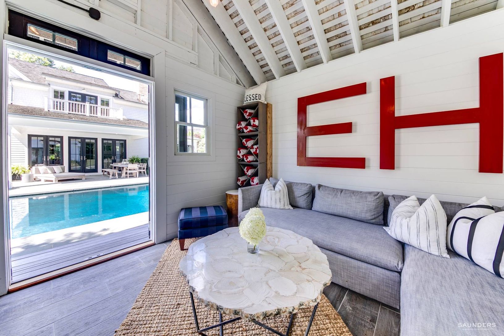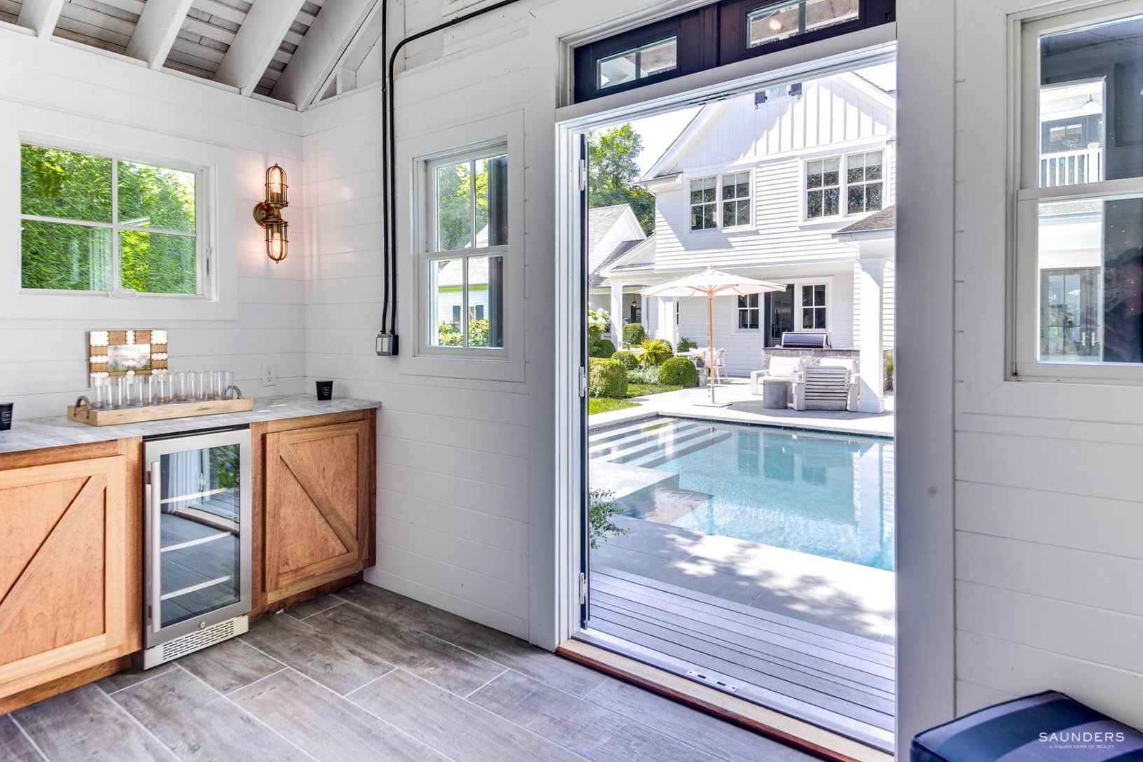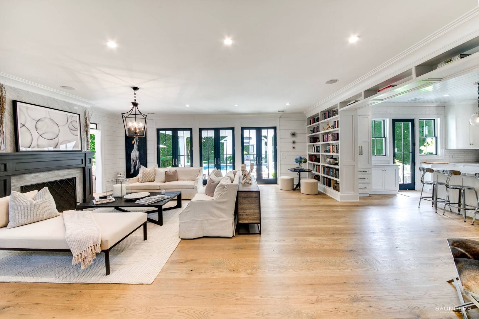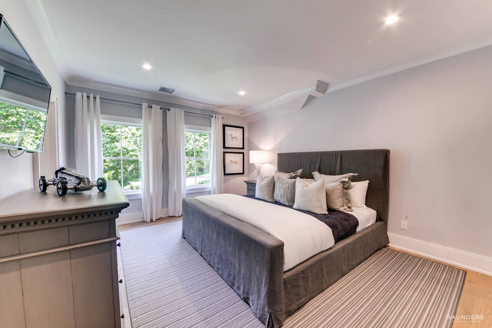 This custom built modern farmhouse-style home has all the well-heeled amenities and accoutrements one could want while also being very close to the Village of East Hampton. Located at the end of a cul-de-sac, this 4800+ sq.ft. residence features five bedrooms five and half baths, formal living & dining rooms, an eat-in gourmet kitchen, a separate office with ensuite bath, as well as a finished lower level that houses a gym and wine cellar.