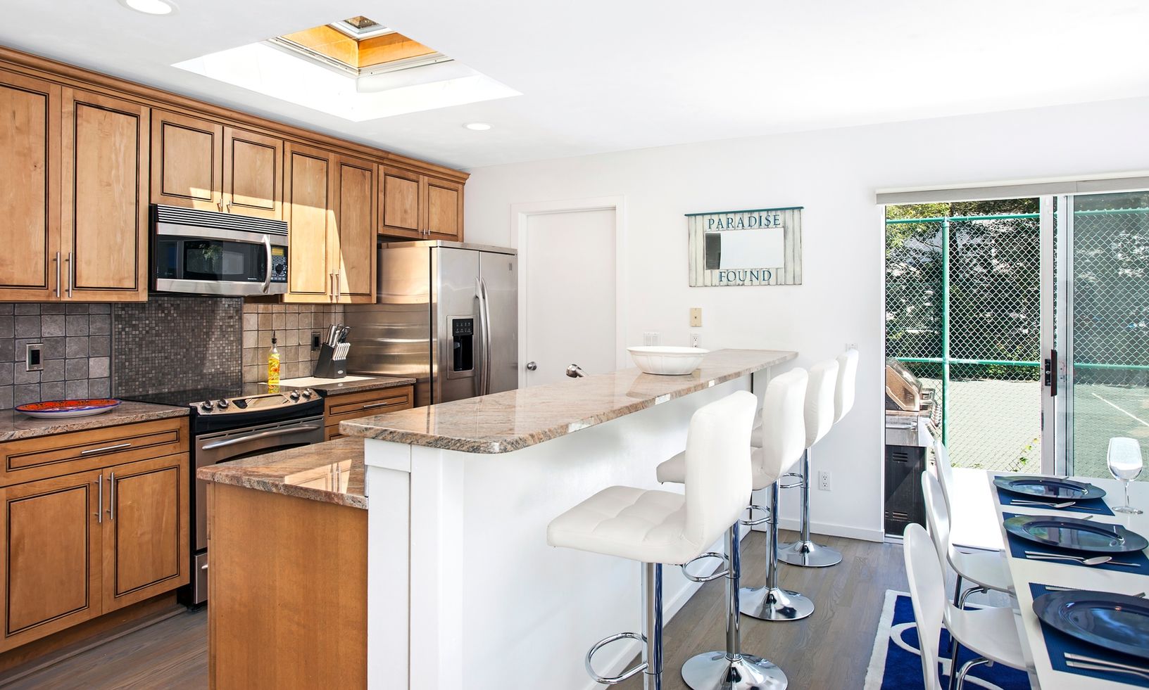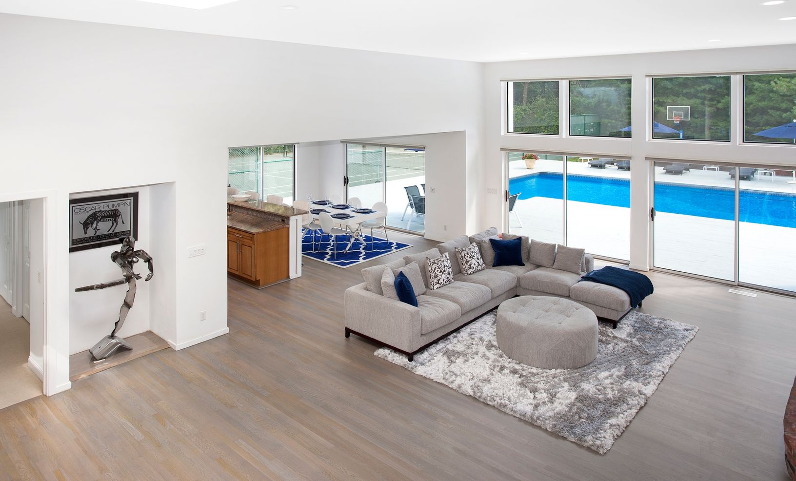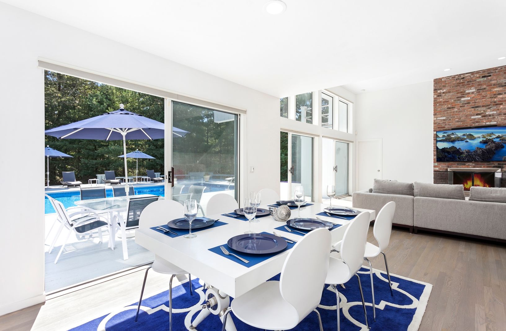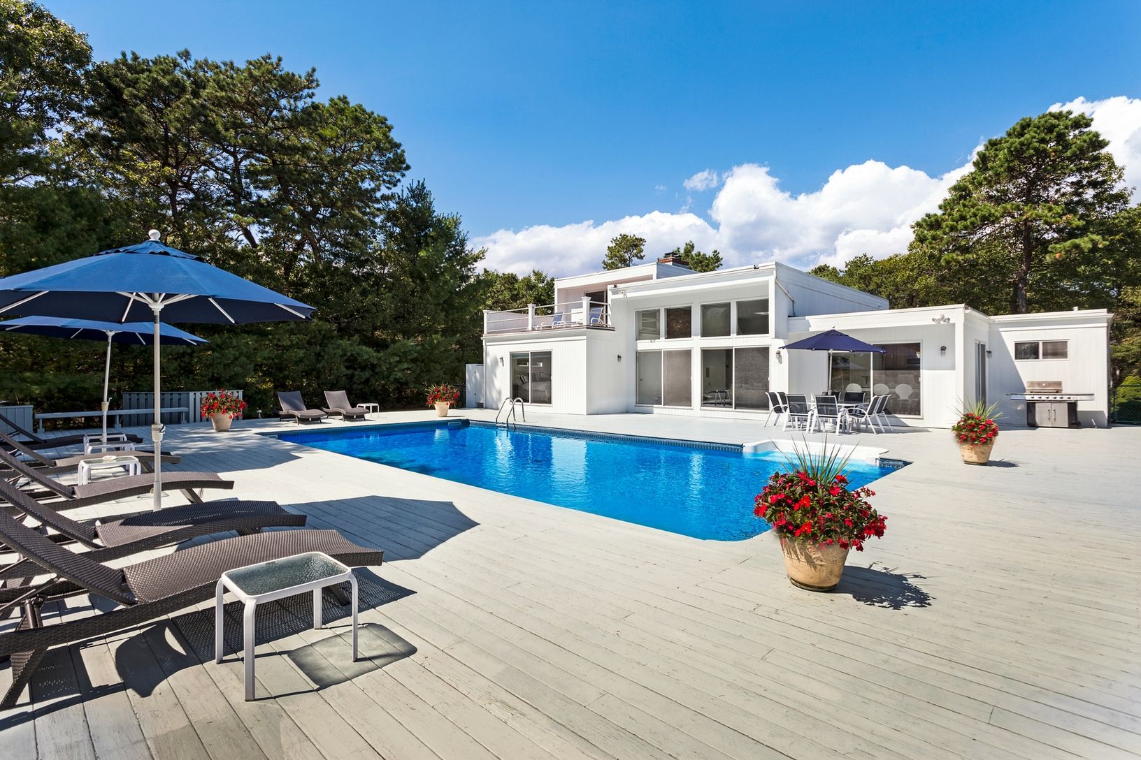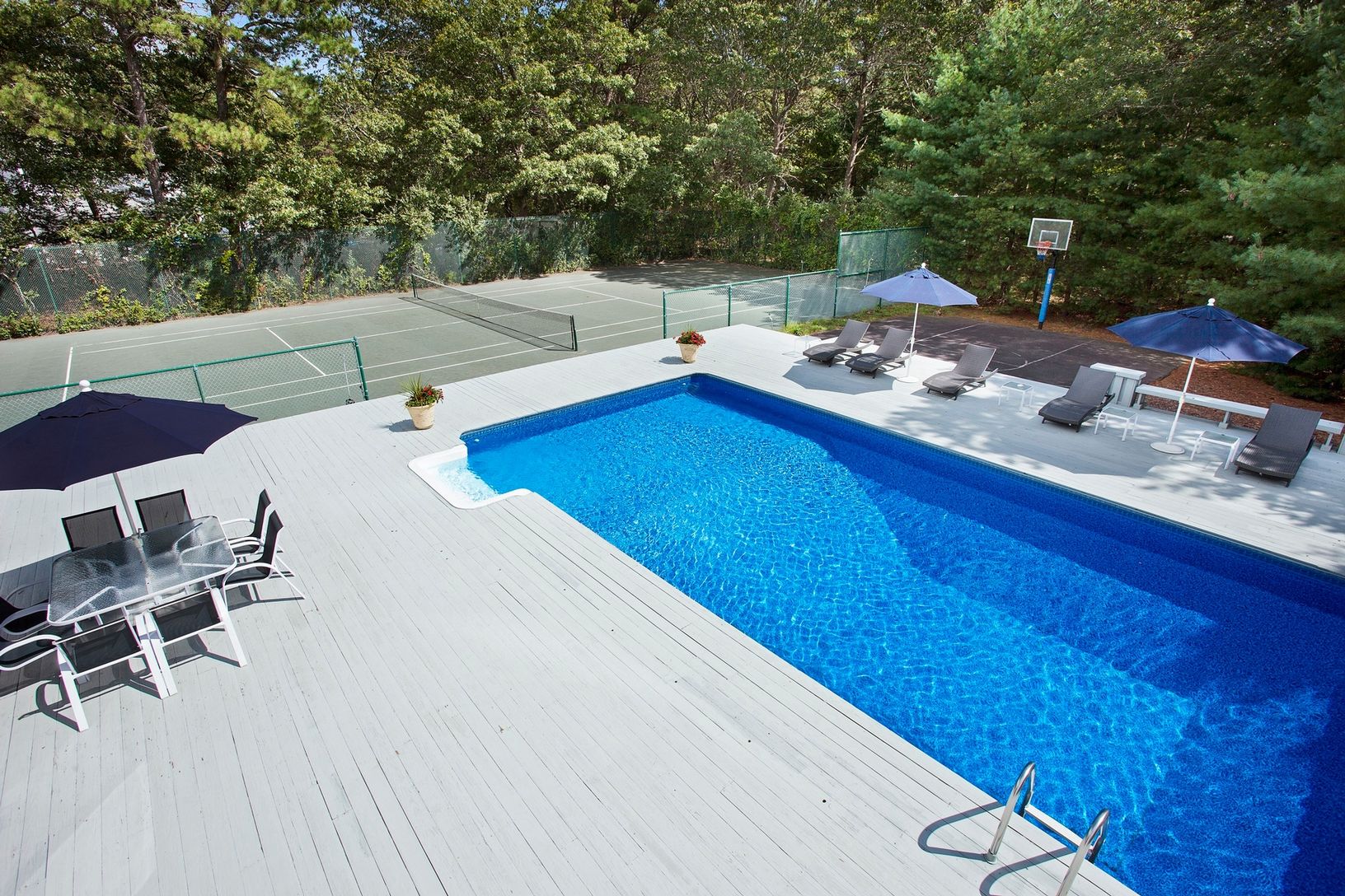 The open floor plan of this spacious, renovated contemporary is filled with natural light & modern touches. An updated kitchen with steel appliances & granite counters, large dining area & great room with a wood burning fire place - all overlooking a large deck with a heated, inground pool, har-tru tennis court & basket ball court. With 6 bedrooms and 4.5 baths, this home is perfect for entertaining family & friends.