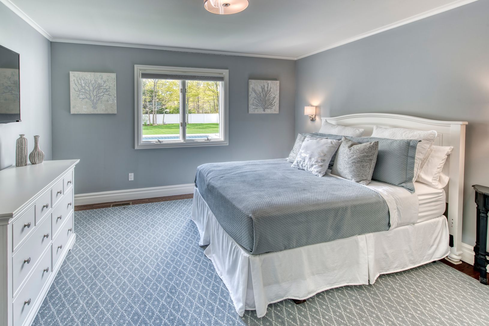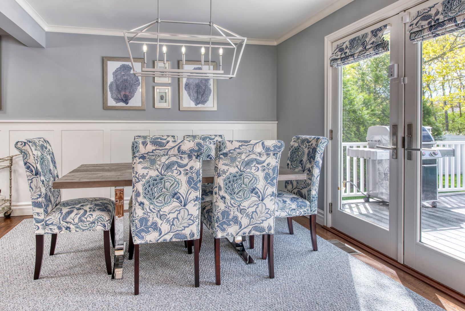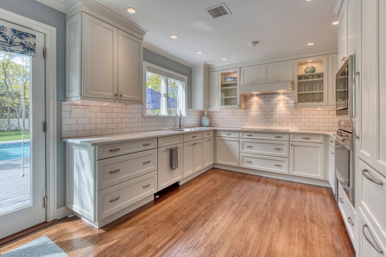 This amazing Summer rental home offers three bedrooms and three bathrooms with wood floors throughout, providing a comfortable and inviting space. The kitchen is gorgeous, equipped with top-of-the-line appliances and ample space for cooking and meal preparation. The formal dining room leads to an open living room with a fireplace and cathedral ceilings, perfect for relaxing and unwinding after a long day. The outdoor space is equally impressiv