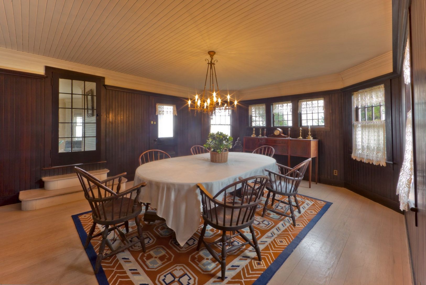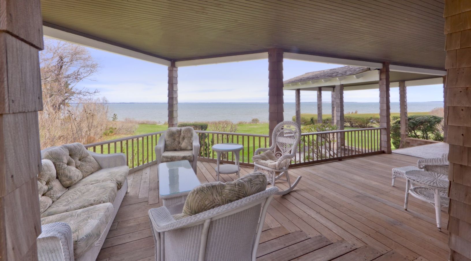 Authentic Traditional, set on under an acre of true bay frontage, high on a bluff, with expansive, lush lawn to Great Peconic Bay. With a wood shingle porte-cochere, wrap-around porch affording magnificent 240 degree views south, north and east to Robins Island and the North Fork, this special, traditional Victorian Lady (c.1880) has retained her integrity with custom ,new upstairs windows, 3 fireplaces, spacious living room with fireplace