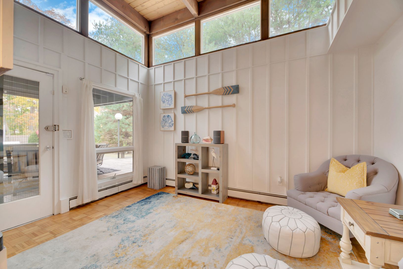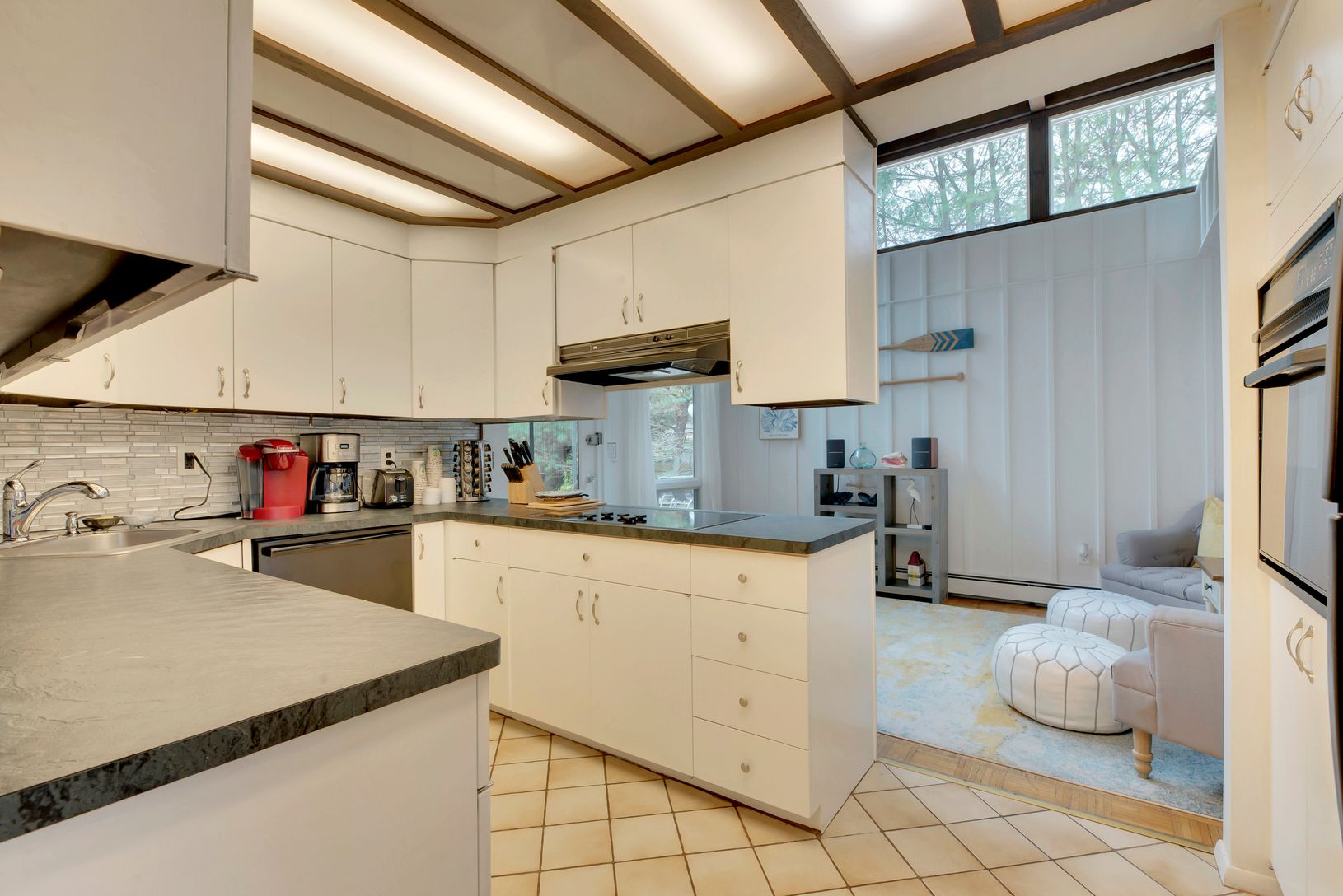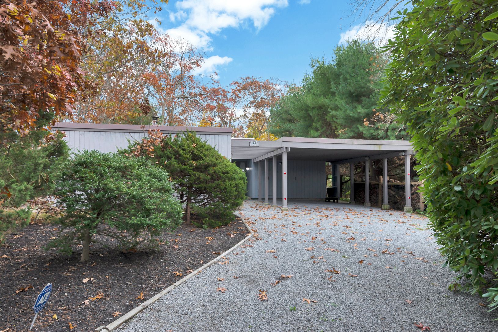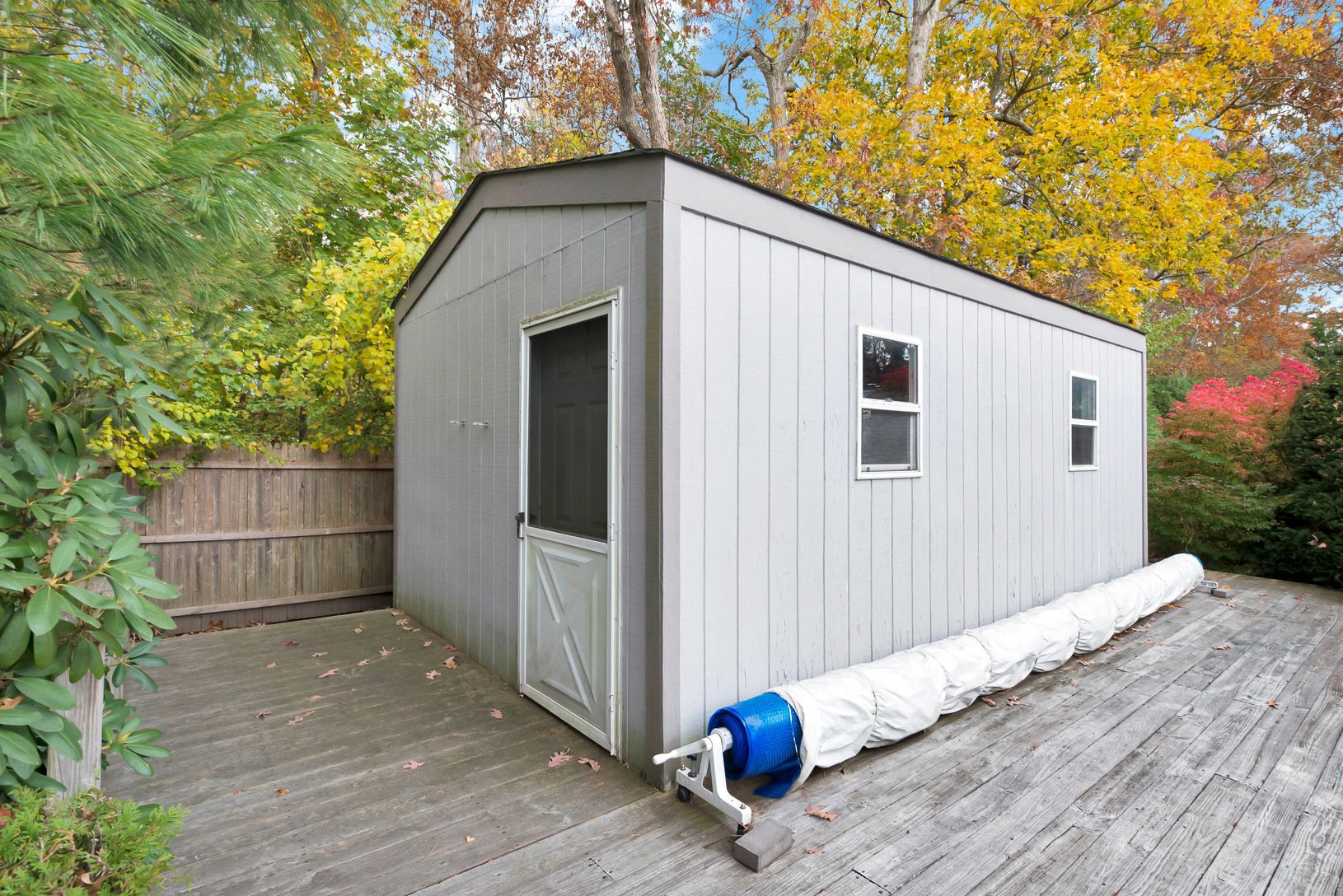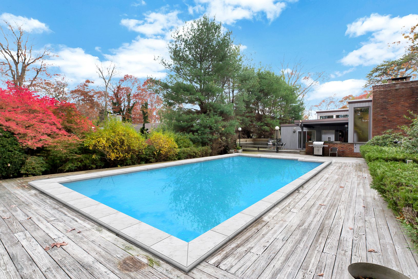 Welcome to this Mid Century Modern Home with vaulted ceilings in the living and dining area, floor to ceiling brick fireplace and sliders to a spacious deck. All on one level for easy Hampton's living! This very unique style offers a generous primary suite and two guest rooms with a hallway bath to share. Centrally located kitchen with a very quaint office/breakfast/sitting area overlooking back deck and heated pool. Acessory storage building,