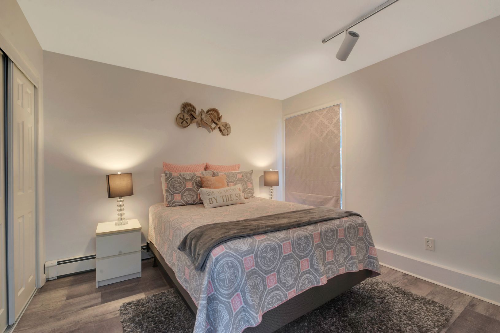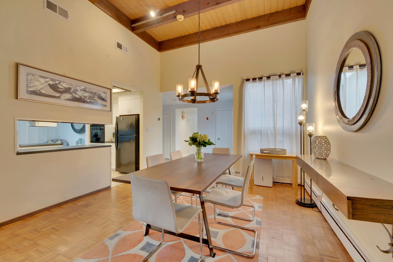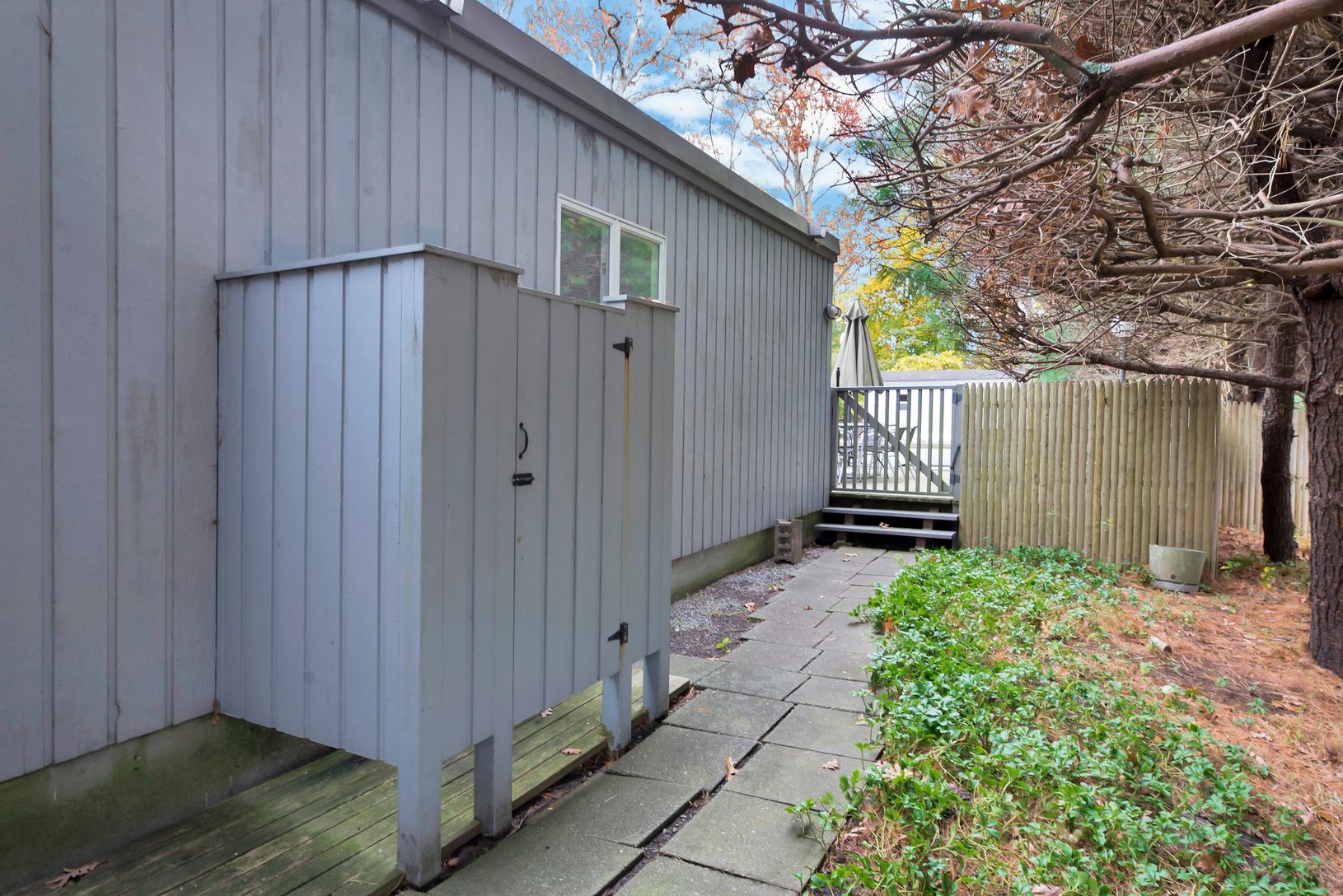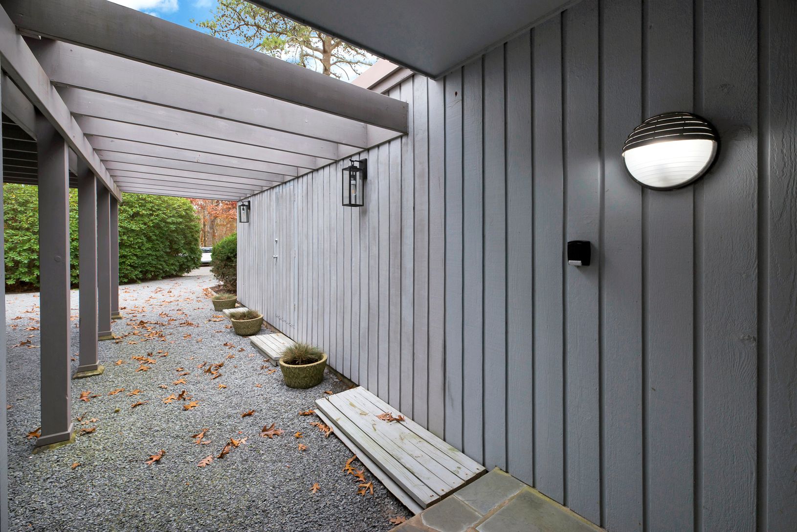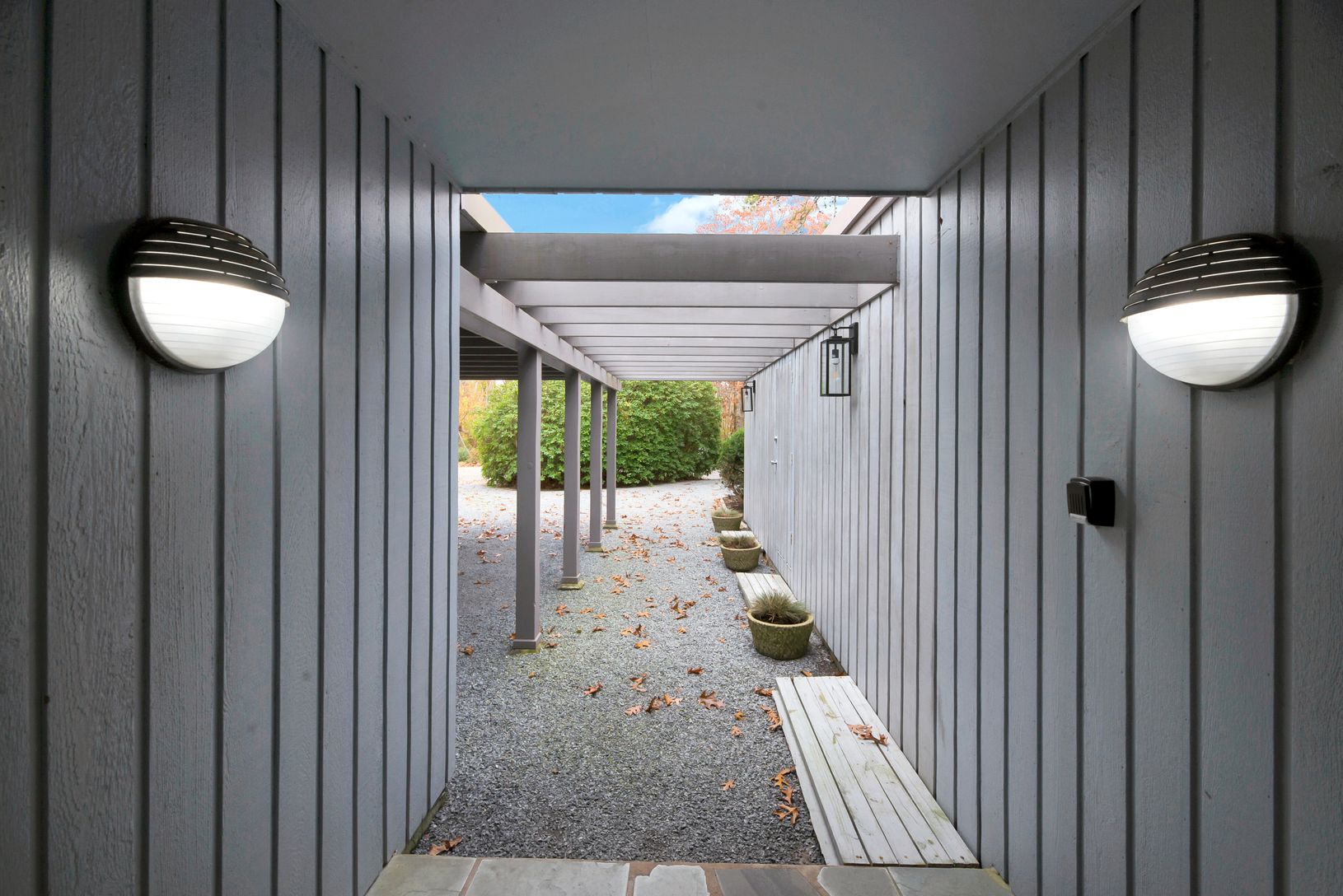 Welcome to this Mid Century Modern Home with vaulted ceilings in the living and dining area, floor to ceiling brick fireplace and sliders to a spacious deck. All on one level for easy Hampton's living! This very unique style offers a generous primary suite and two guest rooms with a hallway bath to share. Centrally located kitchen with a very quaint office/breakfast/sitting area overlooking back deck and heated pool. Acessory storage building,