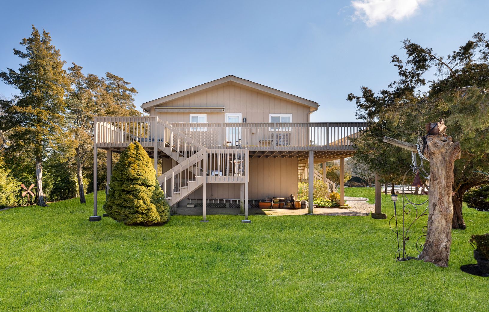 Spacious mid-century modern-style home with forever water views, private beach and launch areas, and with room for a pool. Built for maximum scenic enjoyment, the upside-down architecture takes best advantage of Tiana Bay and beyond from multiple interior spaces-- including the great room, kitchen and bedrooms--and also affords a picturesque panorama from the 588-square-foot second-story deck. Additional amenities include central air, fireplac
