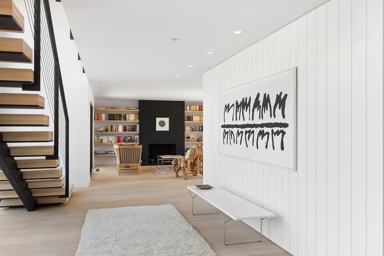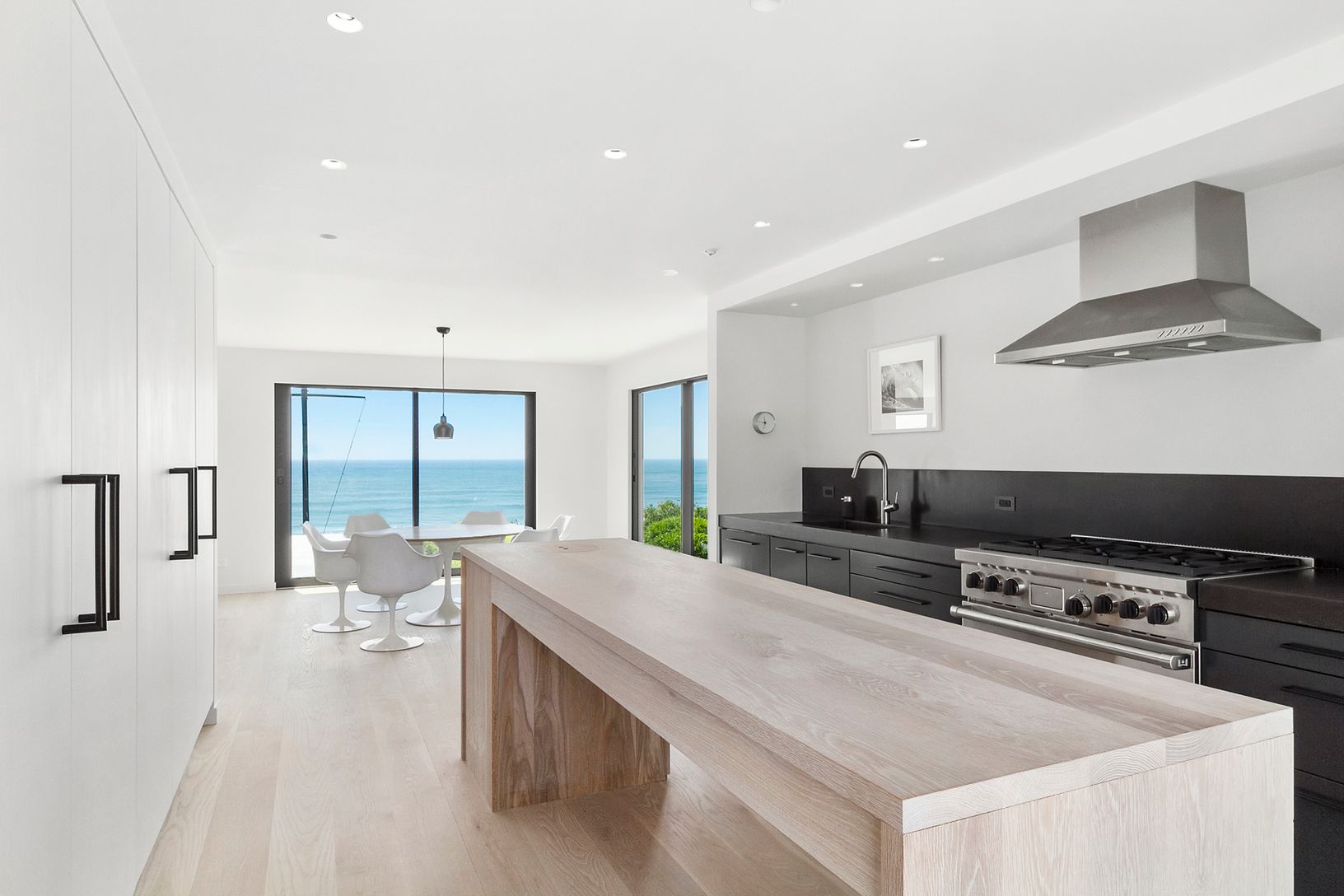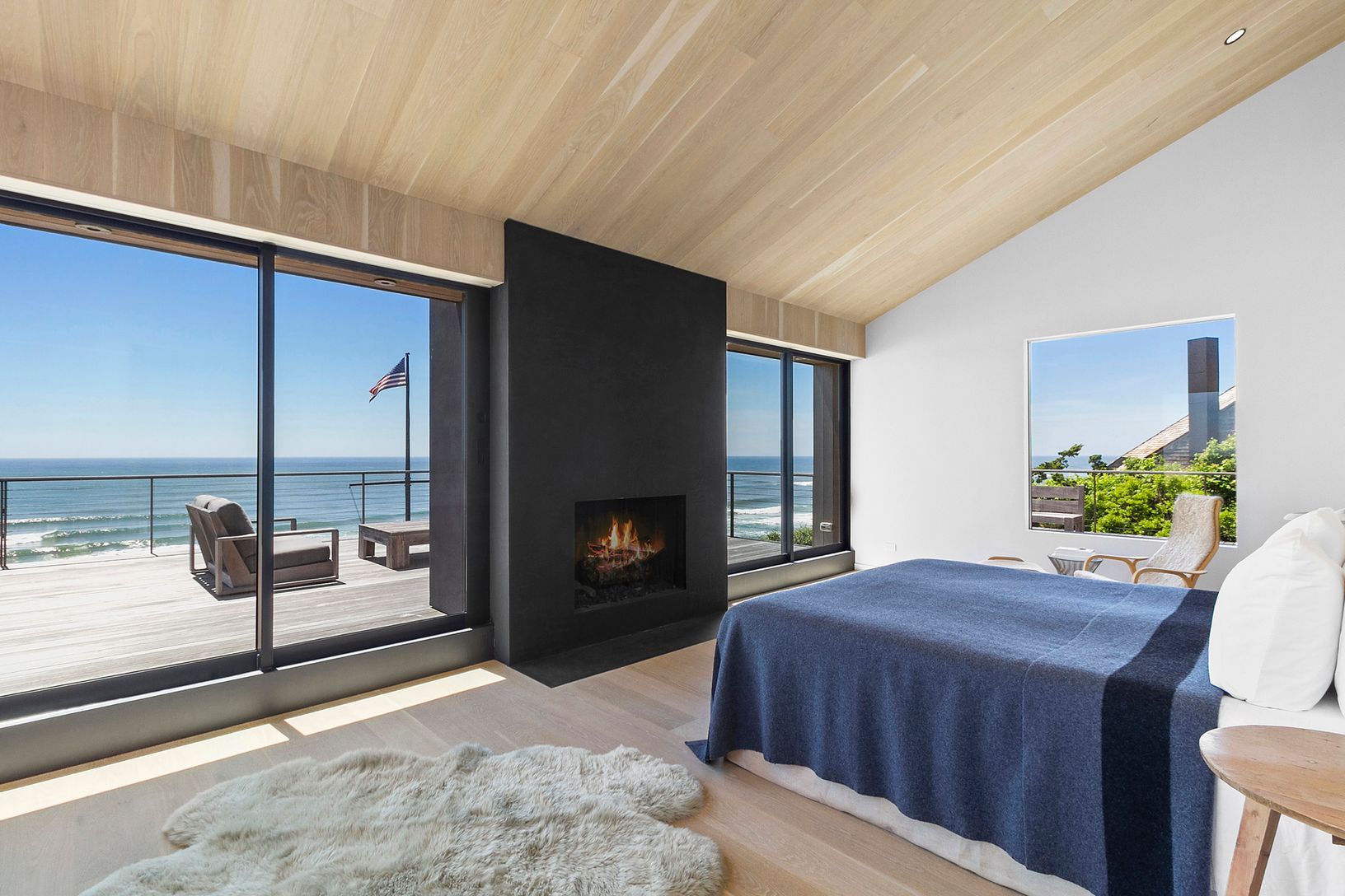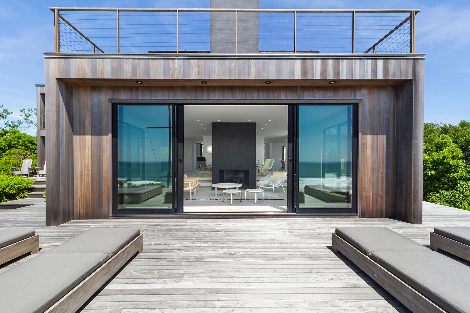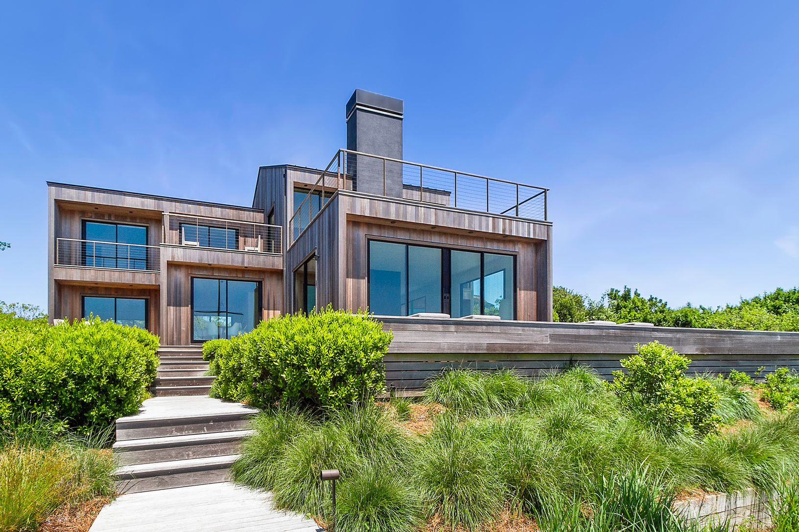 This modern Montauk beach house, completely rebuilt in 2016 by Men at Work Construction with Robert Young Architect, sits high on the bluffs with exceptional 360 degree views and privacy.