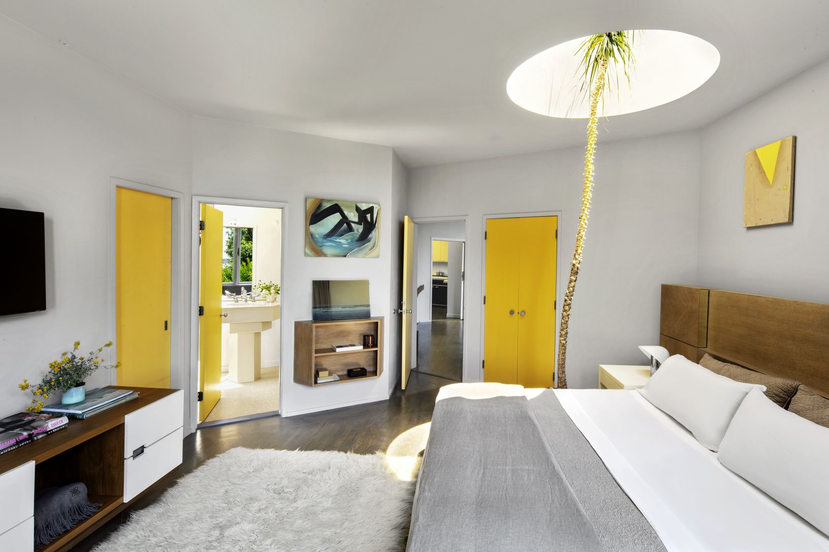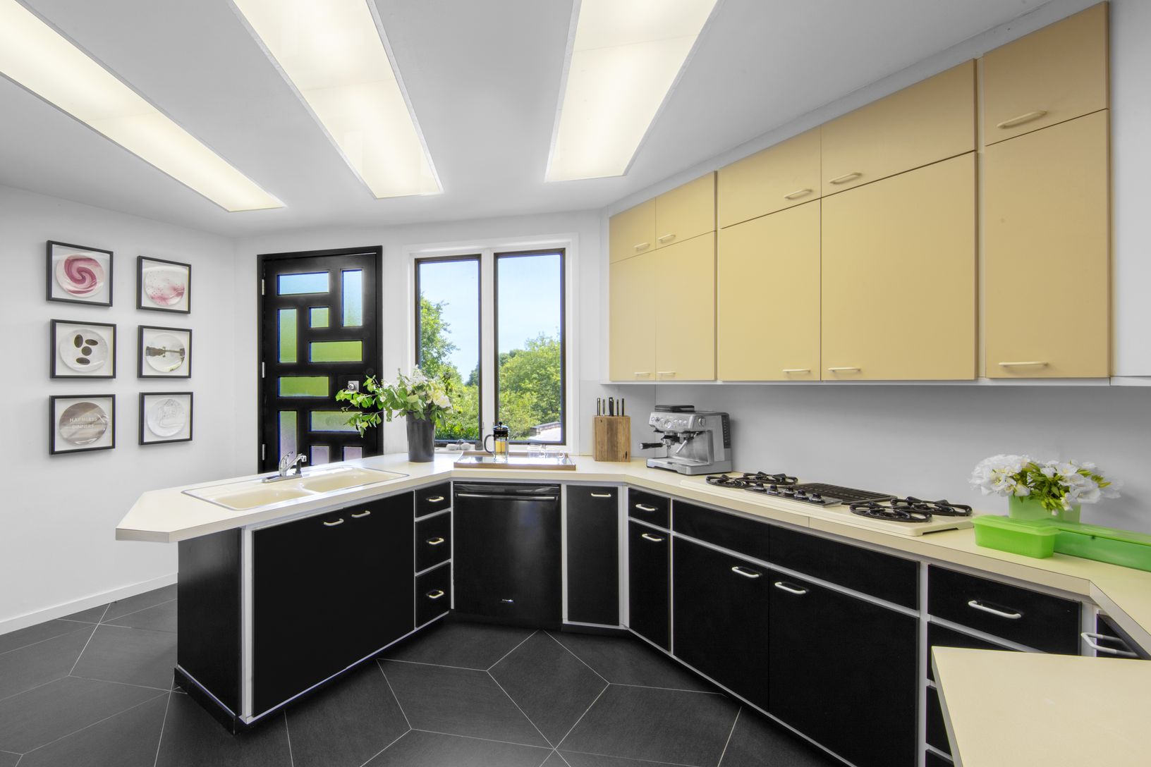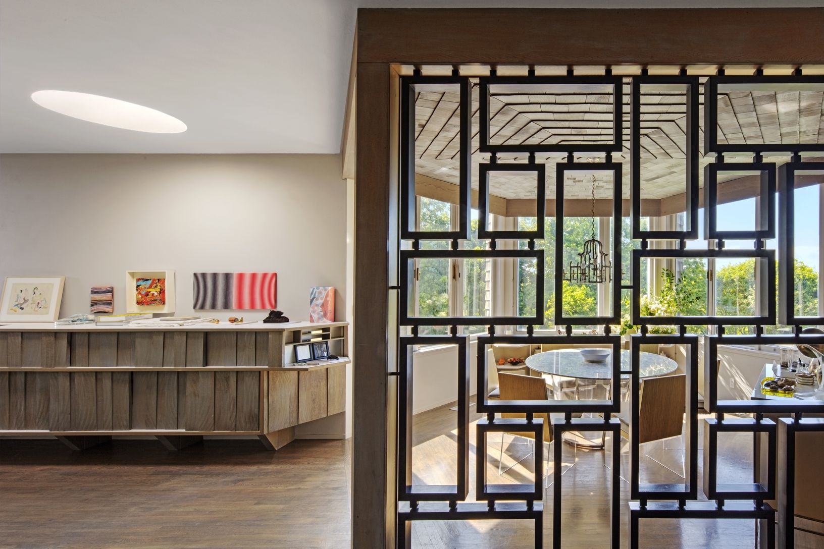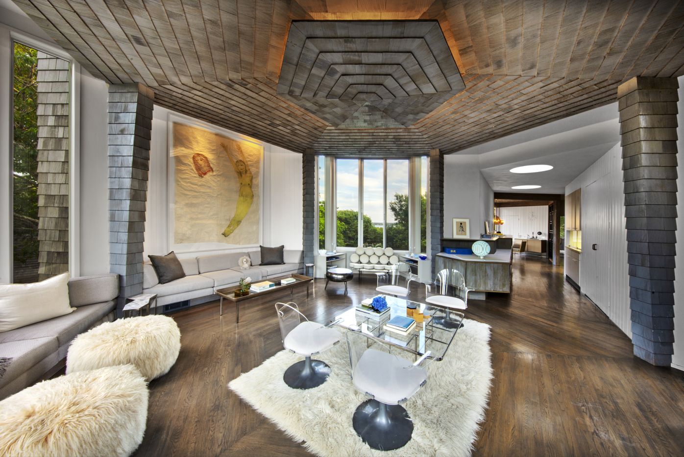 This stunning one-of-a-kind home was designed by the legendary George Nelson and sits atop a hill on nearly an acre of land backing up to Montauk Point State Park. It boasts breathtaking 360-degree views of Lake Montauk, Long Island Sound, Big Reed Pond, and the Atlantic Ocean. The mid-century modern masterpiece consists of connected hexagonal shapes in various sizes forming a unique structure. Illuminated skylights provide a natural glow at n